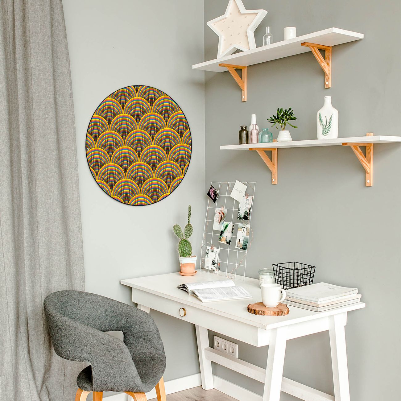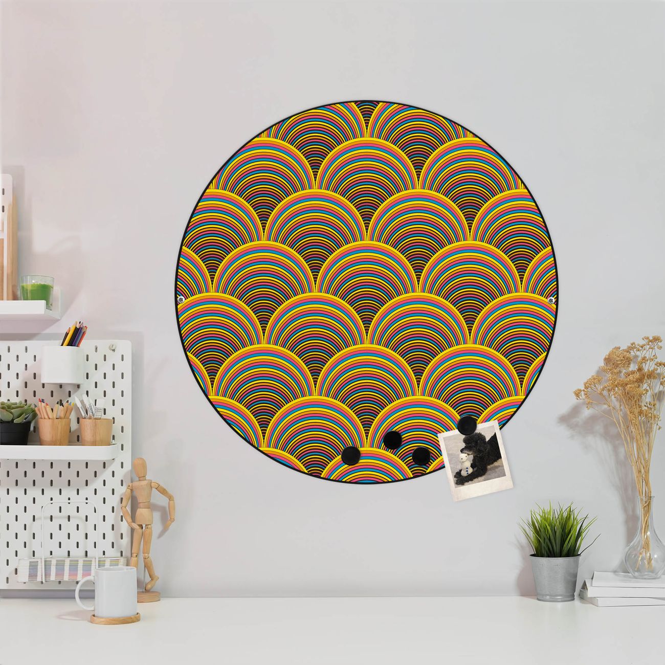 FUNKTION / DESIGN Die banjado Magnettafel mit dem Motiv Motiv Regenbögen bringt Ordnung in Ihr Zettelchaos. Fotos, Termine, Notizen oder Rezepte lassen Sich hier stilvoll mit Magneten ordnen, Sie behalten alles im Blick. Die Design Magnetwand ist beschreibbar und wieder abwischbar. Mit dieser Pinnwand haben Sie auch ohne Notizen und Magneten ein schönes Dekoelement. Das Format bietet Ihnen ausreichend Platz um alle wichtigen Informationen im Blick zu behalten. DETAILS / NUTZEN Die magnetische Metall Pinnwand besteht aus schwarz lackiertem Stahl. Sie hat einen Durchmesser von 47cm. Es befinden sich an den Seiten zwei vorgefertigte Löcher die eine schnelle und unkomplizierte Anbringung ermöglichen. Das Motiv ist mit einem seidenmatten Laminat versehen und schützt so zusätzlich vor Kratzern. Es halten alle handelsüblichen Magneten daran. Wir sind ein kleines Team aus dem Herzen von Sachsen. Wir fertigen alle Artikel von Hand für Sie an, Sie erhalten keine preiswerte Importware. Auf Wunsch können Sie auch Ihr eigenes Foto auf die Magnettafel aufbringen, schreiben Sie uns an.