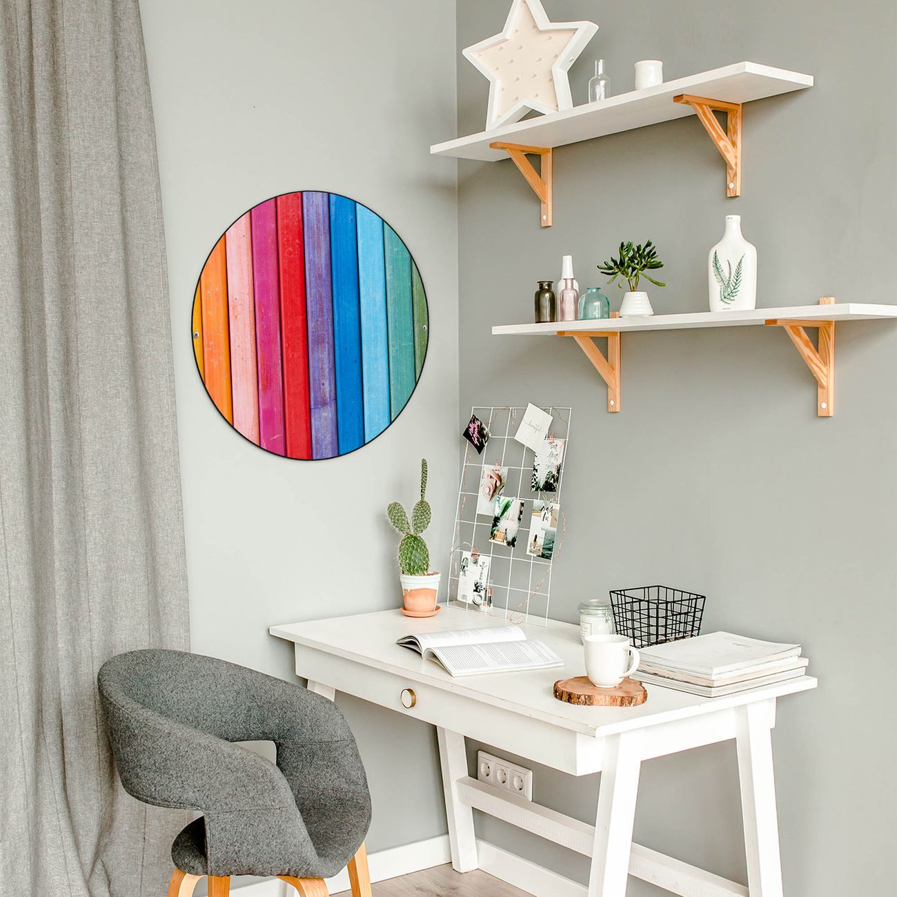 FUNKTION / DESIGN Die banjado Magnettafel mit dem Motiv Motiv Regenbogenfarben bringt Ordnung in Ihr Zettelchaos. Fotos, Termine, Notizen oder Rezepte lassen Sich hier stilvoll mit Magneten ordnen, Sie behalten alles im Blick. Die Design Magnetwand ist beschreibbar und wieder abwischbar. Mit dieser Pinnwand haben Sie auch ohne Notizen und Magneten ein schönes Dekoelement. Das Format bietet Ihnen ausreichend Platz um alle wichtigen Informationen im Blick zu behalten. DETAILS / NUTZEN Die magnetische Metall Pinnwand besteht aus schwarz lackiertem Stahl. Sie hat einen Durchmesser von 47cm. Es befinden sich an den Seiten zwei vorgefertigte Löcher die eine schnelle und unkomplizierte Anbringung ermöglichen. Das Motiv ist mit einem seidenmatten Laminat versehen und schützt so zusätzlich vor Kratzern. Es halten alle handelsüblichen Magneten daran. Wir sind ein kleines Team aus dem Herzen von Sachsen. Wir fertigen alle Artikel von Hand für Sie an, Sie erhalten keine preiswerte Importware. Auf Wunsch können Sie auch Ihr eigenes Foto auf die Magnettafel aufbringen, schreiben Sie uns an.