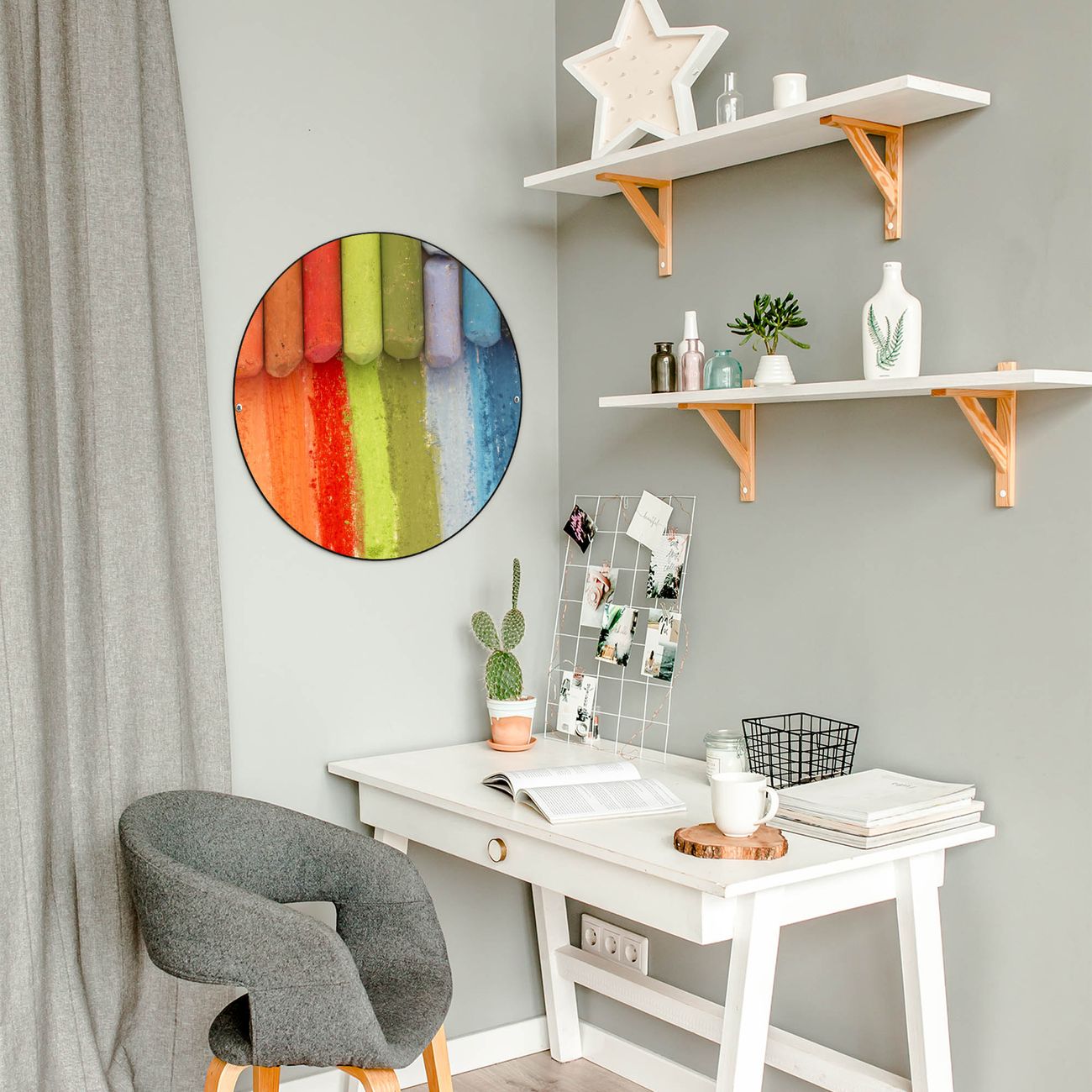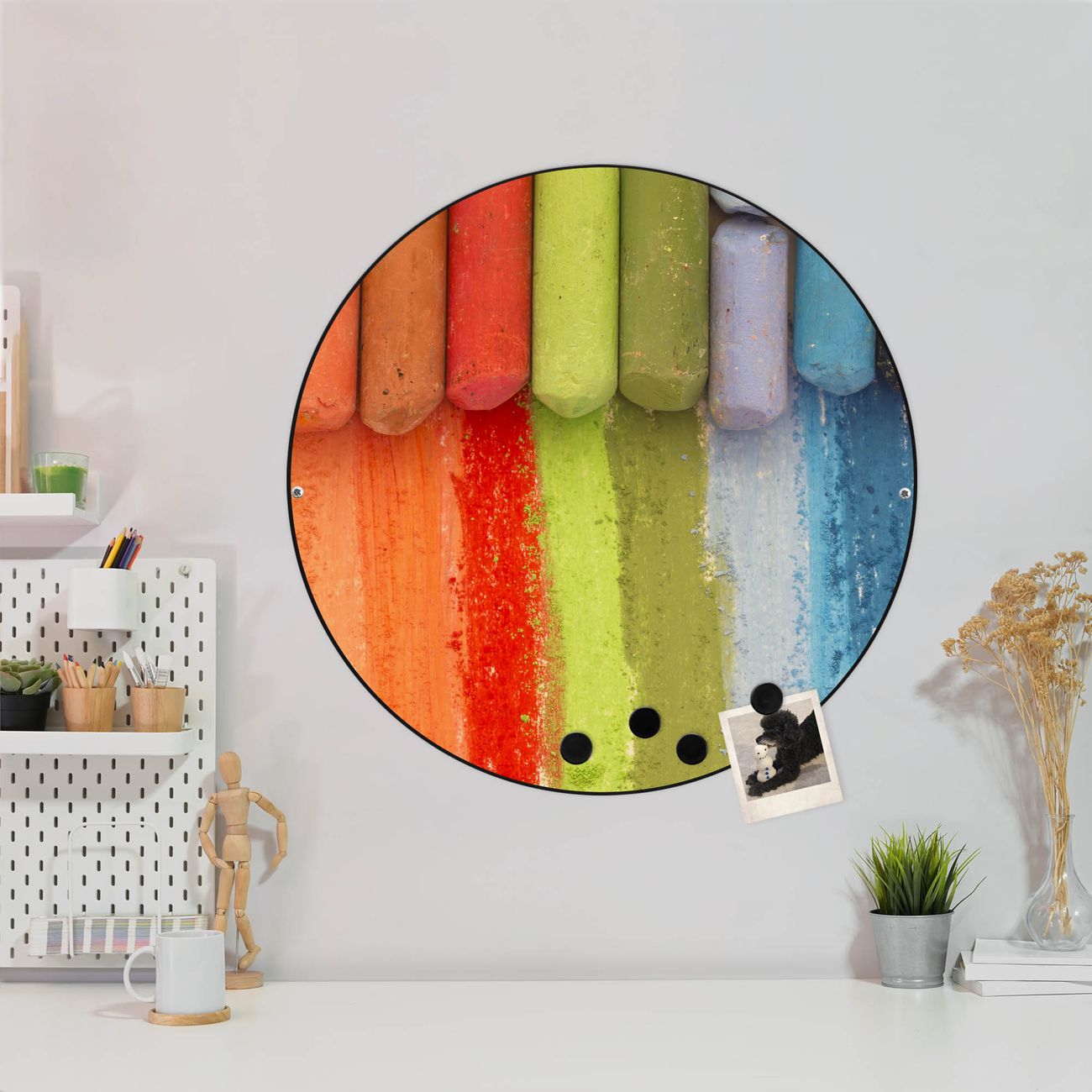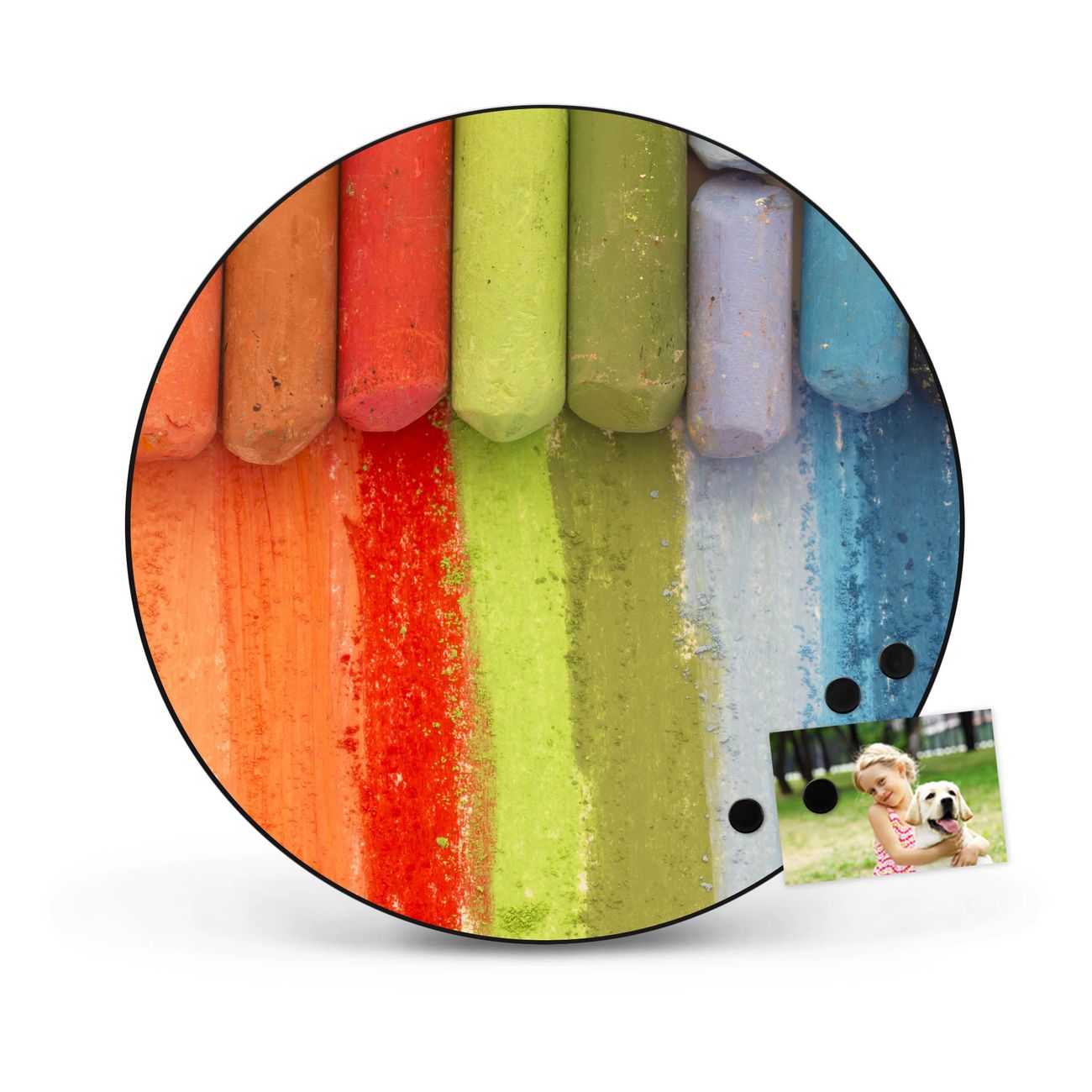 FUNKTION / DESIGN Die banjado Magnettafel mit dem Motiv Motiv Regenbogenkreide bringt Ordnung in Ihr Zettelchaos. Fotos, Termine, Notizen oder Rezepte lassen Sich hier stilvoll mit Magneten ordnen, Sie behalten alles im Blick. Die Design Magnetwand ist beschreibbar und wieder abwischbar. Mit dieser Pinnwand haben Sie auch ohne Notizen und Magneten ein schönes Dekoelement. Das Format bietet Ihnen ausreichend Platz um alle wichtigen Informationen im Blick zu behalten. DETAILS / NUTZEN Die magnetische Metall Pinnwand besteht aus schwarz lackiertem Stahl. Sie hat einen Durchmesser von 47cm. Es befinden sich an den Seiten zwei vorgefertigte Löcher die eine schnelle und unkomplizierte Anbringung ermöglichen. Das Motiv ist mit einem seidenmatten Laminat versehen und schützt so zusätzlich vor Kratzern. Es halten alle handelsüblichen Magneten daran. Wir sind ein kleines Team aus dem Herzen von Sachsen. Wir fertigen alle Artikel von Hand für Sie an, Sie erhalten keine preiswerte Importware. Auf Wunsch können Sie auch Ihr eigenes Foto auf die Magnettafel aufbringen, schreiben Sie uns an.