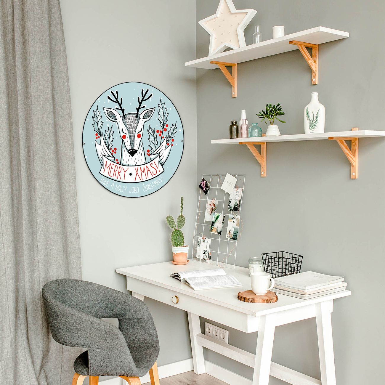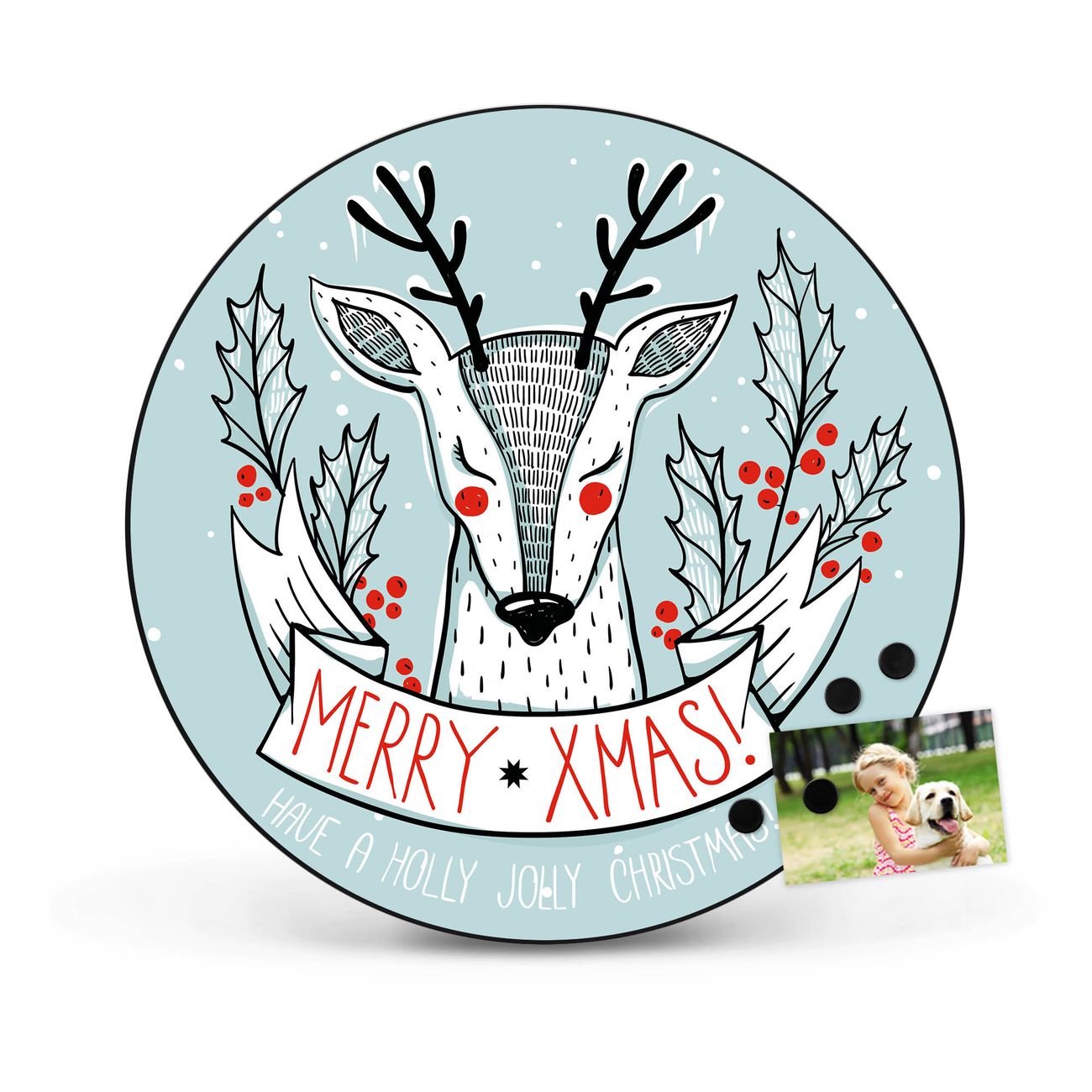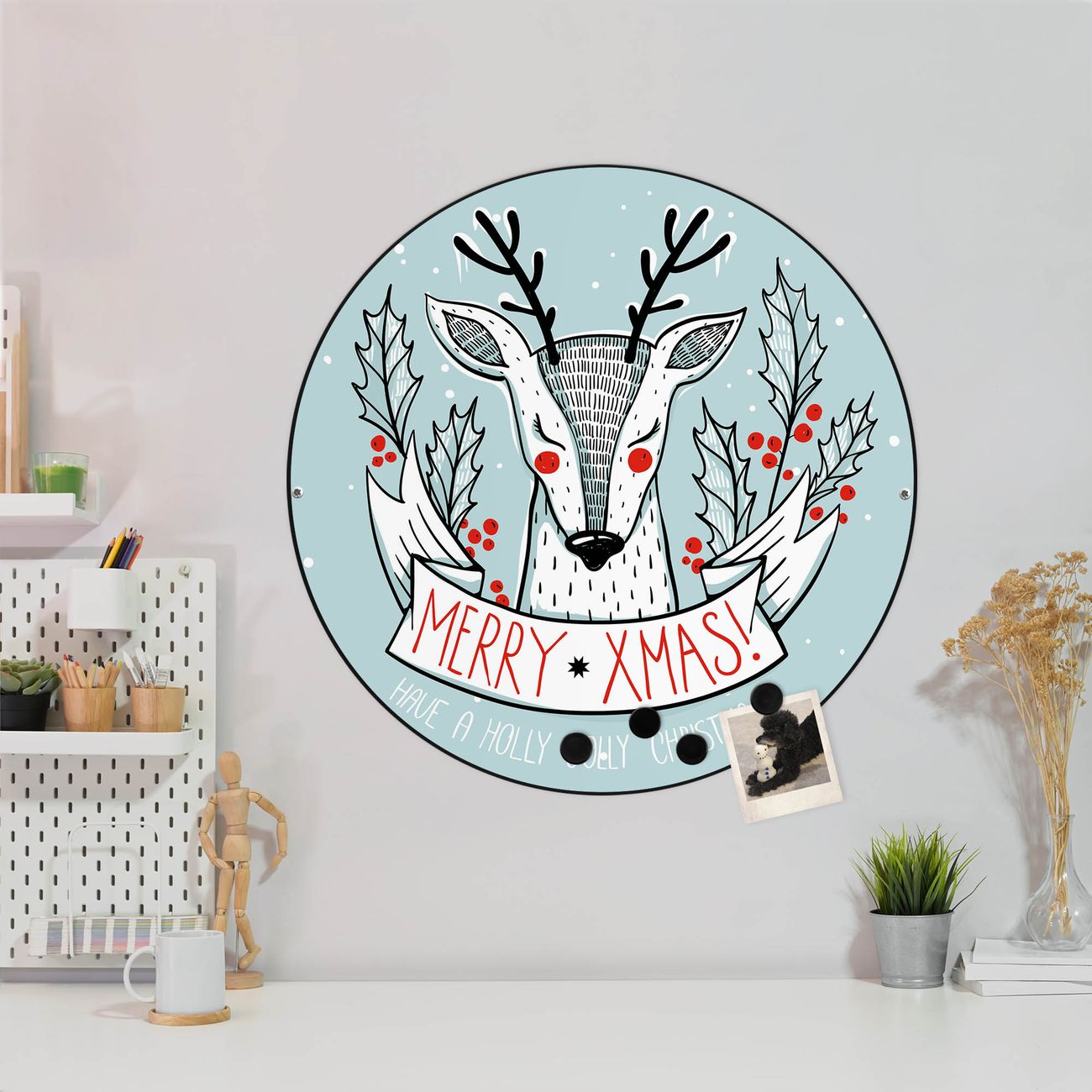 FUNKTION / DESIGN Die banjado Magnettafel mit dem Motiv Motiv Rentier bringt Ordnung in Ihr Zettelchaos. Fotos, Termine, Notizen oder Rezepte lassen Sich hier stilvoll mit Magneten ordnen, Sie behalten alles im Blick. Die Design Magnetwand ist beschreibbar und wieder abwischbar. Mit dieser Pinnwand haben Sie auch ohne Notizen und Magneten ein schönes Dekoelement. Das Format bietet Ihnen ausreichend Platz um alle wichtigen Informationen im Blick zu behalten. DETAILS / NUTZEN Die magnetische Metall Pinnwand besteht aus schwarz lackiertem Stahl. Sie hat einen Durchmesser von 47cm. Es befinden sich an den Seiten zwei vorgefertigte Löcher die eine schnelle und unkomplizierte Anbringung ermöglichen. Das Motiv ist mit einem seidenmatten Laminat versehen und schützt so zusätzlich vor Kratzern. Es halten alle handelsüblichen Magneten daran. Wir sind ein kleines Team aus dem Herzen von Sachsen. Wir fertigen alle Artikel von Hand für Sie an, Sie erhalten keine preiswerte Importware. Auf Wunsch können Sie auch Ihr eigenes Foto auf die Magnettafel aufbringen, schreiben Sie uns an.