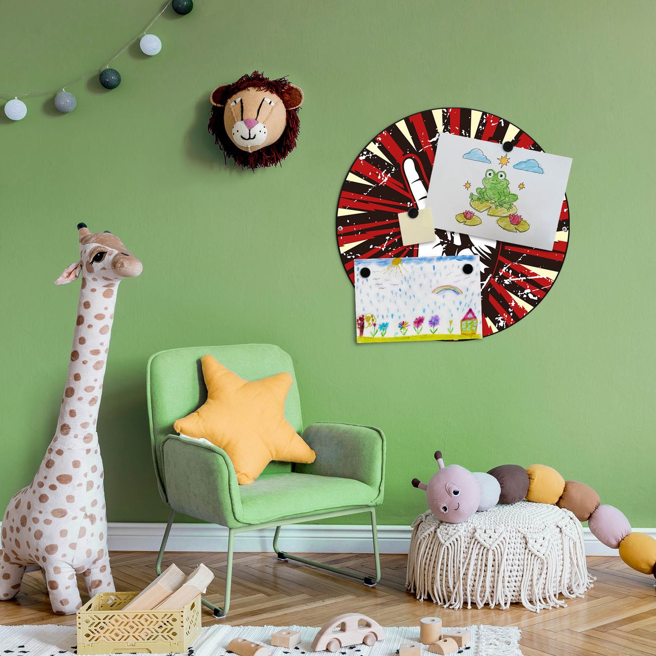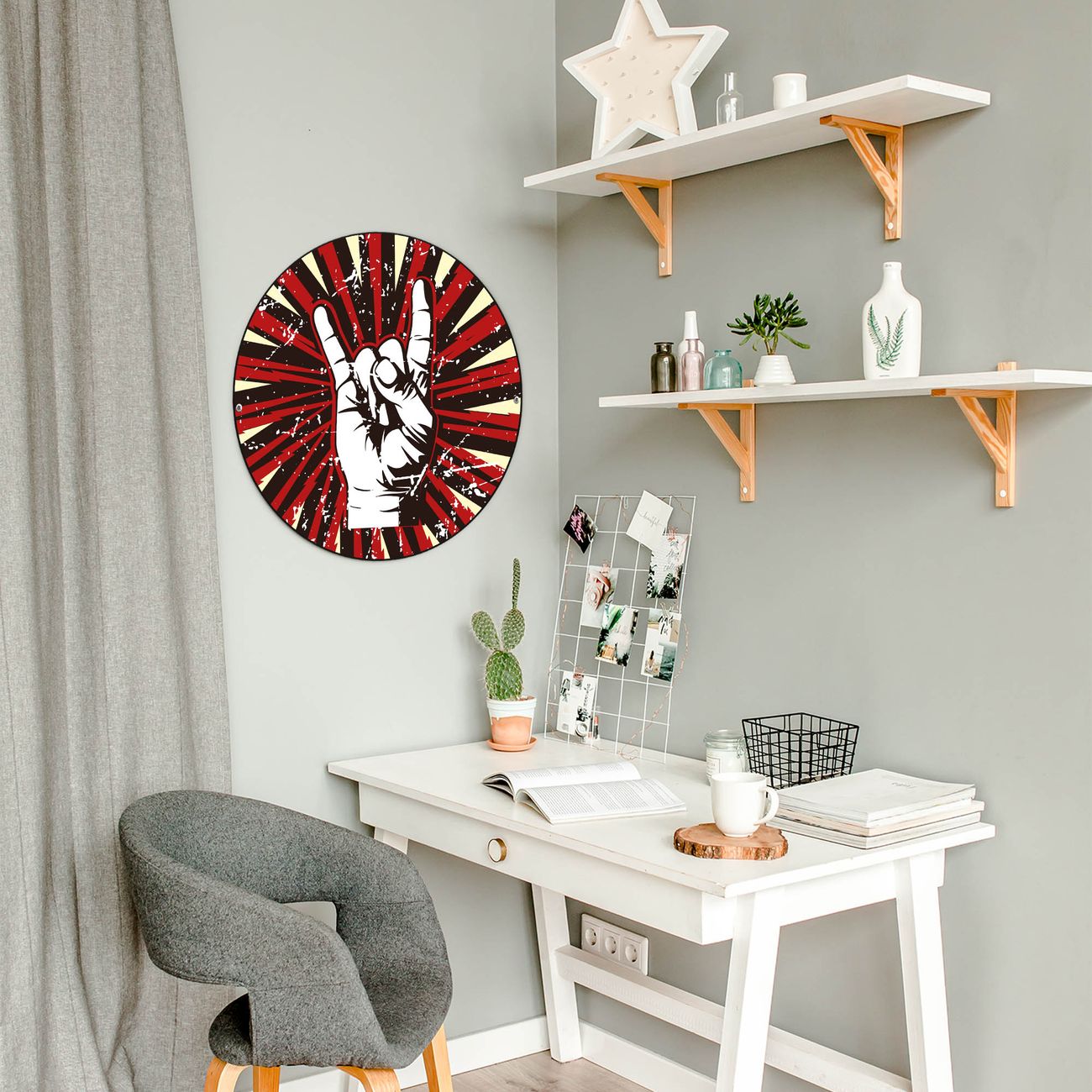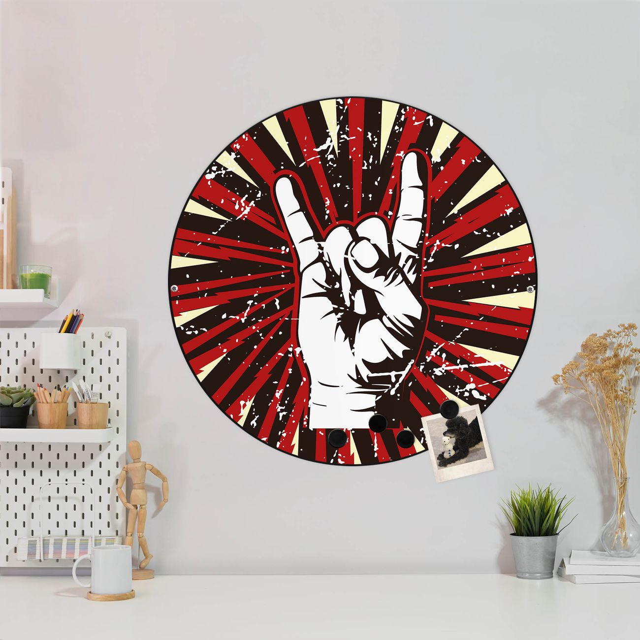 FUNKTION / DESIGN Die banjado Magnettafel mit dem Motiv Motiv Rock On bringt Ordnung in Ihr Zettelchaos. Fotos, Termine, Notizen oder Rezepte lassen Sich hier stilvoll mit Magneten ordnen, Sie behalten alles im Blick. Die Design Magnetwand ist beschreibbar und wieder abwischbar. Mit dieser Pinnwand haben Sie auch ohne Notizen und Magneten ein schönes Dekoelement. Das Format bietet Ihnen ausreichend Platz um alle wichtigen Informationen im Blick zu behalten. DETAILS / NUTZEN Die magnetische Metall Pinnwand besteht aus schwarz lackiertem Stahl. Sie hat einen Durchmesser von 47cm. Es befinden sich an den Seiten zwei vorgefertigte Löcher die eine schnelle und unkomplizierte Anbringung ermöglichen. Das Motiv ist mit einem seidenmatten Laminat versehen und schützt so zusätzlich vor Kratzern. Es halten alle handelsüblichen Magneten daran. Wir sind ein kleines Team aus dem Herzen von Sachsen. Wir fertigen alle Artikel von Hand für Sie an, Sie erhalten keine preiswerte Importware. Auf Wunsch können Sie auch Ihr eigenes Foto auf die Magnettafel aufbringen, schreiben Sie uns an.