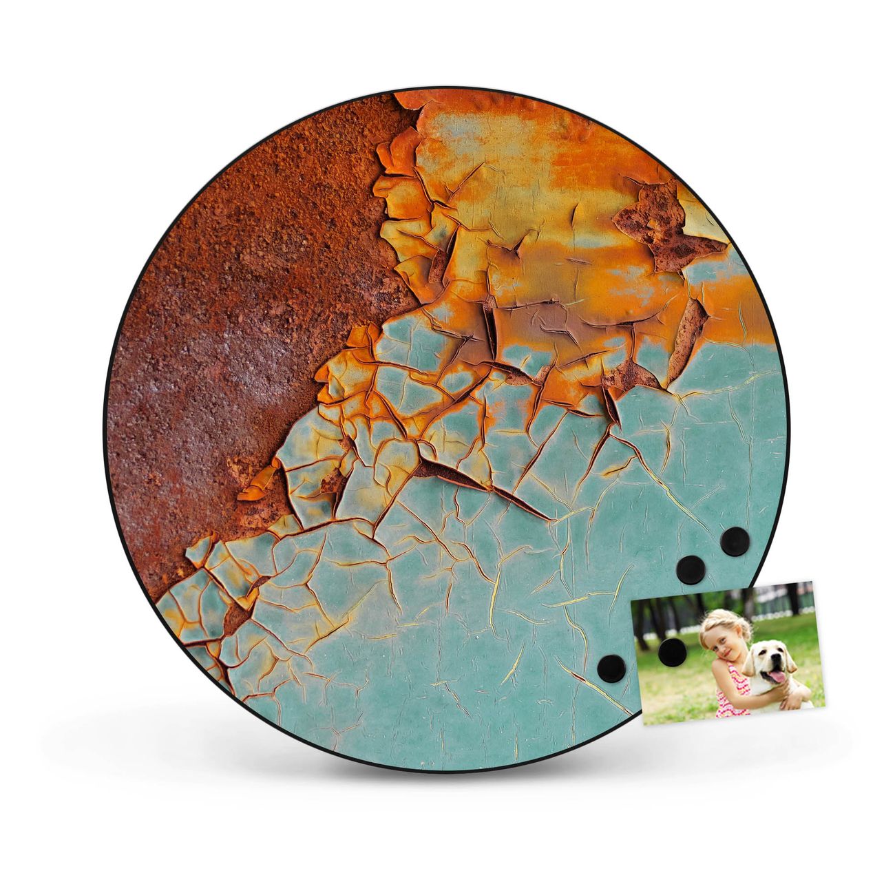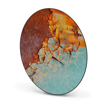 FUNKTION / DESIGN Die banjado Magnettafel mit dem Motiv Motiv Rost und Blau bringt Ordnung in Ihr Zettelchaos. Fotos, Termine, Notizen oder Rezepte lassen Sich hier stilvoll mit Magneten ordnen, Sie behalten alles im Blick. Die Design Magnetwand ist beschreibbar und wieder abwischbar. Mit dieser Pinnwand haben Sie auch ohne Notizen und Magneten ein schönes Dekoelement. Das Format bietet Ihnen ausreichend Platz um alle wichtigen Informationen im Blick zu behalten. DETAILS / NUTZEN Die magnetische Metall Pinnwand besteht aus schwarz lackiertem Stahl. Sie hat einen Durchmesser von 47cm. Es befinden sich an den Seiten zwei vorgefertigte Löcher die eine schnelle und unkomplizierte Anbringung ermöglichen. Das Motiv ist mit einem seidenmatten Laminat versehen und schützt so zusätzlich vor Kratzern. Es halten alle handelsüblichen Magneten daran. Wir sind ein kleines Team aus dem Herzen von Sachsen. Wir fertigen alle Artikel von Hand für Sie an, Sie erhalten keine preiswerte Importware. Auf Wunsch können Sie auch Ihr eigenes Foto auf die Magnettafel aufbringen, schreiben Sie uns an.