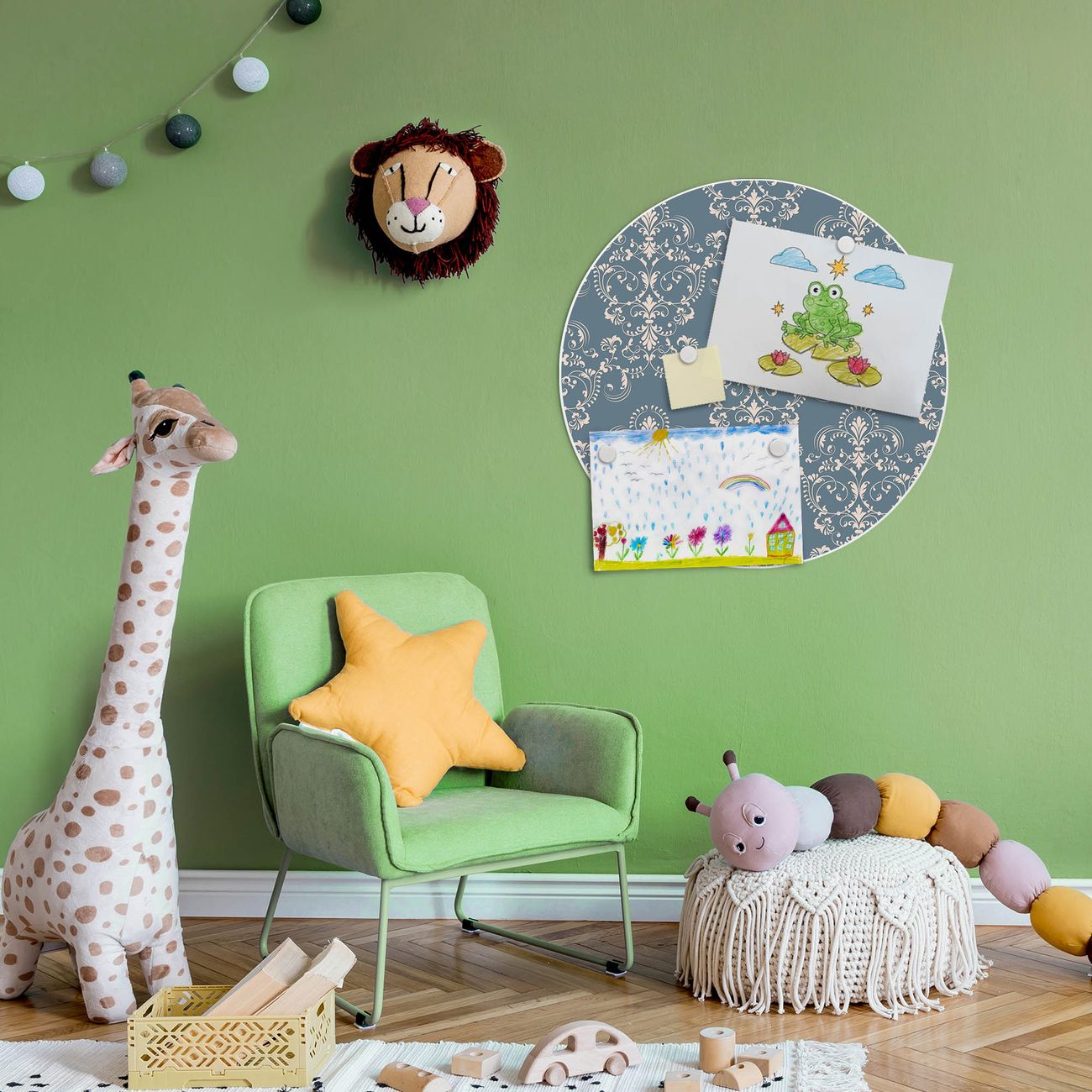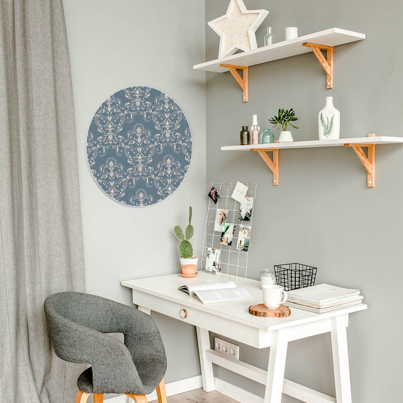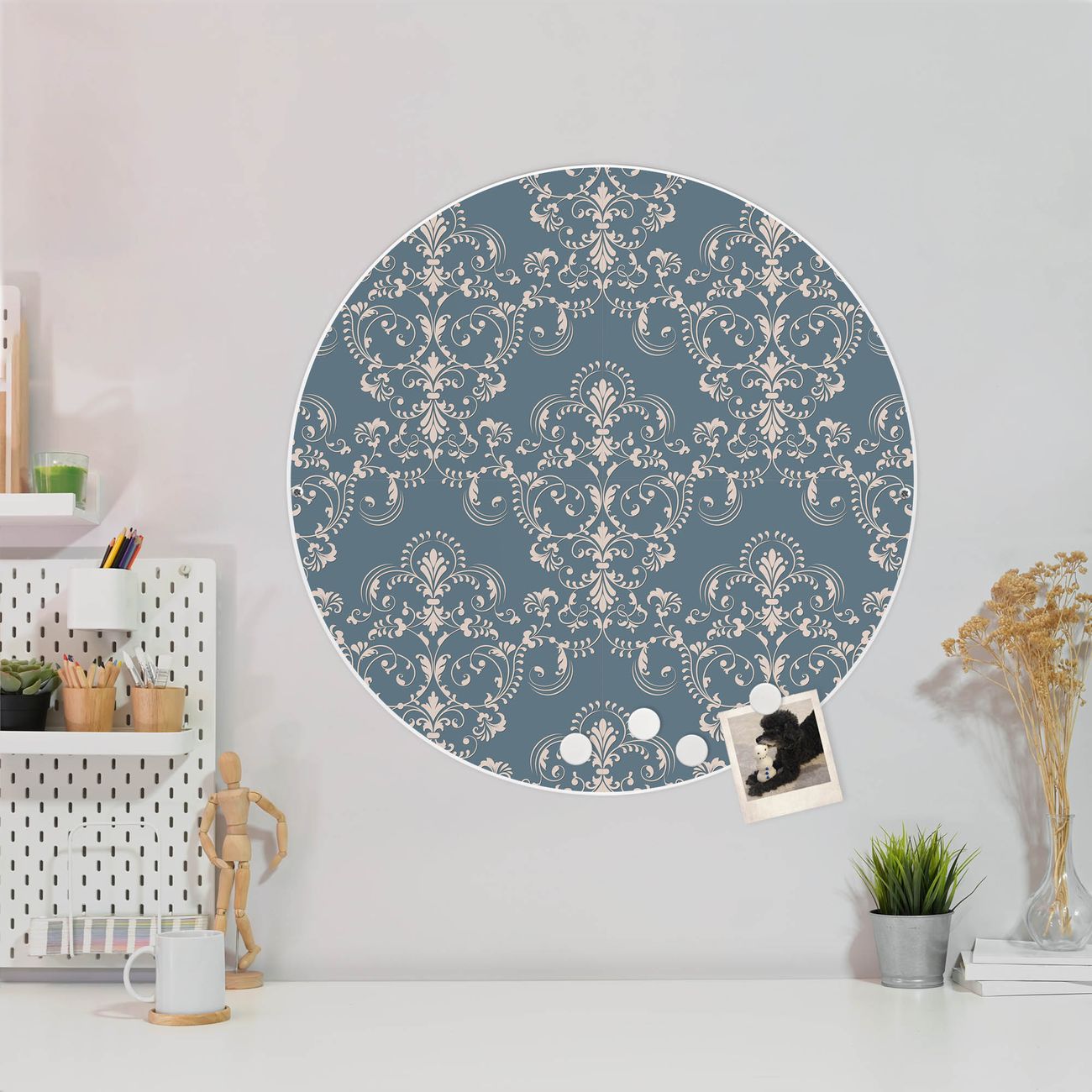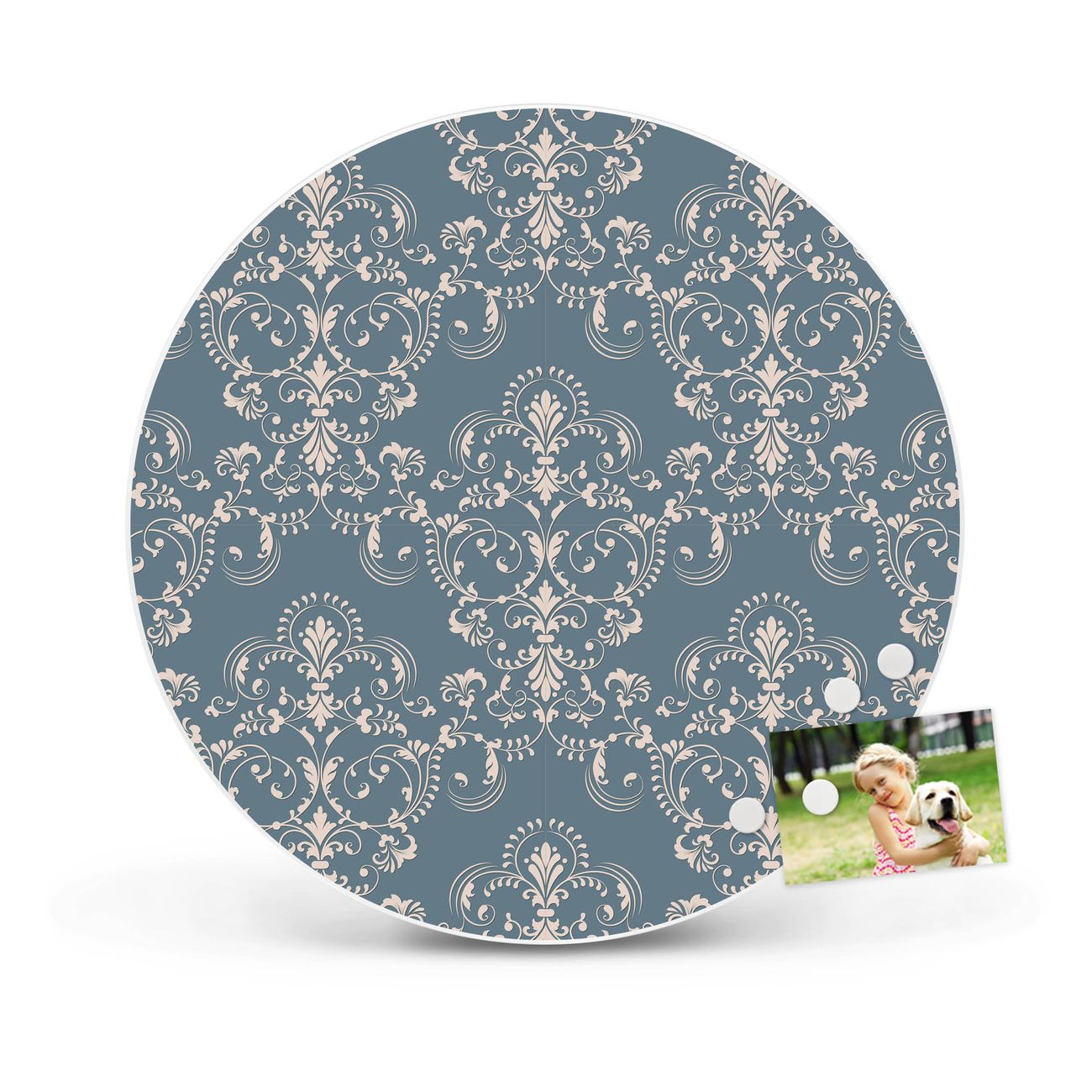 FUNKTION / DESIGN Die banjado Magnettafel mit dem Motiv Motiv Royal Creme Blau bringt Ordnung in Ihr Zettelchaos. Fotos, Termine, Notizen oder Rezepte lassen Sich hier stilvoll mit Magneten ordnen, Sie behalten alles im Blick. Die Design Magnetwand ist beschreibbar und wieder abwischbar. Mit dieser Pinnwand haben Sie auch ohne Notizen und Magneten ein schönes Dekoelement. Das Format bietet Ihnen ausreichend Platz um alle wichtigen Informationen im Blick zu behalten. DETAILS / NUTZEN Die magnetische Metall Pinnwand besteht aus weiß lackiertem Stahl. Sie hat einen Durchmesser von 47cm. Es befinden sich an den Seiten zwei vorgefertigte Löcher die eine schnelle und unkomplizierte Anbringung ermöglichen. Das Motiv ist mit einem seidenmatten Laminat versehen und schützt so zusätzlich vor Kratzern. Es halten alle handelsüblichen Magneten daran. Wir sind ein kleines Team aus dem Herzen von Sachsen. Wir fertigen alle Artikel von Hand für Sie an, Sie erhalten keine preiswerte Importware. Auf Wunsch können Sie auch Ihr eigenes Foto auf die Magnettafel aufbringen, schreiben Sie uns an.