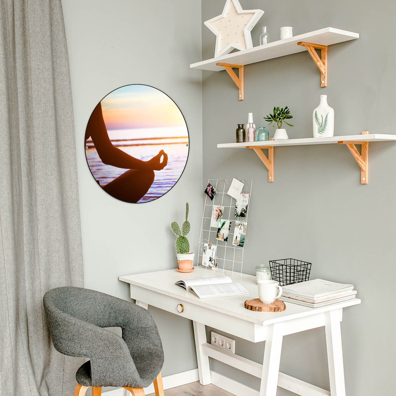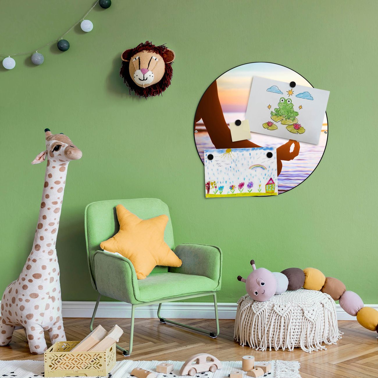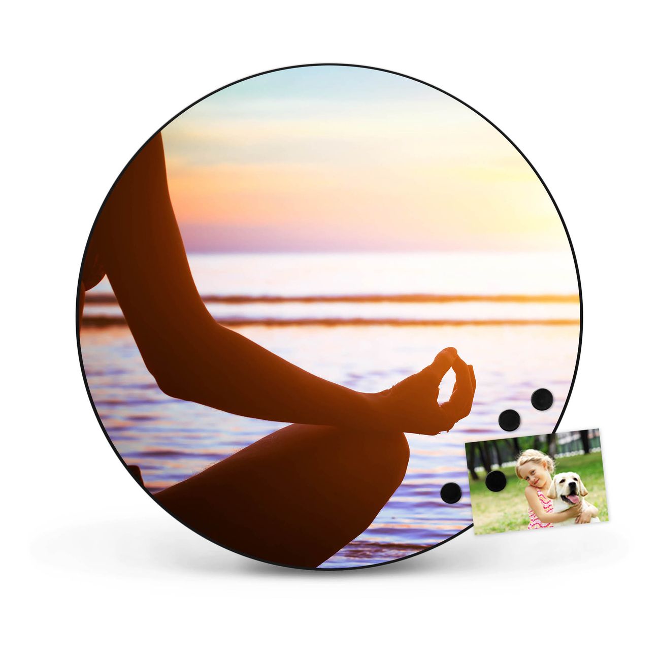 FUNKTION / DESIGN Die banjado Magnettafel mit dem Motiv Motiv Ruhe bringt Ordnung in Ihr Zettelchaos. Fotos, Termine, Notizen oder Rezepte lassen Sich hier stilvoll mit Magneten ordnen, Sie behalten alles im Blick. Die Design Magnetwand ist beschreibbar und wieder abwischbar. Mit dieser Pinnwand haben Sie auch ohne Notizen und Magneten ein schönes Dekoelement. Das Format bietet Ihnen ausreichend Platz um alle wichtigen Informationen im Blick zu behalten. DETAILS / NUTZEN Die magnetische Metall Pinnwand besteht aus schwarz lackiertem Stahl. Sie hat einen Durchmesser von 47cm. Es befinden sich an den Seiten zwei vorgefertigte Löcher die eine schnelle und unkomplizierte Anbringung ermöglichen. Das Motiv ist mit einem seidenmatten Laminat versehen und schützt so zusätzlich vor Kratzern. Es halten alle handelsüblichen Magneten daran. Wir sind ein kleines Team aus dem Herzen von Sachsen. Wir fertigen alle Artikel von Hand für Sie an, Sie erhalten keine preiswerte Importware. Auf Wunsch können Sie auch Ihr eigenes Foto auf die Magnettafel aufbringen, schreiben Sie uns an.