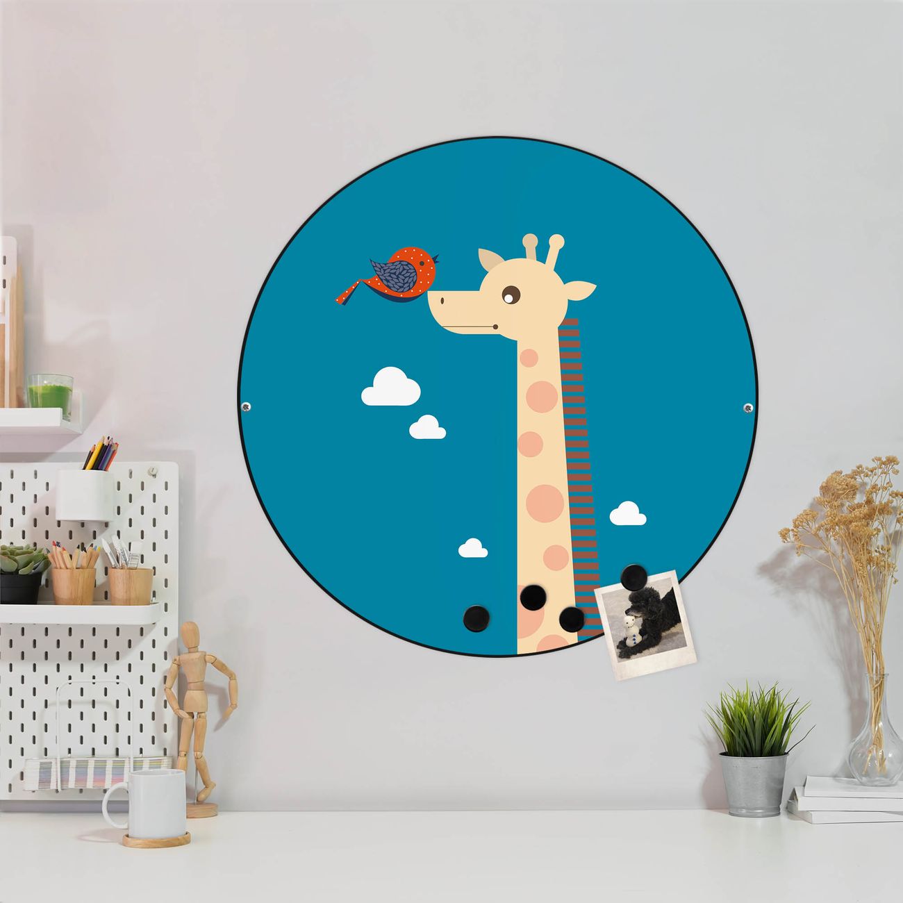 FUNKTION / DESIGN Die banjado Magnettafel mit dem Motiv Motiv Sally und Georg bringt Ordnung in Ihr Zettelchaos. Fotos, Termine, Notizen oder Rezepte lassen Sich hier stilvoll mit Magneten ordnen, Sie behalten alles im Blick. Die Design Magnetwand ist beschreibbar und wieder abwischbar. Mit dieser Pinnwand haben Sie auch ohne Notizen und Magneten ein schönes Dekoelement. Das Format bietet Ihnen ausreichend Platz um alle wichtigen Informationen im Blick zu behalten. DETAILS / NUTZEN Die magnetische Metall Pinnwand besteht aus schwarz lackiertem Stahl. Sie hat einen Durchmesser von 47cm. Es befinden sich an den Seiten zwei vorgefertigte Löcher die eine schnelle und unkomplizierte Anbringung ermöglichen. Das Motiv ist mit einem seidenmatten Laminat versehen und schützt so zusätzlich vor Kratzern. Es halten alle handelsüblichen Magneten daran. Wir sind ein kleines Team aus dem Herzen von Sachsen. Wir fertigen alle Artikel von Hand für Sie an, Sie erhalten keine preiswerte Importware. Auf Wunsch können Sie auch Ihr eigenes Foto auf die Magnettafel aufbringen, schreiben Sie uns an.