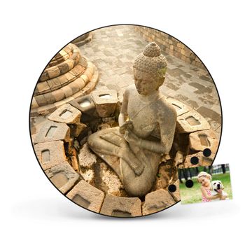 FUNKTION / DESIGN Die banjado Magnettafel mit dem Motiv Motiv Sitzender Buddha bringt Ordnung in Ihr Zettelchaos. Fotos, Termine, Notizen oder Rezepte lassen Sich hier stilvoll mit Magneten ordnen, Sie behalten alles im Blick. Die Design Magnetwand ist beschreibbar und wieder abwischbar. Mit dieser Pinnwand haben Sie auch ohne Notizen und Magneten ein schönes Dekoelement. Das Format bietet Ihnen ausreichend Platz um alle wichtigen Informationen im Blick zu behalten. DETAILS / NUTZEN Die magnetische Metall Pinnwand besteht aus schwarz lackiertem Stahl. Sie hat einen Durchmesser von 47cm. Es befinden sich an den Seiten zwei vorgefertigte Löcher die eine schnelle und unkomplizierte Anbringung ermöglichen. Das Motiv ist mit einem seidenmatten Laminat versehen und schützt so zusätzlich vor Kratzern. Es halten alle handelsüblichen Magneten daran. Wir sind ein kleines Team aus dem Herzen von Sachsen. Wir fertigen alle Artikel von Hand für Sie an, Sie erhalten keine preiswerte Importware. Auf Wunsch können Sie auch Ihr eigenes Foto auf die Magnettafel aufbringen, schreiben Sie uns an.