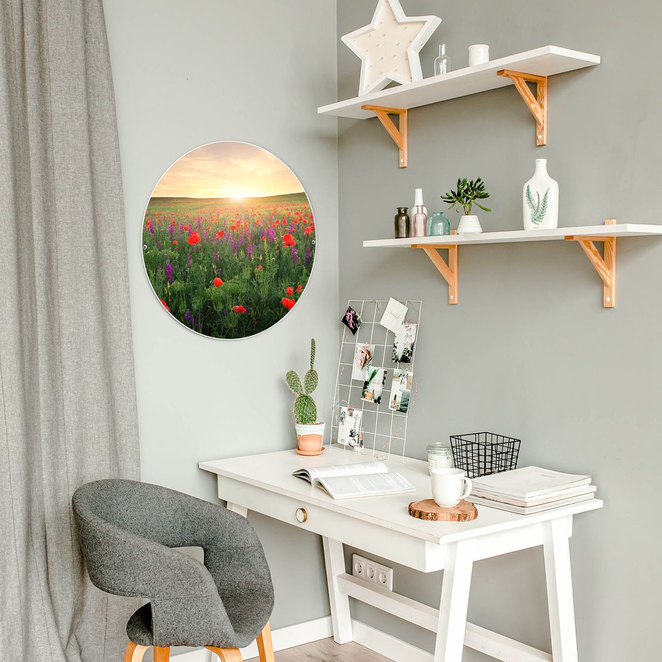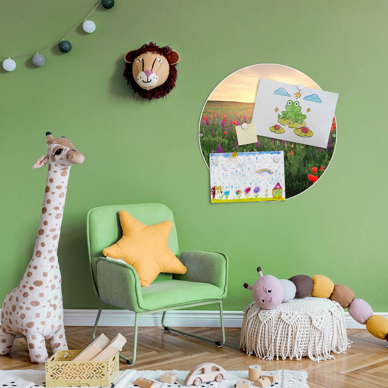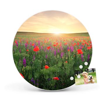 FUNKTION / DESIGN Die banjado Magnettafel mit dem Motiv Motiv Sommerfeld bringt Ordnung in Ihr Zettelchaos. Fotos, Termine, Notizen oder Rezepte lassen Sich hier stilvoll mit Magneten ordnen, Sie behalten alles im Blick. Die Design Magnetwand ist beschreibbar und wieder abwischbar. Mit dieser Pinnwand haben Sie auch ohne Notizen und Magneten ein schönes Dekoelement. Das Format bietet Ihnen ausreichend Platz um alle wichtigen Informationen im Blick zu behalten. DETAILS / NUTZEN Die magnetische Metall Pinnwand besteht aus weiß lackiertem Stahl. Sie hat einen Durchmesser von 47cm. Es befinden sich an den Seiten zwei vorgefertigte Löcher die eine schnelle und unkomplizierte Anbringung ermöglichen. Das Motiv ist mit einem seidenmatten Laminat versehen und schützt so zusätzlich vor Kratzern. Es halten alle handelsüblichen Magneten daran. Wir sind ein kleines Team aus dem Herzen von Sachsen. Wir fertigen alle Artikel von Hand für Sie an, Sie erhalten keine preiswerte Importware. Auf Wunsch können Sie auch Ihr eigenes Foto auf die Magnettafel aufbringen, schreiben Sie uns an.