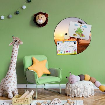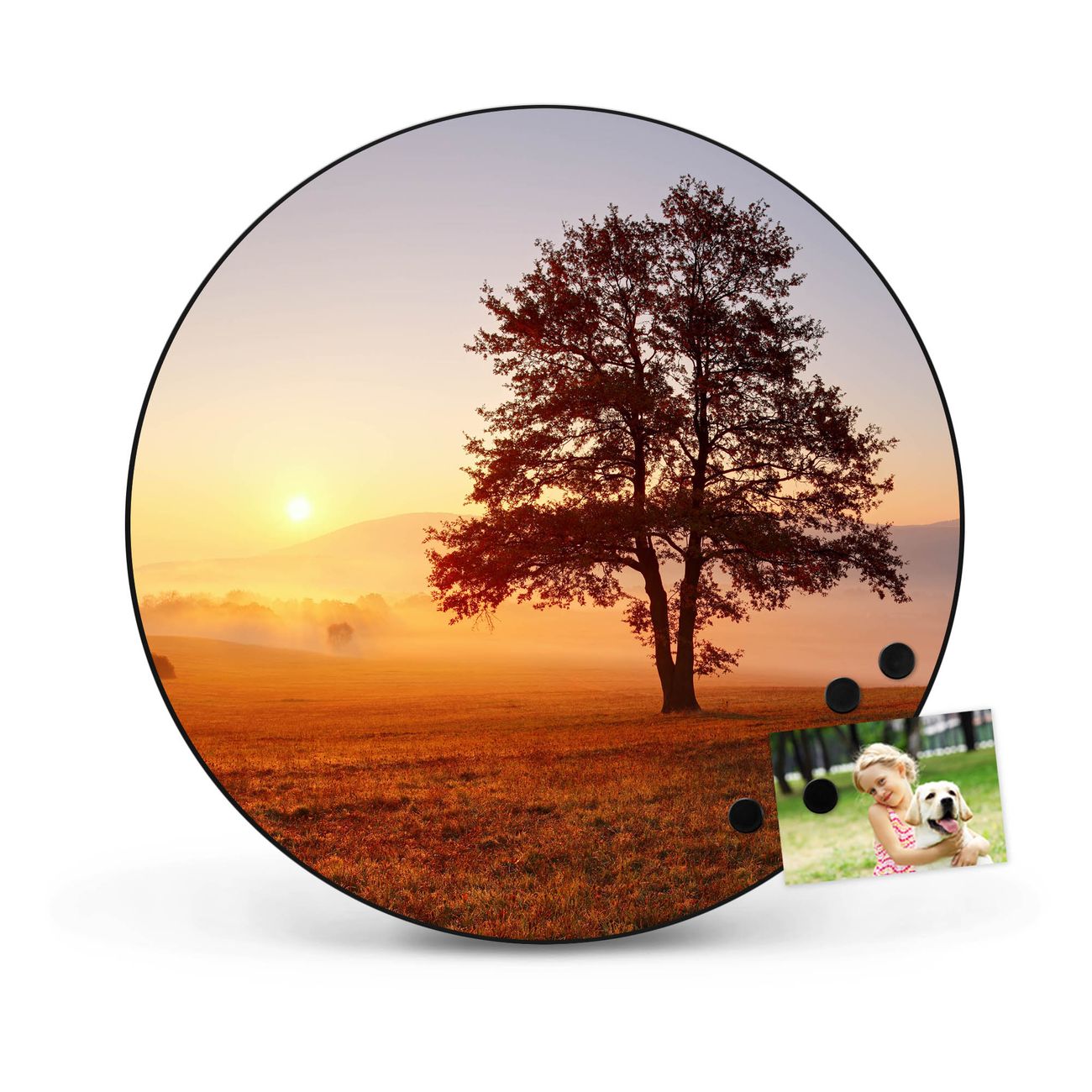 FUNKTION / DESIGN Die banjado Magnettafel mit dem Motiv Motiv Sonnenaufgang bringt Ordnung in Ihr Zettelchaos. Fotos, Termine, Notizen oder Rezepte lassen Sich hier stilvoll mit Magneten ordnen, Sie behalten alles im Blick. Die Design Magnetwand ist beschreibbar und wieder abwischbar. Mit dieser Pinnwand haben Sie auch ohne Notizen und Magneten ein schönes Dekoelement. Das Format bietet Ihnen ausreichend Platz um alle wichtigen Informationen im Blick zu behalten. DETAILS / NUTZEN Die magnetische Metall Pinnwand besteht aus schwarz lackiertem Stahl. Sie hat einen Durchmesser von 47cm. Es befinden sich an den Seiten zwei vorgefertigte Löcher die eine schnelle und unkomplizierte Anbringung ermöglichen. Das Motiv ist mit einem seidenmatten Laminat versehen und schützt so zusätzlich vor Kratzern. Es halten alle handelsüblichen Magneten daran. Wir sind ein kleines Team aus dem Herzen von Sachsen. Wir fertigen alle Artikel von Hand für Sie an, Sie erhalten keine preiswerte Importware. Auf Wunsch können Sie auch Ihr eigenes Foto auf die Magnettafel aufbringen, schreiben Sie uns an.