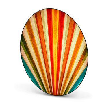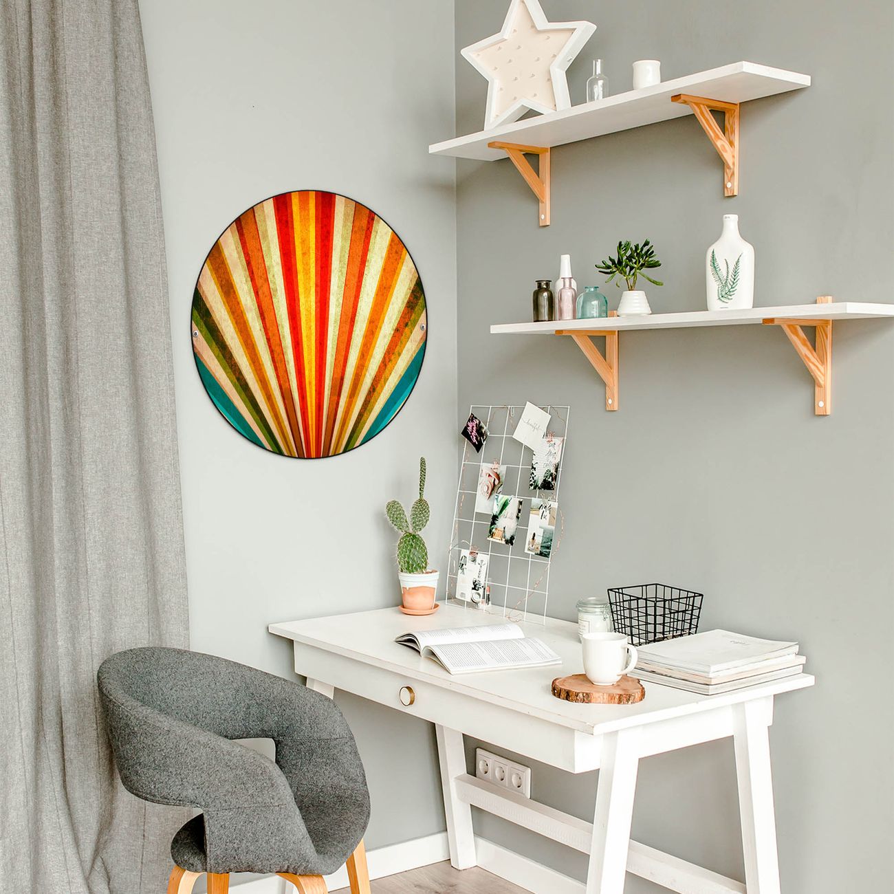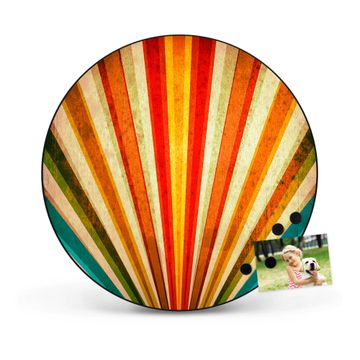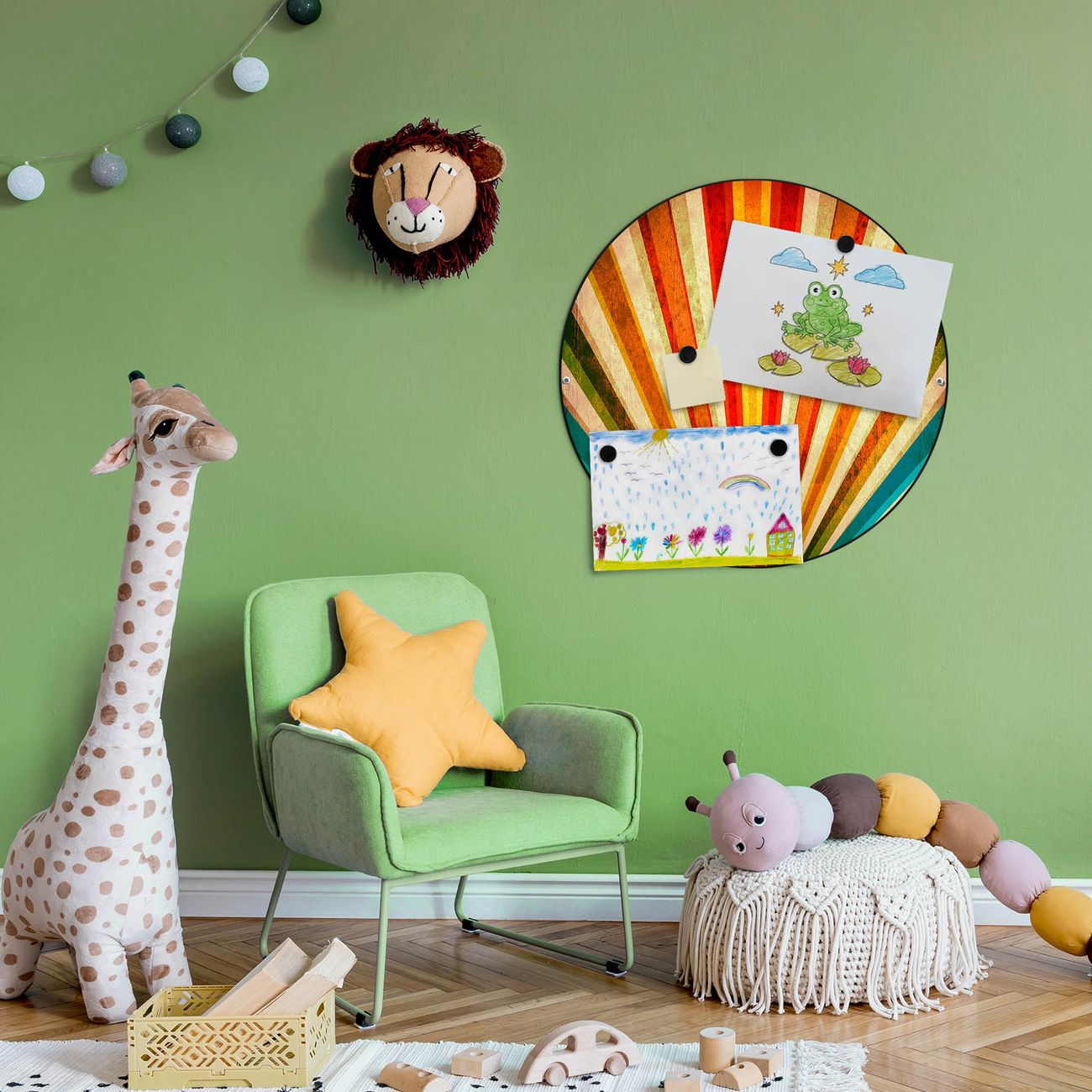 FUNKTION / DESIGN Die banjado Magnettafel mit dem Motiv Motiv Sonnenuntergang Abstrakt bringt Ordnung in Ihr Zettelchaos. Fotos, Termine, Notizen oder Rezepte lassen Sich hier stilvoll mit Magneten ordnen, Sie behalten alles im Blick. Die Design Magnetwand ist beschreibbar und wieder abwischbar. Mit dieser Pinnwand haben Sie auch ohne Notizen und Magneten ein schönes Dekoelement. Das Format bietet Ihnen ausreichend Platz um alle wichtigen Informationen im Blick zu behalten. DETAILS / NUTZEN Die magnetische Metall Pinnwand besteht aus schwarz lackiertem Stahl. Sie hat einen Durchmesser von 47cm. Es befinden sich an den Seiten zwei vorgefertigte Löcher die eine schnelle und unkomplizierte Anbringung ermöglichen. Das Motiv ist mit einem seidenmatten Laminat versehen und schützt so zusätzlich vor Kratzern. Es halten alle handelsüblichen Magneten daran. Wir sind ein kleines Team aus dem Herzen von Sachsen. Wir fertigen alle Artikel von Hand für Sie an, Sie erhalten keine preiswerte Importware. Auf Wunsch können Sie auch Ihr eigenes Foto auf die Magnettafel aufbringen, schreiben Sie uns an.