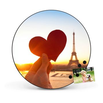 FUNKTION / DESIGN Die banjado Magnettafel mit dem Motiv Motiv Stadt Der Liebe bringt Ordnung in Ihr Zettelchaos. Fotos, Termine, Notizen oder Rezepte lassen Sich hier stilvoll mit Magneten ordnen, Sie behalten alles im Blick. Die Design Magnetwand ist beschreibbar und wieder abwischbar. Mit dieser Pinnwand haben Sie auch ohne Notizen und Magneten ein schönes Dekoelement. Das Format bietet Ihnen ausreichend Platz um alle wichtigen Informationen im Blick zu behalten. DETAILS / NUTZEN Die magnetische Metall Pinnwand besteht aus schwarz lackiertem Stahl. Sie hat einen Durchmesser von 47cm. Es befinden sich an den Seiten zwei vorgefertigte Löcher die eine schnelle und unkomplizierte Anbringung ermöglichen. Das Motiv ist mit einem seidenmatten Laminat versehen und schützt so zusätzlich vor Kratzern. Es halten alle handelsüblichen Magneten daran. Wir sind ein kleines Team aus dem Herzen von Sachsen. Wir fertigen alle Artikel von Hand für Sie an, Sie erhalten keine preiswerte Importware. Auf Wunsch können Sie auch Ihr eigenes Foto auf die Magnettafel aufbringen, schreiben Sie uns an.