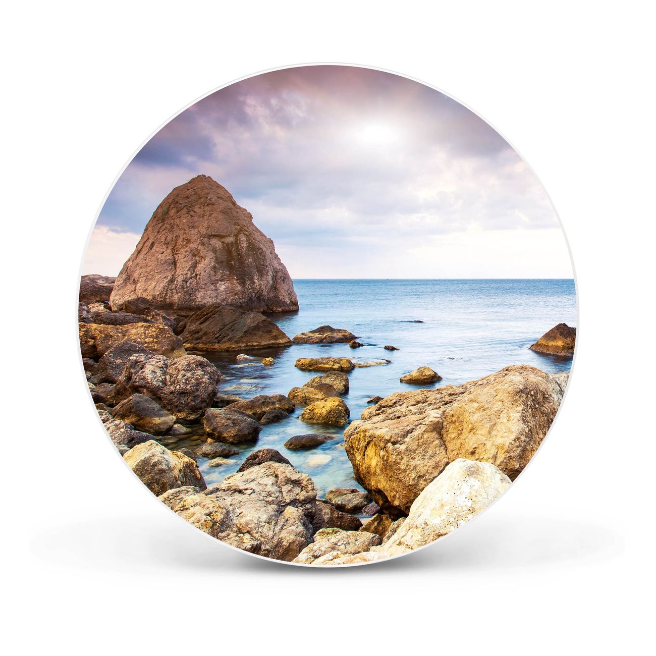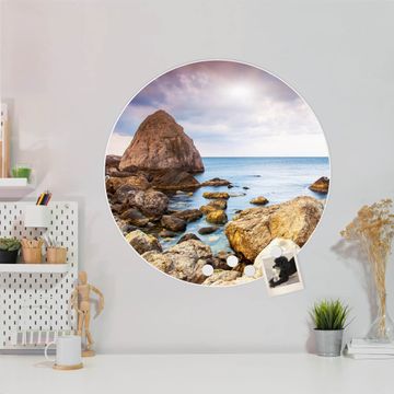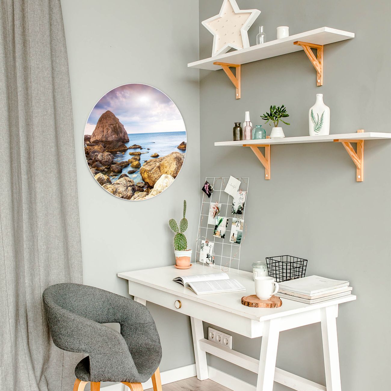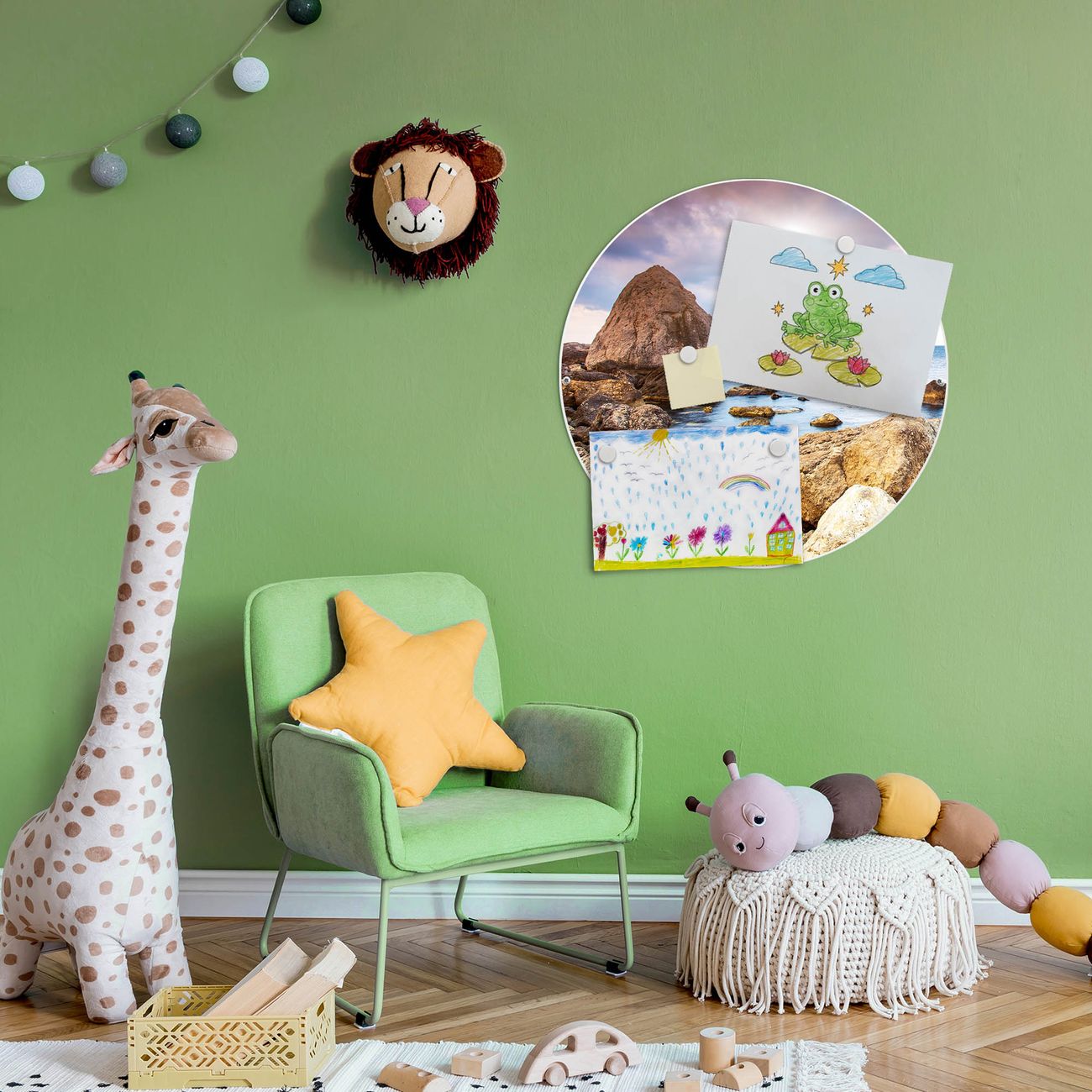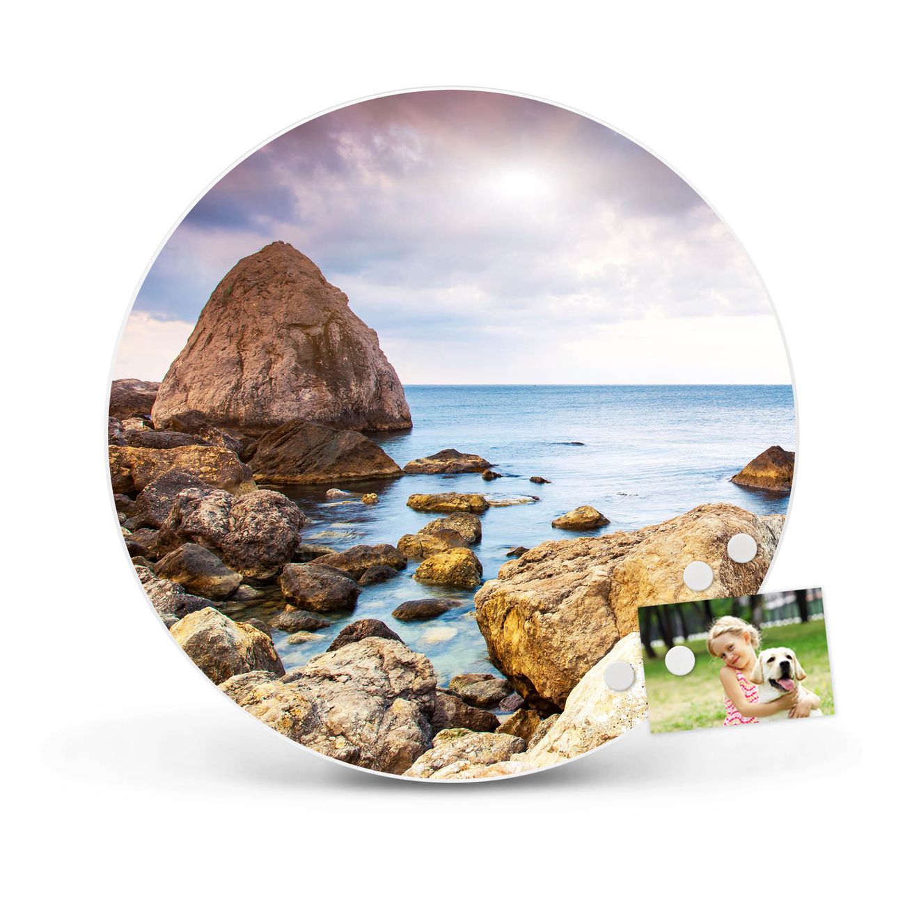 FUNKTION / DESIGN Die banjado Magnettafel mit dem Motiv Motiv Steinbucht bringt Ordnung in Ihr Zettelchaos. Fotos, Termine, Notizen oder Rezepte lassen Sich hier stilvoll mit Magneten ordnen, Sie behalten alles im Blick. Die Design Magnetwand ist beschreibbar und wieder abwischbar. Mit dieser Pinnwand haben Sie auch ohne Notizen und Magneten ein schönes Dekoelement. Das Format bietet Ihnen ausreichend Platz um alle wichtigen Informationen im Blick zu behalten. DETAILS / NUTZEN Die magnetische Metall Pinnwand besteht aus weiß lackiertem Stahl. Sie hat einen Durchmesser von 47cm. Es befinden sich an den Seiten zwei vorgefertigte Löcher die eine schnelle und unkomplizierte Anbringung ermöglichen. Das Motiv ist mit einem seidenmatten Laminat versehen und schützt so zusätzlich vor Kratzern. Es halten alle handelsüblichen Magneten daran. Wir sind ein kleines Team aus dem Herzen von Sachsen. Wir fertigen alle Artikel von Hand für Sie an, Sie erhalten keine preiswerte Importware. Auf Wunsch können Sie auch Ihr eigenes Foto auf die Magnettafel aufbringen, schreiben Sie uns an.