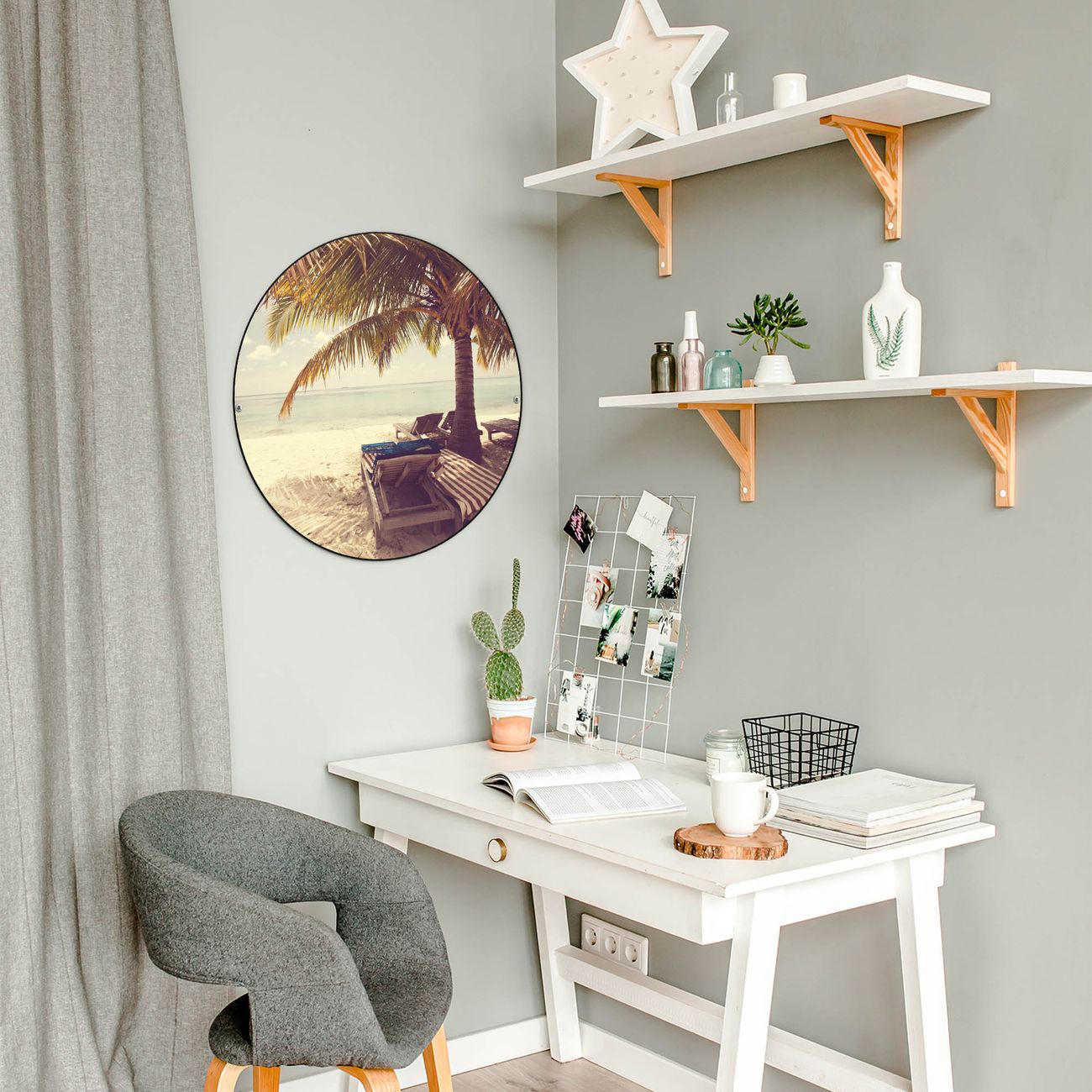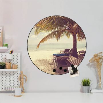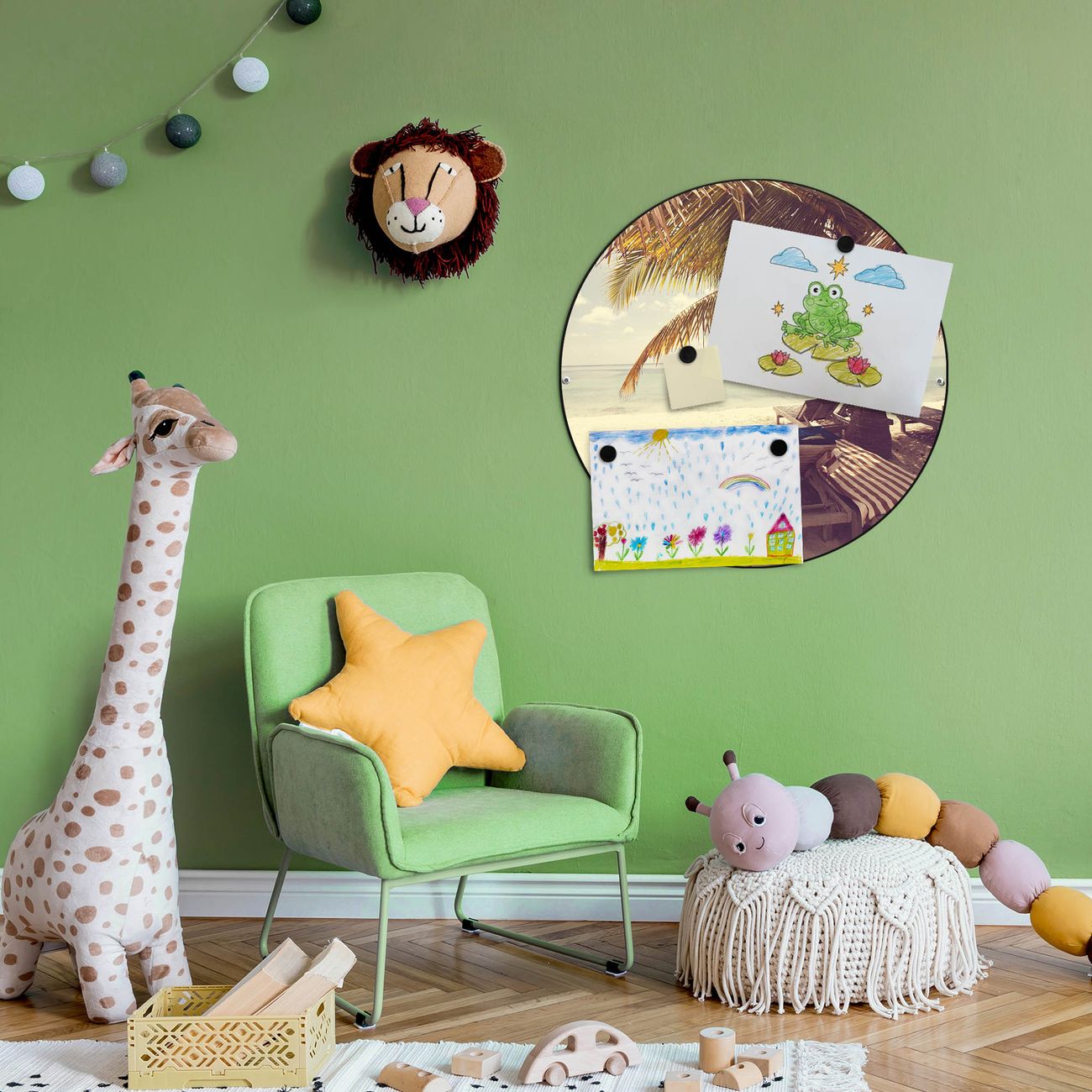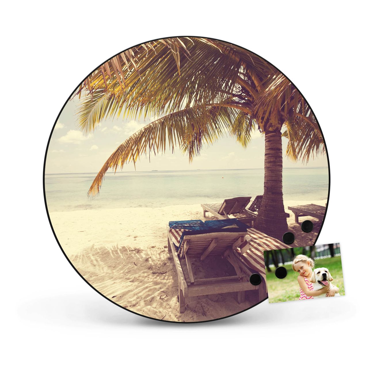FUNKTION / DESIGN Die banjado Magnettafel mit dem Motiv Motiv Südseestrand bringt Ordnung in Ihr Zettelchaos. Fotos, Termine, Notizen oder Rezepte lassen Sich hier stilvoll mit Magneten ordnen, Sie behalten alles im Blick. Die Design Magnetwand ist beschreibbar und wieder abwischbar. Mit dieser Pinnwand haben Sie auch ohne Notizen und Magneten ein schönes Dekoelement. Das Format bietet Ihnen ausreichend Platz um alle wichtigen Informationen im Blick zu behalten. DETAILS / NUTZEN Die magnetische Metall Pinnwand besteht aus schwarz lackiertem Stahl. Sie hat einen Durchmesser von 47cm. Es befinden sich an den Seiten zwei vorgefertigte Löcher die eine schnelle und unkomplizierte Anbringung ermöglichen. Das Motiv ist mit einem seidenmatten Laminat versehen und schützt so zusätzlich vor Kratzern. Es halten alle handelsüblichen Magneten daran. Wir sind ein kleines Team aus dem Herzen von Sachsen. Wir fertigen alle Artikel von Hand für Sie an, Sie erhalten keine preiswerte Importware. Auf Wunsch können Sie auch Ihr eigenes Foto auf die Magnettafel aufbringen, schreiben Sie uns an.