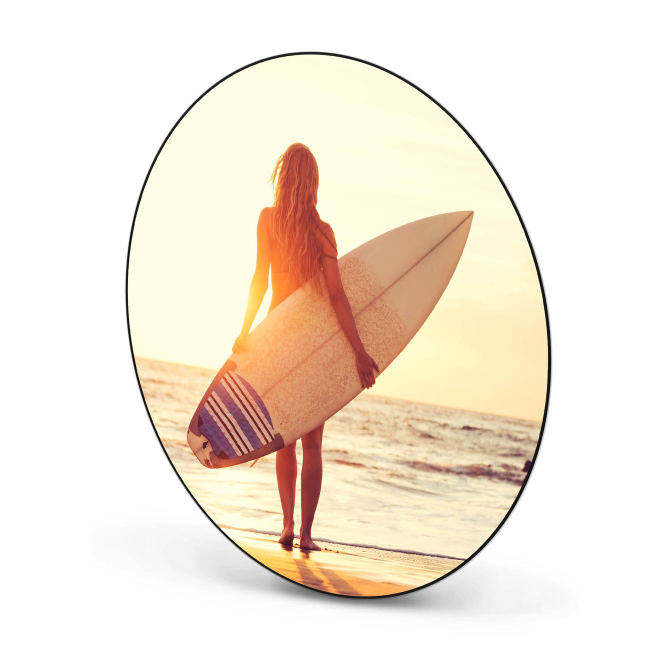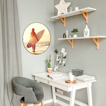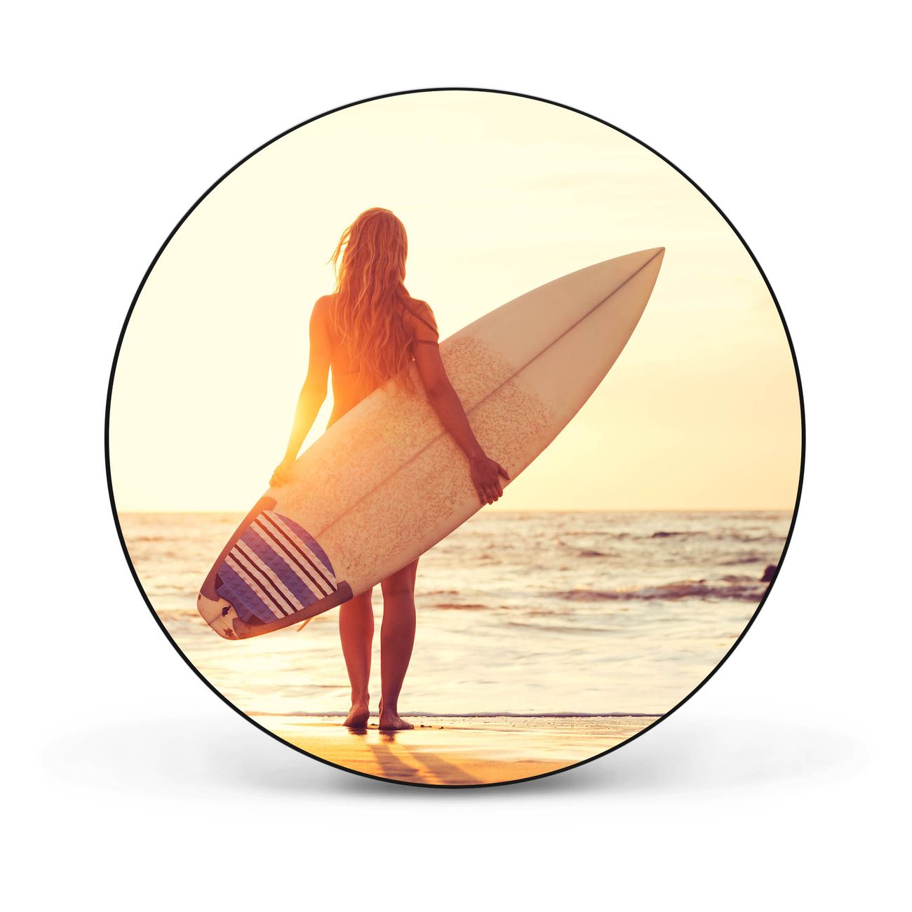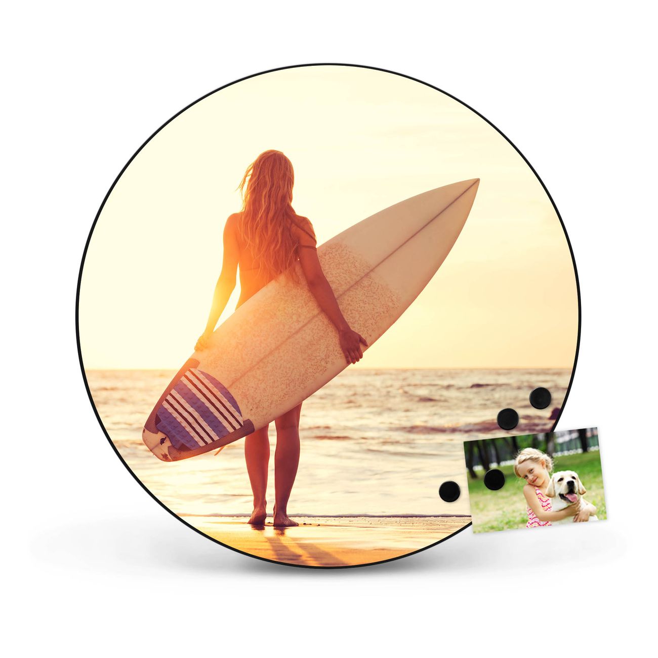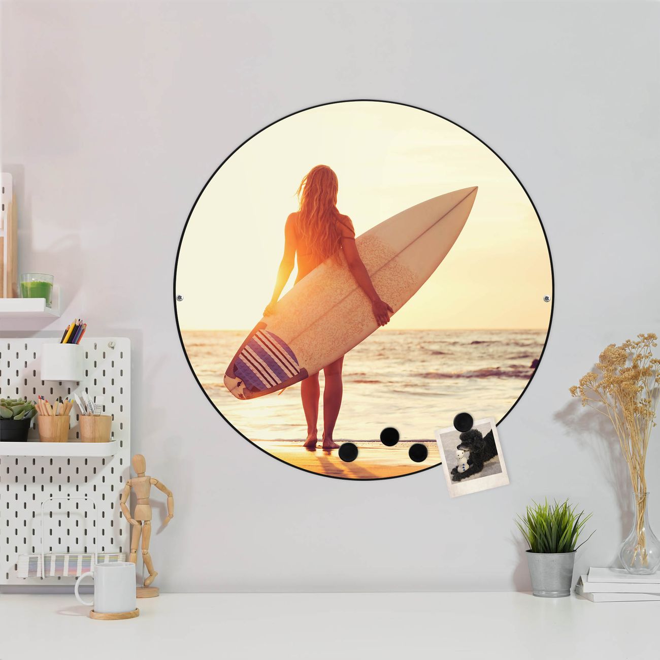 FUNKTION / DESIGN Die banjado Magnettafel mit dem Motiv Motiv Surfer Girl bringt Ordnung in Ihr Zettelchaos. Fotos, Termine, Notizen oder Rezepte lassen Sich hier stilvoll mit Magneten ordnen, Sie behalten alles im Blick. Die Design Magnetwand ist beschreibbar und wieder abwischbar. Mit dieser Pinnwand haben Sie auch ohne Notizen und Magneten ein schönes Dekoelement. Das Format bietet Ihnen ausreichend Platz um alle wichtigen Informationen im Blick zu behalten. DETAILS / NUTZEN Die magnetische Metall Pinnwand besteht aus schwarz lackiertem Stahl. Sie hat einen Durchmesser von 47cm. Es befinden sich an den Seiten zwei vorgefertigte Löcher die eine schnelle und unkomplizierte Anbringung ermöglichen. Das Motiv ist mit einem seidenmatten Laminat versehen und schützt so zusätzlich vor Kratzern. Es halten alle handelsüblichen Magneten daran. Wir sind ein kleines Team aus dem Herzen von Sachsen. Wir fertigen alle Artikel von Hand für Sie an, Sie erhalten keine preiswerte Importware. Auf Wunsch können Sie auch Ihr eigenes Foto auf die Magnettafel aufbringen, schreiben Sie uns an.