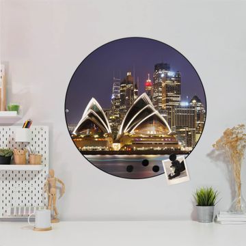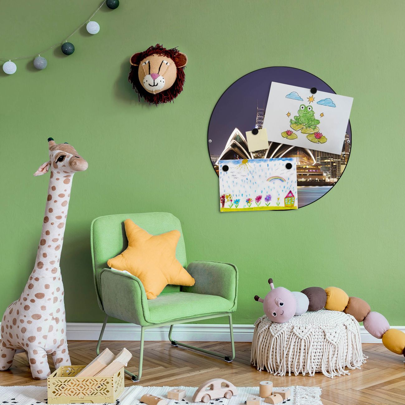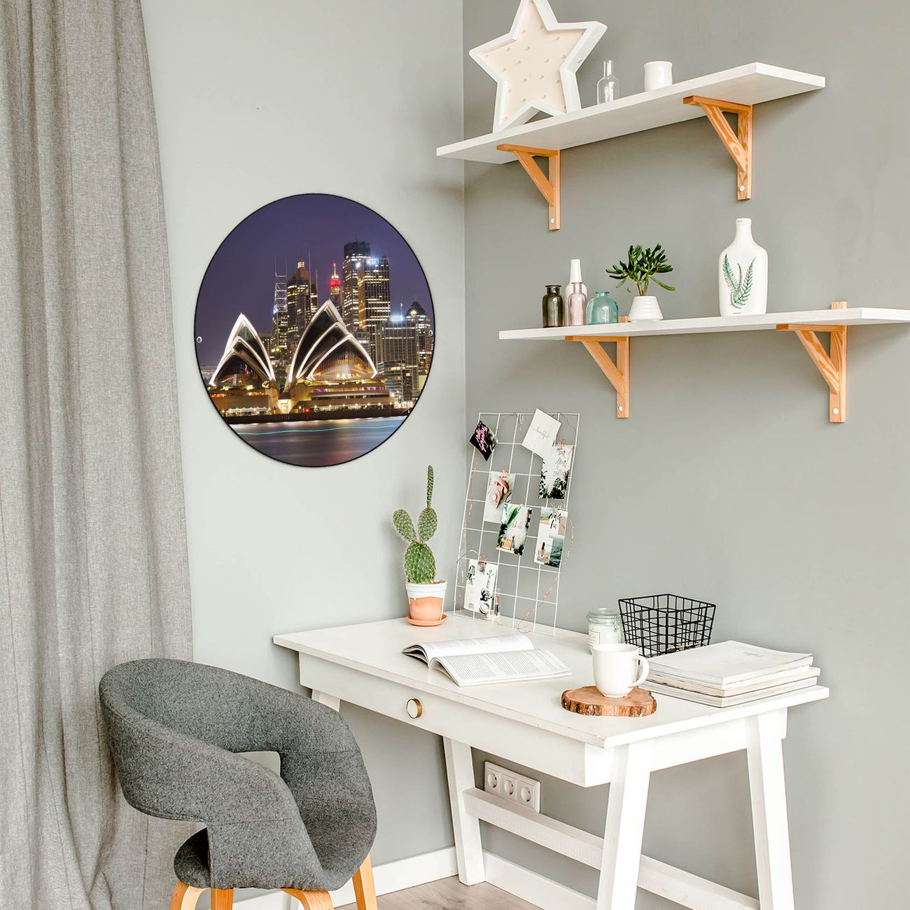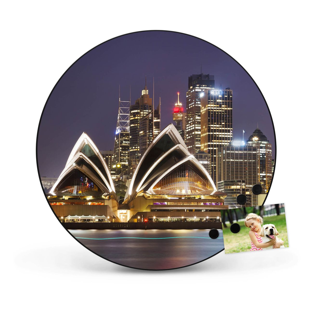 FUNKTION / DESIGN Die banjado Magnettafel mit dem Motiv Motiv Sydney bringt Ordnung in Ihr Zettelchaos. Fotos, Termine, Notizen oder Rezepte lassen Sich hier stilvoll mit Magneten ordnen, Sie behalten alles im Blick. Die Design Magnetwand ist beschreibbar und wieder abwischbar. Mit dieser Pinnwand haben Sie auch ohne Notizen und Magneten ein schönes Dekoelement. Das Format bietet Ihnen ausreichend Platz um alle wichtigen Informationen im Blick zu behalten. DETAILS / NUTZEN Die magnetische Metall Pinnwand besteht aus schwarz lackiertem Stahl. Sie hat einen Durchmesser von 47cm. Es befinden sich an den Seiten zwei vorgefertigte Löcher die eine schnelle und unkomplizierte Anbringung ermöglichen. Das Motiv ist mit einem seidenmatten Laminat versehen und schützt so zusätzlich vor Kratzern. Es halten alle handelsüblichen Magneten daran. Wir sind ein kleines Team aus dem Herzen von Sachsen. Wir fertigen alle Artikel von Hand für Sie an, Sie erhalten keine preiswerte Importware. Auf Wunsch können Sie auch Ihr eigenes Foto auf die Magnettafel aufbringen, schreiben Sie uns an.