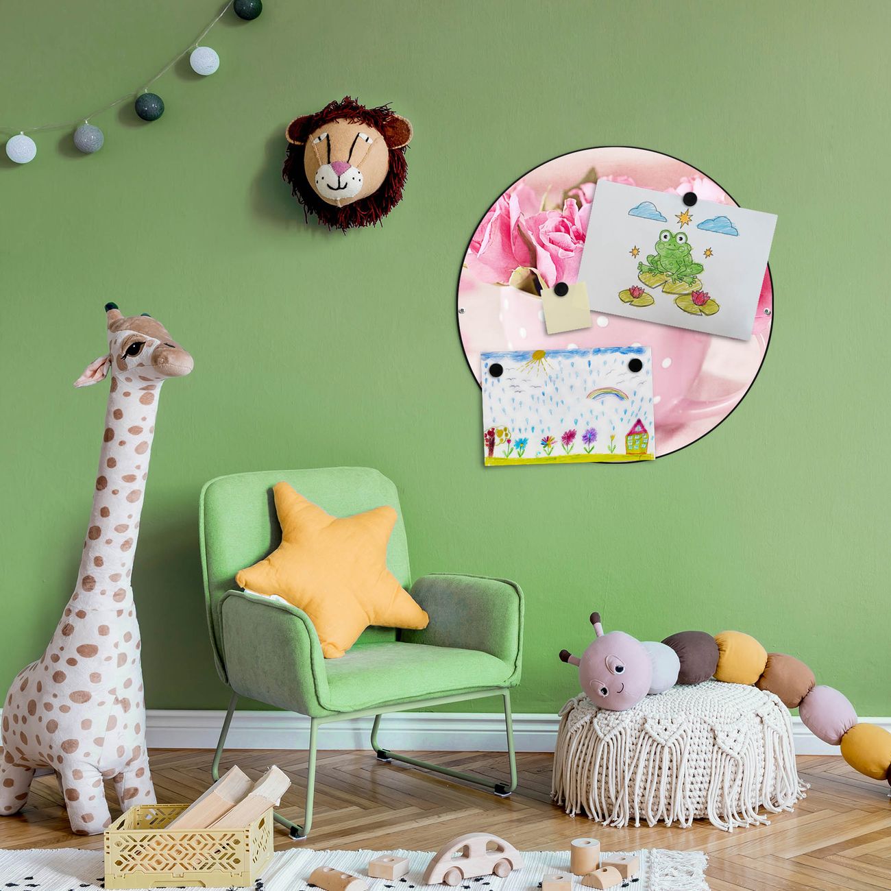 FUNKTION / DESIGN Die banjado Magnettafel mit dem Motiv Motiv Tasse Voll Rosen bringt Ordnung in Ihr Zettelchaos. Fotos, Termine, Notizen oder Rezepte lassen Sich hier stilvoll mit Magneten ordnen, Sie behalten alles im Blick. Die Design Magnetwand ist beschreibbar und wieder abwischbar. Mit dieser Pinnwand haben Sie auch ohne Notizen und Magneten ein schönes Dekoelement. Das Format bietet Ihnen ausreichend Platz um alle wichtigen Informationen im Blick zu behalten. DETAILS / NUTZEN Die magnetische Metall Pinnwand besteht aus schwarz lackiertem Stahl. Sie hat einen Durchmesser von 47cm. Es befinden sich an den Seiten zwei vorgefertigte Löcher die eine schnelle und unkomplizierte Anbringung ermöglichen. Das Motiv ist mit einem seidenmatten Laminat versehen und schützt so zusätzlich vor Kratzern. Es halten alle handelsüblichen Magneten daran. Wir sind ein kleines Team aus dem Herzen von Sachsen. Wir fertigen alle Artikel von Hand für Sie an, Sie erhalten keine preiswerte Importware. Auf Wunsch können Sie auch Ihr eigenes Foto auf die Magnettafel aufbringen, schreiben Sie uns an.
