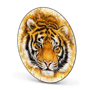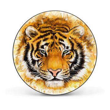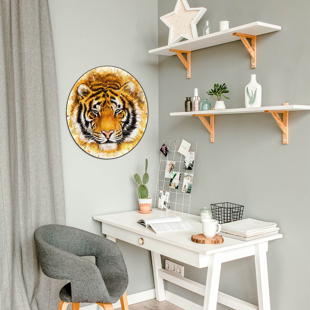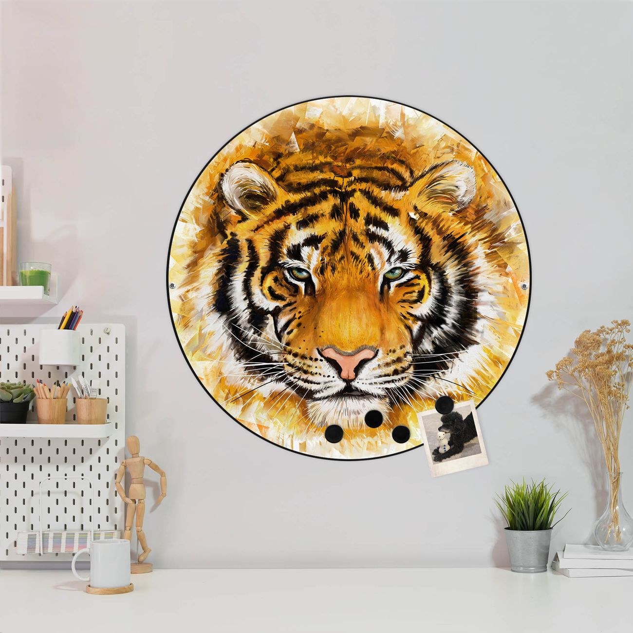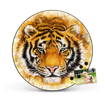 FUNKTION / DESIGN Die banjado Magnettafel mit dem Motiv Motiv Tigerkopf bringt Ordnung in Ihr Zettelchaos. Fotos, Termine, Notizen oder Rezepte lassen Sich hier stilvoll mit Magneten ordnen, Sie behalten alles im Blick. Die Design Magnetwand ist beschreibbar und wieder abwischbar. Mit dieser Pinnwand haben Sie auch ohne Notizen und Magneten ein schönes Dekoelement. Das Format bietet Ihnen ausreichend Platz um alle wichtigen Informationen im Blick zu behalten. DETAILS / NUTZEN Die magnetische Metall Pinnwand besteht aus schwarz lackiertem Stahl. Sie hat einen Durchmesser von 47cm. Es befinden sich an den Seiten zwei vorgefertigte Löcher die eine schnelle und unkomplizierte Anbringung ermöglichen. Das Motiv ist mit einem seidenmatten Laminat versehen und schützt so zusätzlich vor Kratzern. Es halten alle handelsüblichen Magneten daran. Wir sind ein kleines Team aus dem Herzen von Sachsen. Wir fertigen alle Artikel von Hand für Sie an, Sie erhalten keine preiswerte Importware. Auf Wunsch können Sie auch Ihr eigenes Foto auf die Magnettafel aufbringen, schreiben Sie uns an.