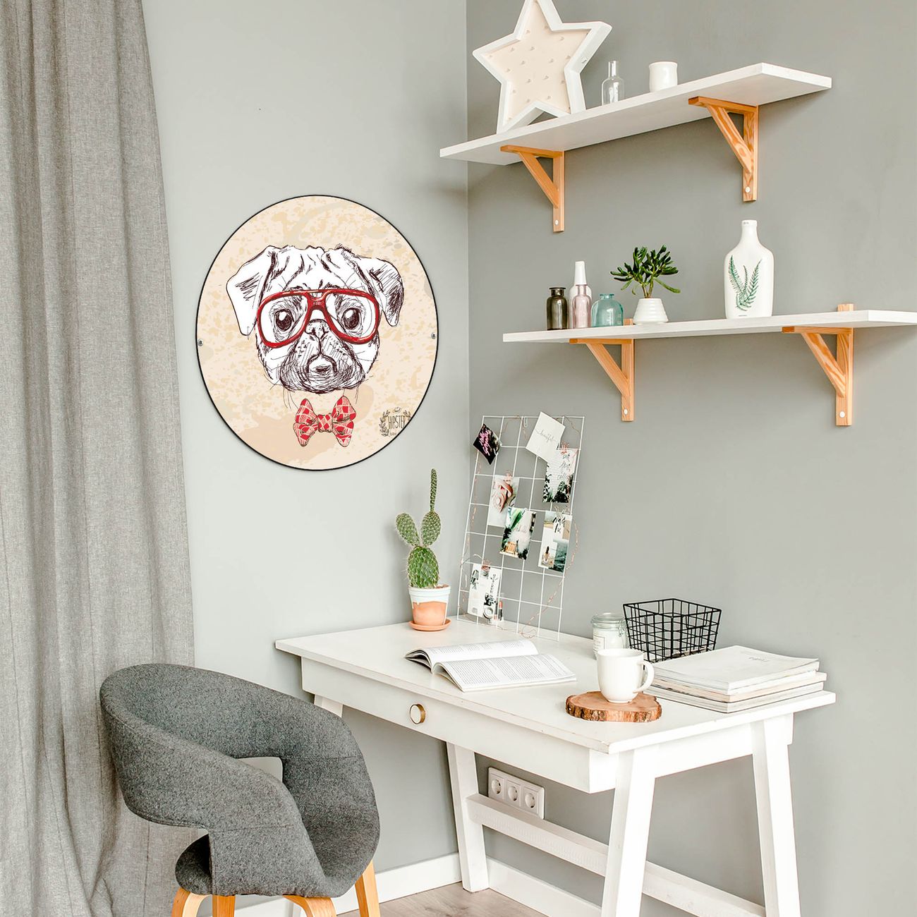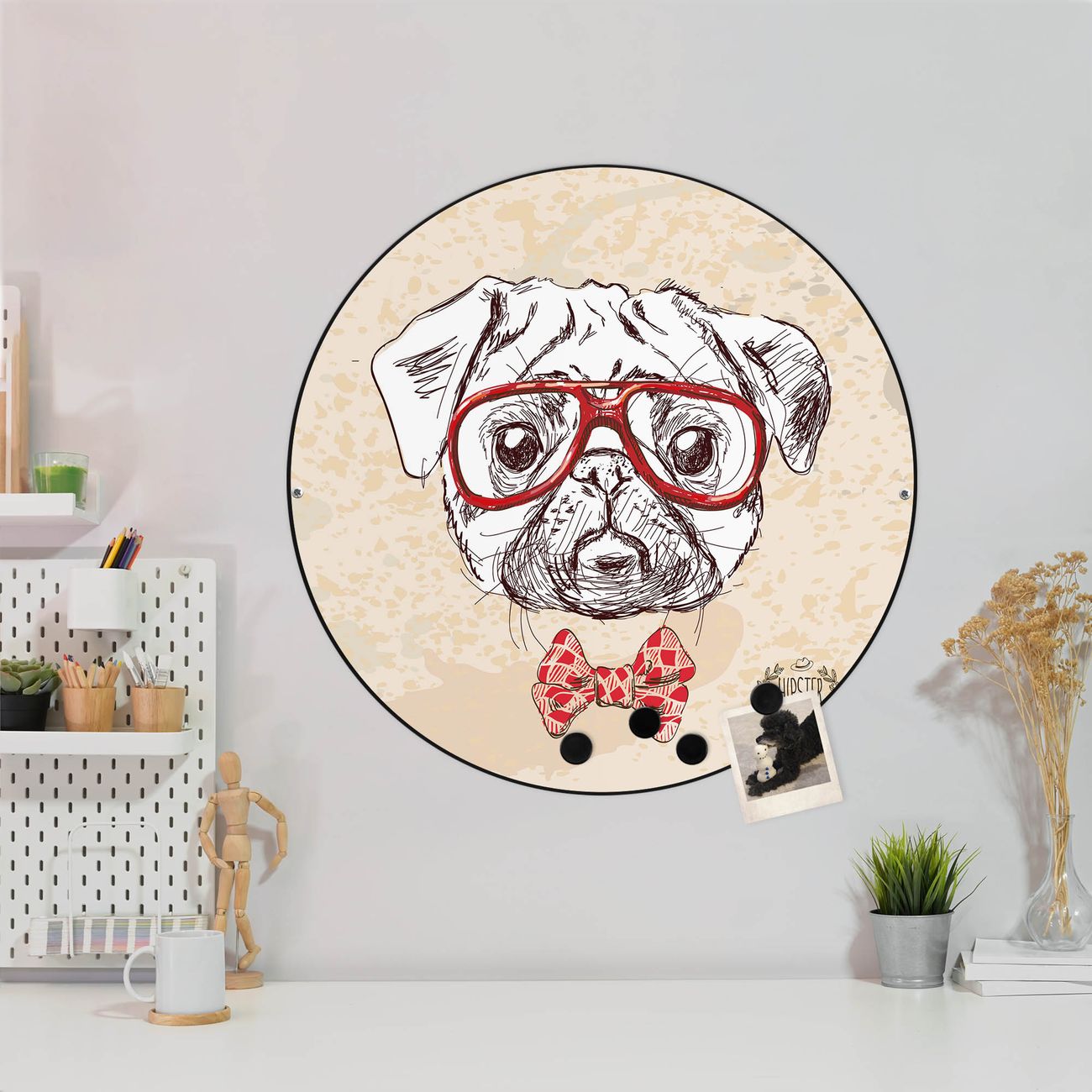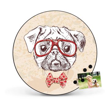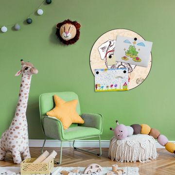 FUNKTION / DESIGN Die banjado Magnettafel mit dem Motiv Motiv Timothy bringt Ordnung in Ihr Zettelchaos. Fotos, Termine, Notizen oder Rezepte lassen Sich hier stilvoll mit Magneten ordnen, Sie behalten alles im Blick. Die Design Magnetwand ist beschreibbar und wieder abwischbar. Mit dieser Pinnwand haben Sie auch ohne Notizen und Magneten ein schönes Dekoelement. Das Format bietet Ihnen ausreichend Platz um alle wichtigen Informationen im Blick zu behalten. DETAILS / NUTZEN Die magnetische Metall Pinnwand besteht aus schwarz lackiertem Stahl. Sie hat einen Durchmesser von 47cm. Es befinden sich an den Seiten zwei vorgefertigte Löcher die eine schnelle und unkomplizierte Anbringung ermöglichen. Das Motiv ist mit einem seidenmatten Laminat versehen und schützt so zusätzlich vor Kratzern. Es halten alle handelsüblichen Magneten daran. Wir sind ein kleines Team aus dem Herzen von Sachsen. Wir fertigen alle Artikel von Hand für Sie an, Sie erhalten keine preiswerte Importware. Auf Wunsch können Sie auch Ihr eigenes Foto auf die Magnettafel aufbringen, schreiben Sie uns an.