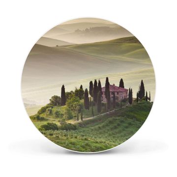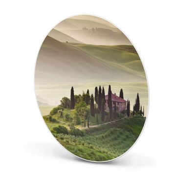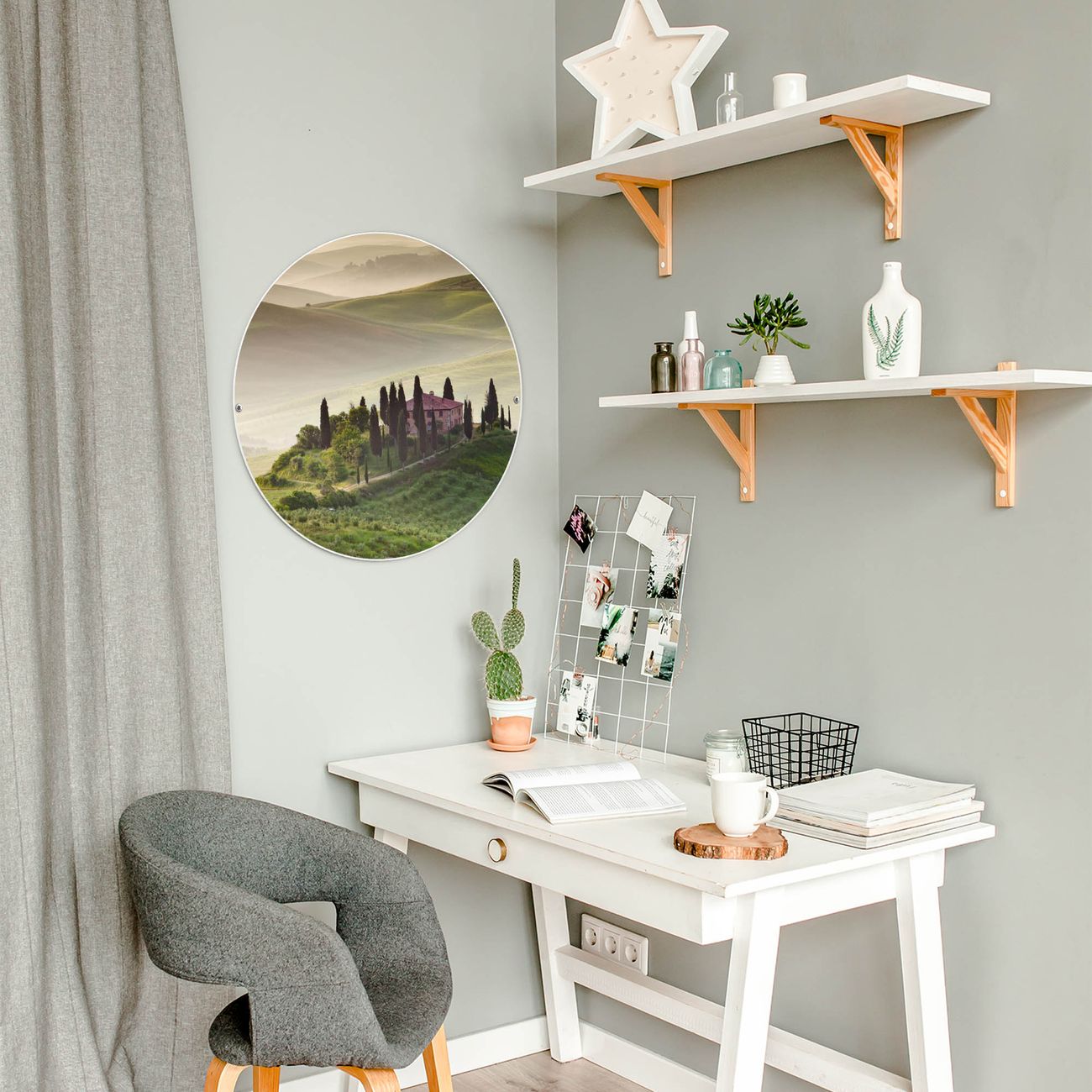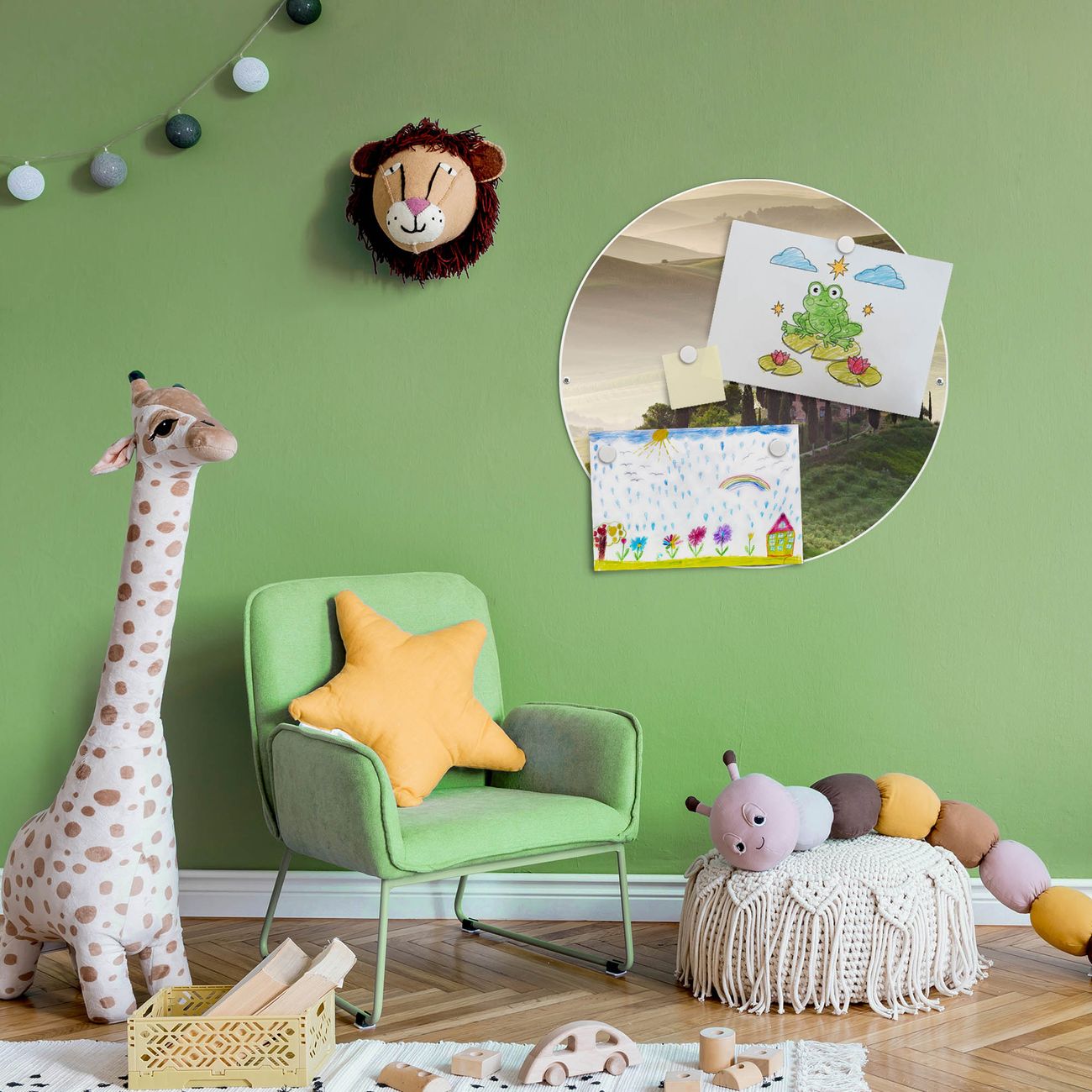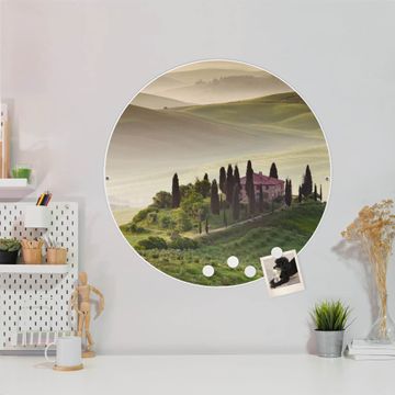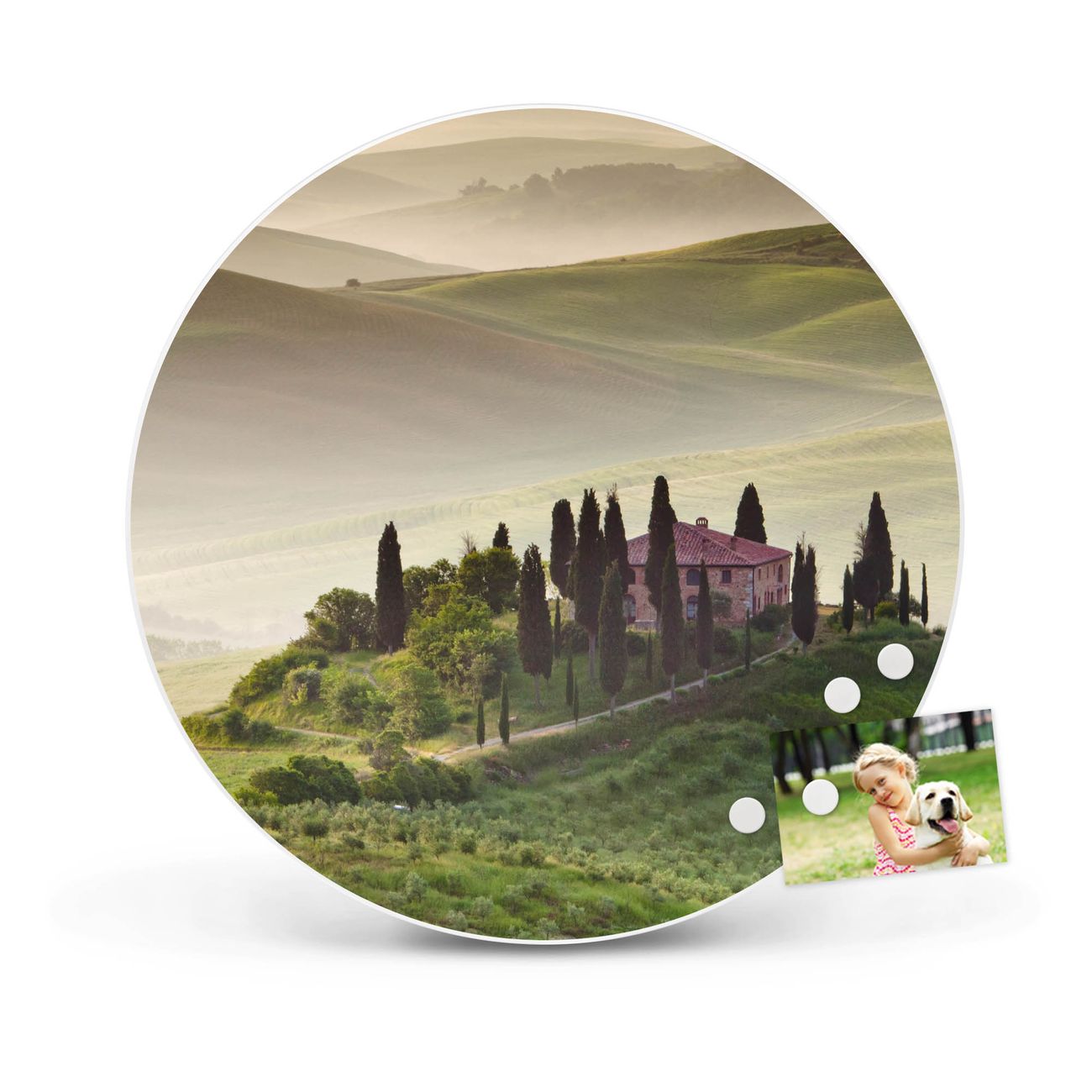FUNKTION / DESIGN Die banjado Magnettafel mit dem Motiv Motiv Toscana bringt Ordnung in Ihr Zettelchaos. Fotos, Termine, Notizen oder Rezepte lassen Sich hier stilvoll mit Magneten ordnen, Sie behalten alles im Blick. Die Design Magnetwand ist beschreibbar und wieder abwischbar. Mit dieser Pinnwand haben Sie auch ohne Notizen und Magneten ein schönes Dekoelement. Das Format bietet Ihnen ausreichend Platz um alle wichtigen Informationen im Blick zu behalten. DETAILS / NUTZEN Die magnetische Metall Pinnwand besteht aus weiß lackiertem Stahl. Sie hat einen Durchmesser von 47cm. Es befinden sich an den Seiten zwei vorgefertigte Löcher die eine schnelle und unkomplizierte Anbringung ermöglichen. Das Motiv ist mit einem seidenmatten Laminat versehen und schützt so zusätzlich vor Kratzern. Es halten alle handelsüblichen Magneten daran. Wir sind ein kleines Team aus dem Herzen von Sachsen. Wir fertigen alle Artikel von Hand für Sie an, Sie erhalten keine preiswerte Importware. Auf Wunsch können Sie auch Ihr eigenes Foto auf die Magnettafel aufbringen, schreiben Sie uns an.