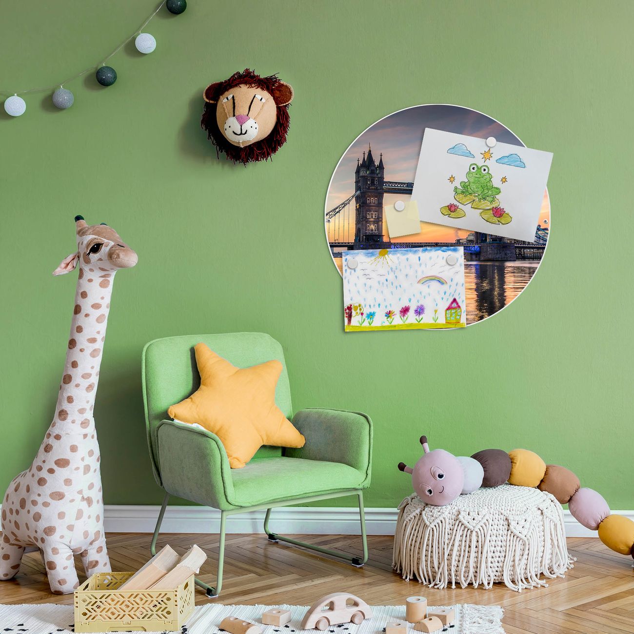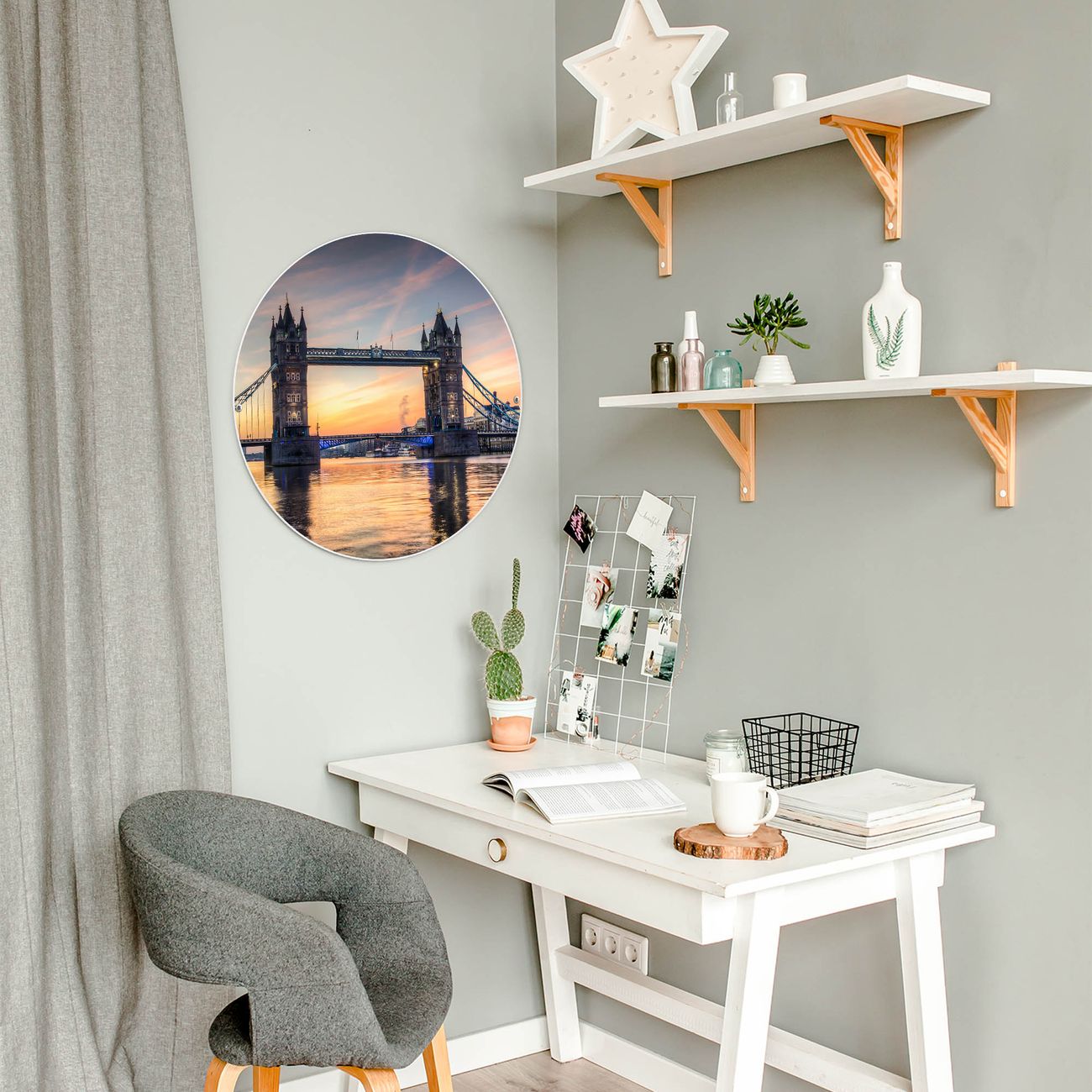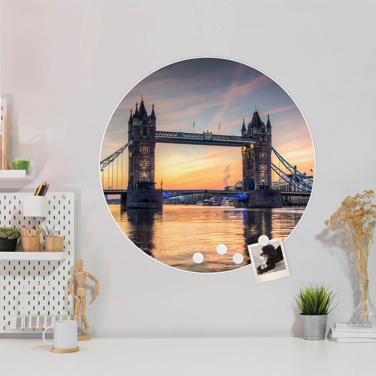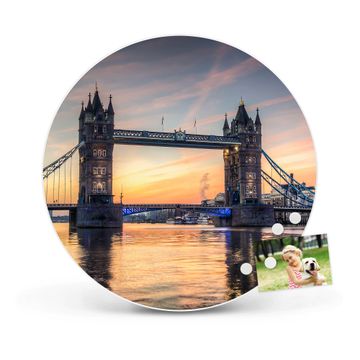 FUNKTION / DESIGN Die banjado Magnettafel mit dem Motiv Tower Bridge bringt Ordnung in Ihr Zettelchaos. Fotos, Termine, Notizen oder Rezepte lassen Sich hier stilvoll mit Magneten ordnen, Sie behalten alles im Blick. Die Design Magnetwand ist beschreibbar und wieder abwischbar. Mit dieser Pinnwand haben Sie auch ohne Notizen und Magneten ein schönes Dekoelement. Das Format bietet Ihnen ausreichend Platz um alle wichtigen Informationen im Blick zu behalten. DETAILS / NUTZEN Die magnetische Metall Pinnwand besteht aus weiß lackiertem Stahl. Sie hat einen Durchmesser von 47cm. Es befinden sich an den Seiten zwei vorgefertigte Löcher die eine schnelle und unkomplizierte Anbringung ermöglichen. Das Motiv ist mit einem seidenmatten Laminat versehen und schützt so zusätzlich vor Kratzern. Es halten alle handelsüblichen Magneten daran. Wir sind ein kleines Team aus dem Herzen von Sachsen. Wir fertigen alle Artikel von Hand für Sie an, Sie erhalten keine preiswerte Importware. Auf Wunsch können Sie auch Ihr eigenes Foto auf die Magnettafel aufbringen, schreiben Sie uns an.
