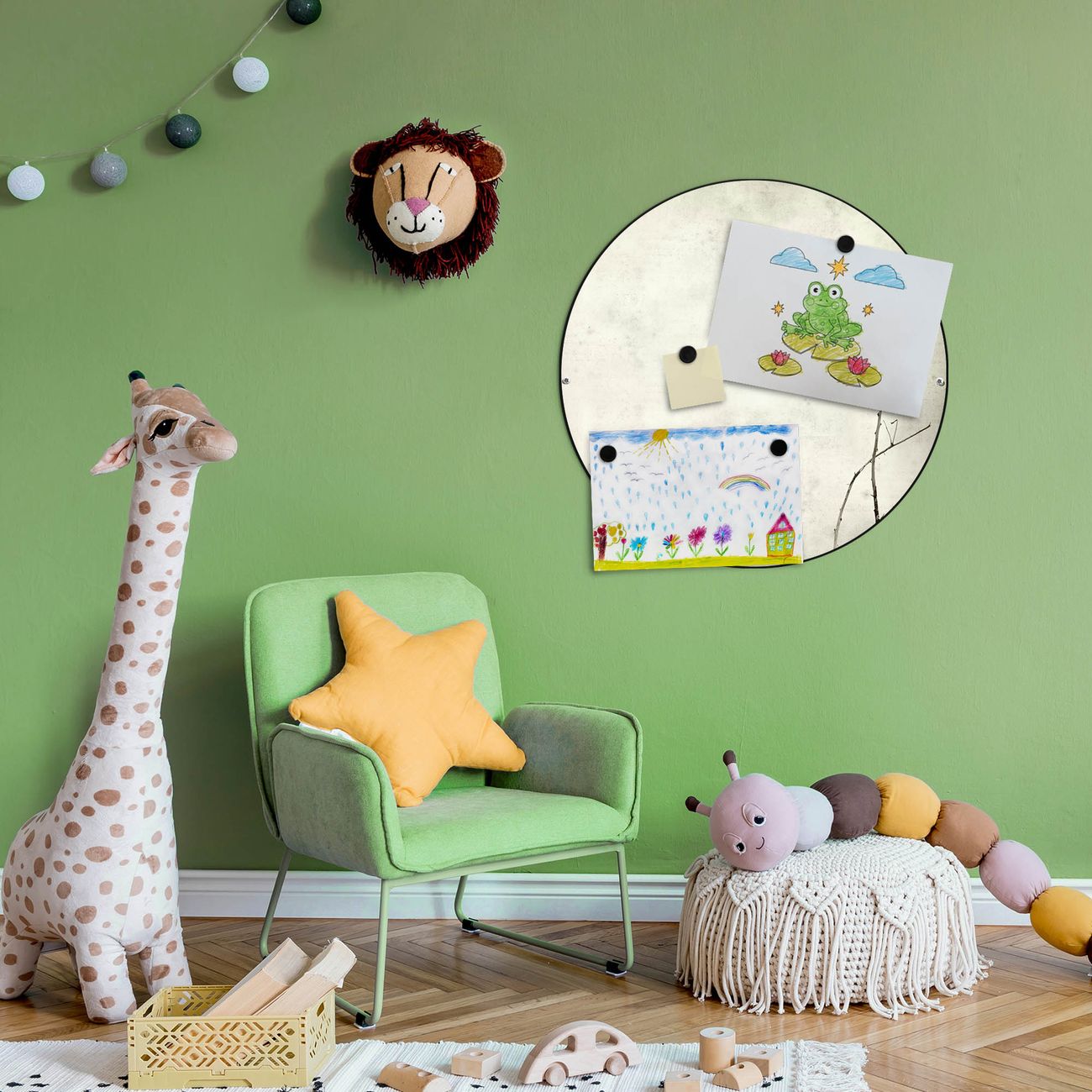 FUNKTION / DESIGN Die banjado Magnettafel mit dem Motiv Motiv Tristessa bringt Ordnung in Ihr Zettelchaos. Fotos, Termine, Notizen oder Rezepte lassen Sich hier stilvoll mit Magneten ordnen, Sie behalten alles im Blick. Die Design Magnetwand ist beschreibbar und wieder abwischbar. Mit dieser Pinnwand haben Sie auch ohne Notizen und Magneten ein schönes Dekoelement. Das Format bietet Ihnen ausreichend Platz um alle wichtigen Informationen im Blick zu behalten. DETAILS / NUTZEN Die magnetische Metall Pinnwand besteht aus schwarz lackiertem Stahl. Sie hat einen Durchmesser von 47cm. Es befinden sich an den Seiten zwei vorgefertigte Löcher die eine schnelle und unkomplizierte Anbringung ermöglichen. Das Motiv ist mit einem seidenmatten Laminat versehen und schützt so zusätzlich vor Kratzern. Es halten alle handelsüblichen Magneten daran. Wir sind ein kleines Team aus dem Herzen von Sachsen. Wir fertigen alle Artikel von Hand für Sie an, Sie erhalten keine preiswerte Importware. Auf Wunsch können Sie auch Ihr eigenes Foto auf die Magnettafel aufbringen, schreiben Sie uns an.