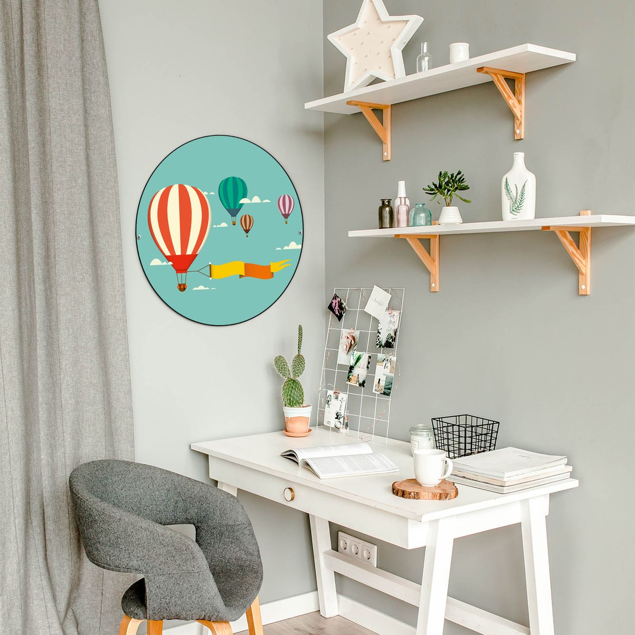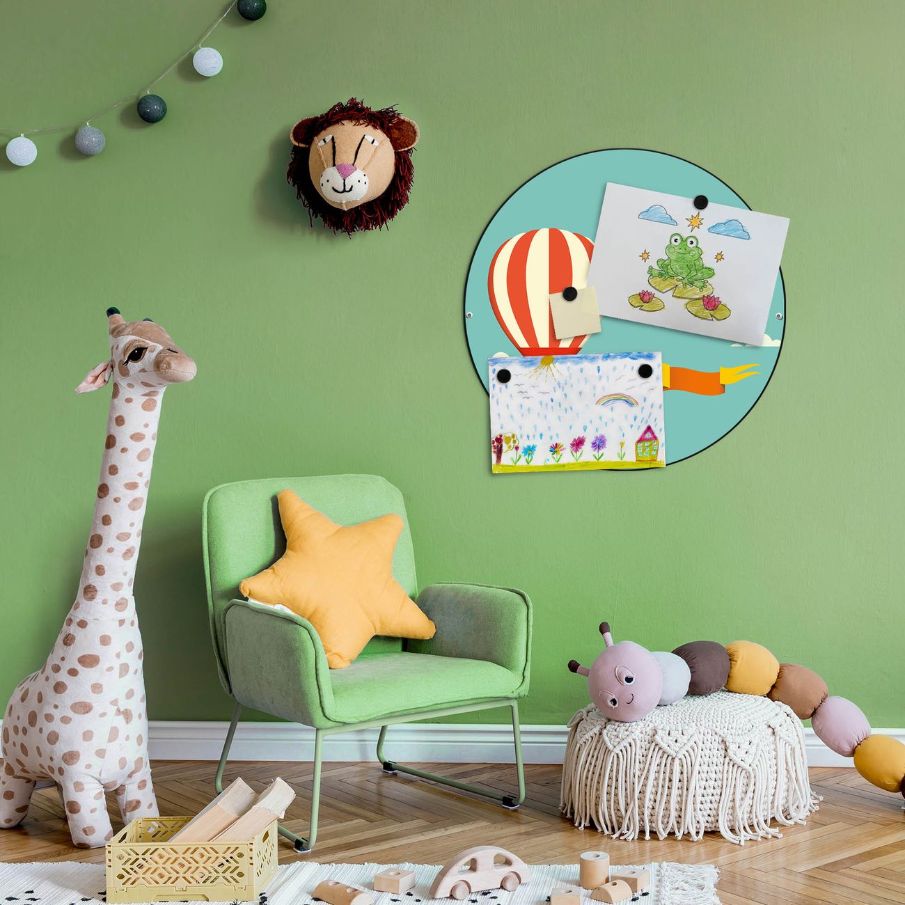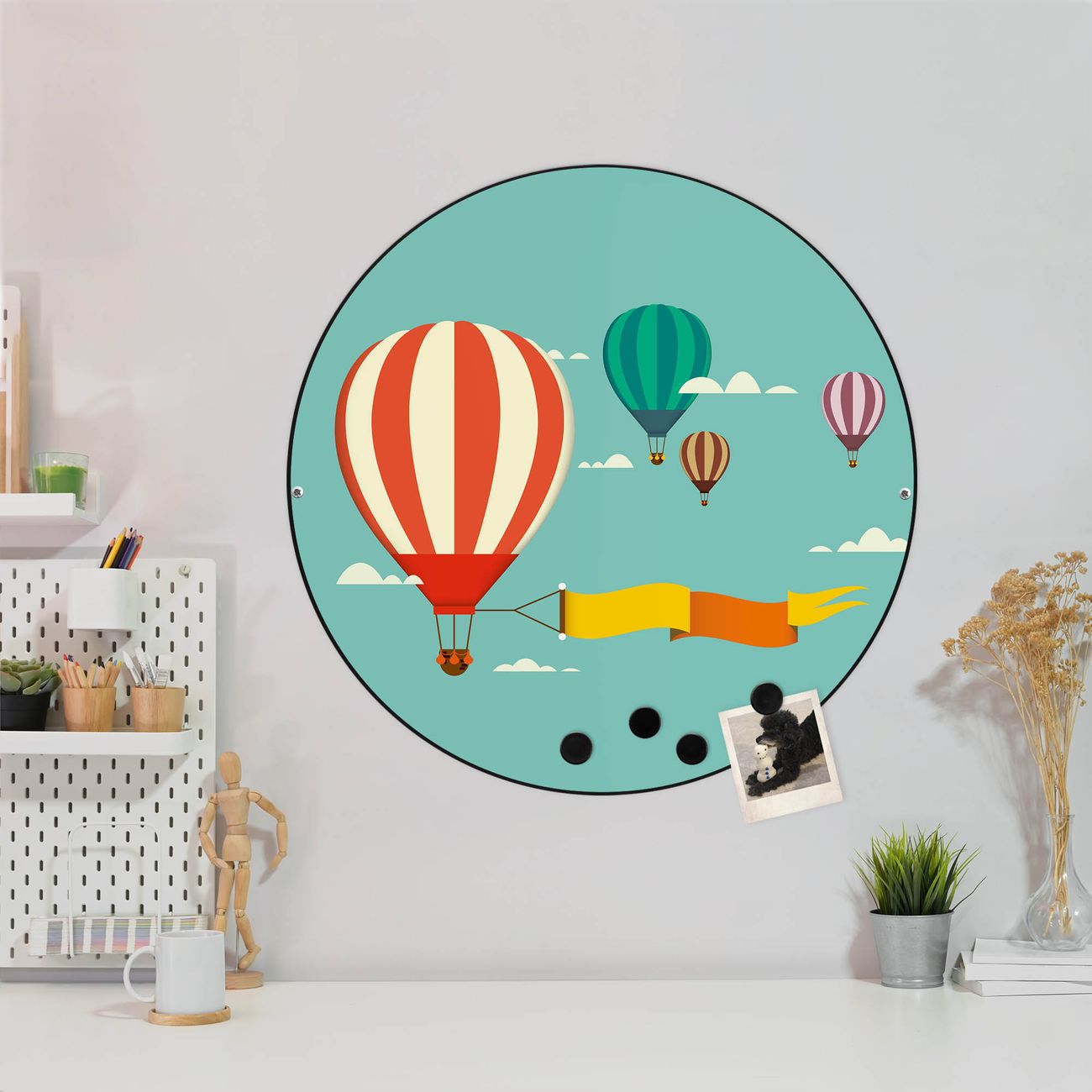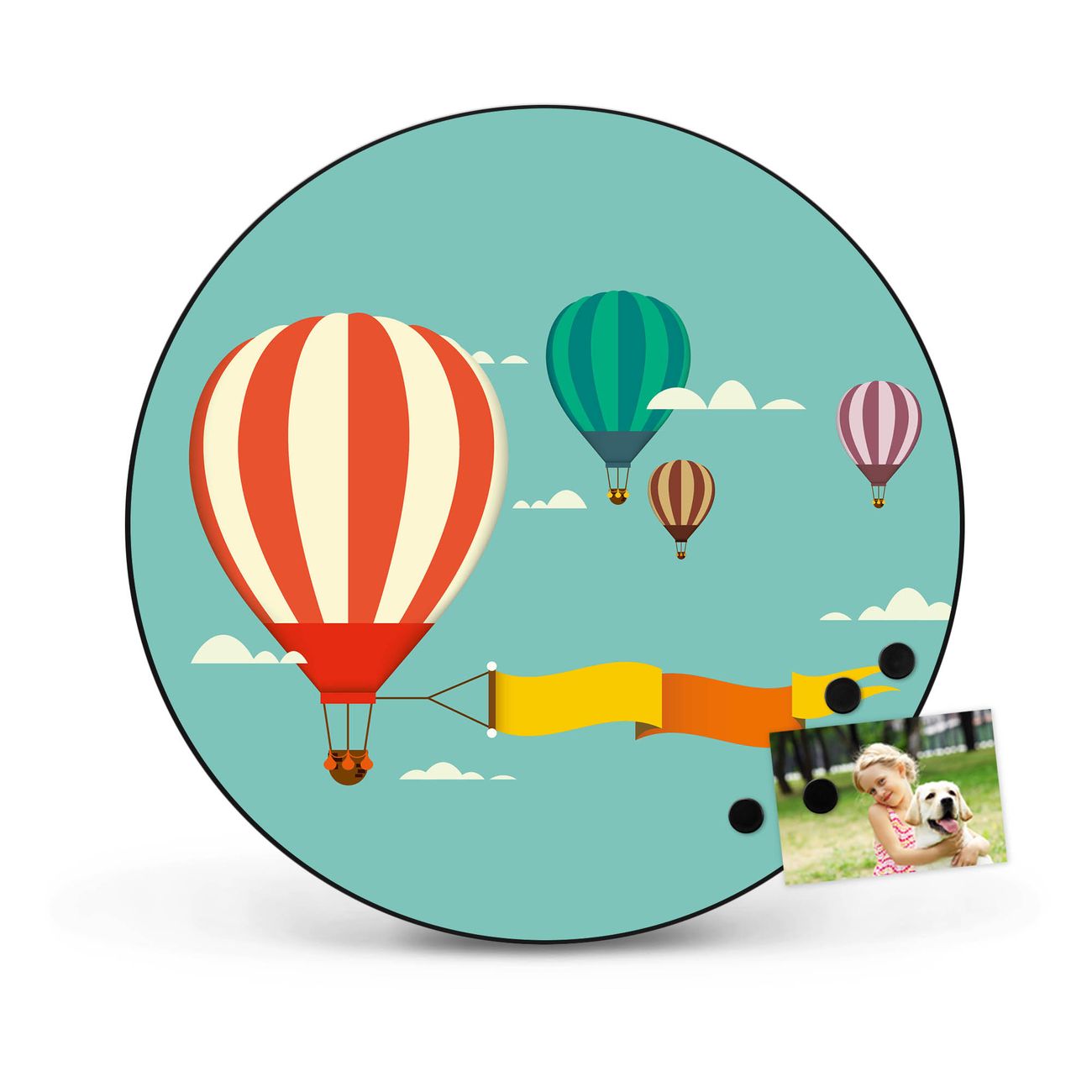 FUNKTION / DESIGN Die banjado Magnettafel mit dem Motiv Motiv Vier Ballons bringt Ordnung in Ihr Zettelchaos. Fotos, Termine, Notizen oder Rezepte lassen Sich hier stilvoll mit Magneten ordnen, Sie behalten alles im Blick. Die Design Magnetwand ist beschreibbar und wieder abwischbar. Mit dieser Pinnwand haben Sie auch ohne Notizen und Magneten ein schönes Dekoelement. Das Format bietet Ihnen ausreichend Platz um alle wichtigen Informationen im Blick zu behalten. DETAILS / NUTZEN Die magnetische Metall Pinnwand besteht aus schwarz lackiertem Stahl. Sie hat einen Durchmesser von 47cm. Es befinden sich an den Seiten zwei vorgefertigte Löcher die eine schnelle und unkomplizierte Anbringung ermöglichen. Das Motiv ist mit einem seidenmatten Laminat versehen und schützt so zusätzlich vor Kratzern. Es halten alle handelsüblichen Magneten daran. Wir sind ein kleines Team aus dem Herzen von Sachsen. Wir fertigen alle Artikel von Hand für Sie an, Sie erhalten keine preiswerte Importware. Auf Wunsch können Sie auch Ihr eigenes Foto auf die Magnettafel aufbringen, schreiben Sie uns an.