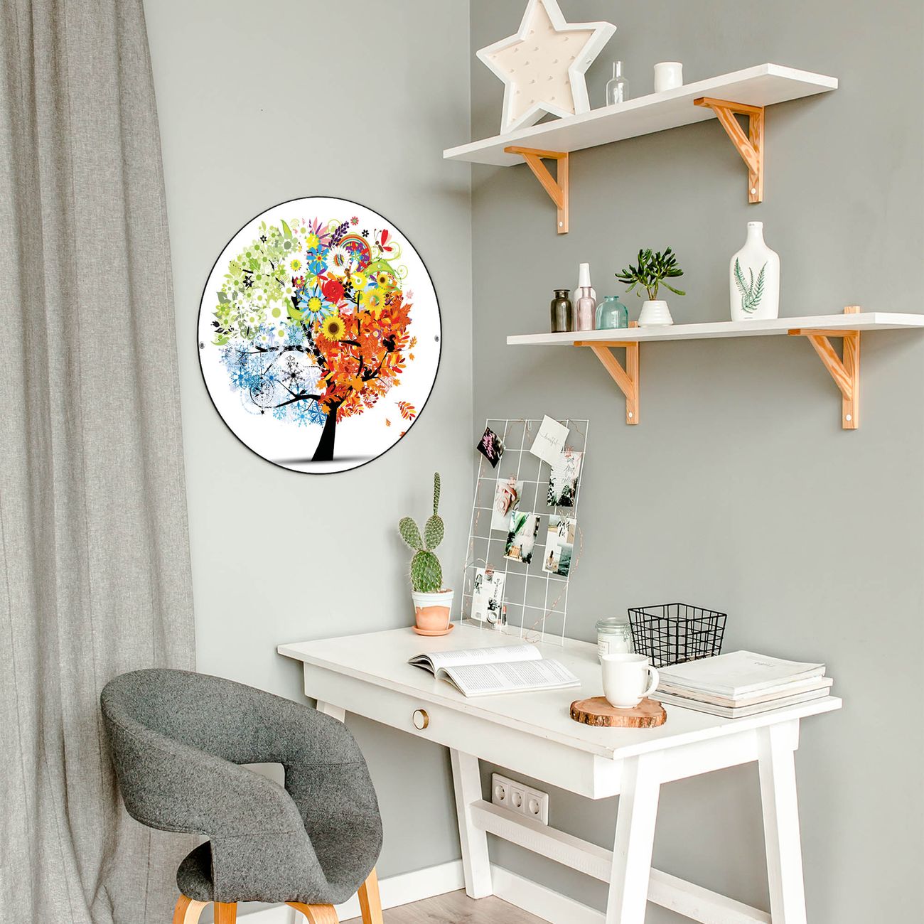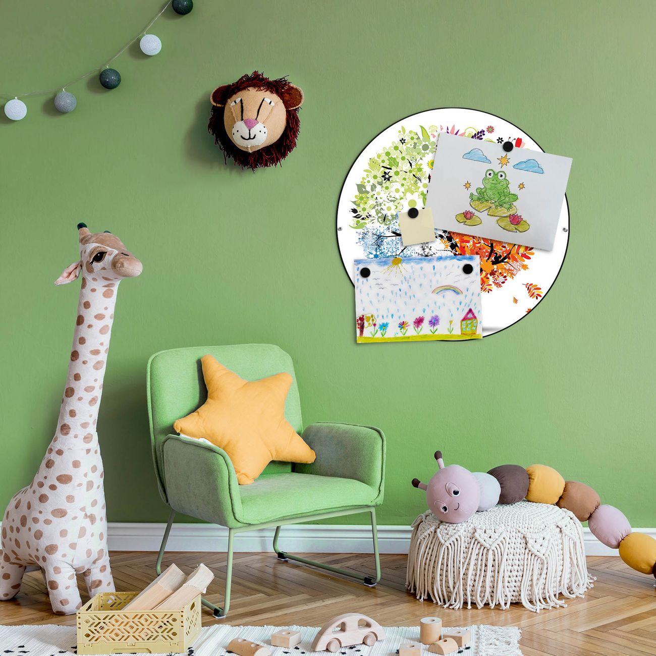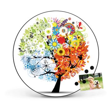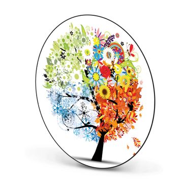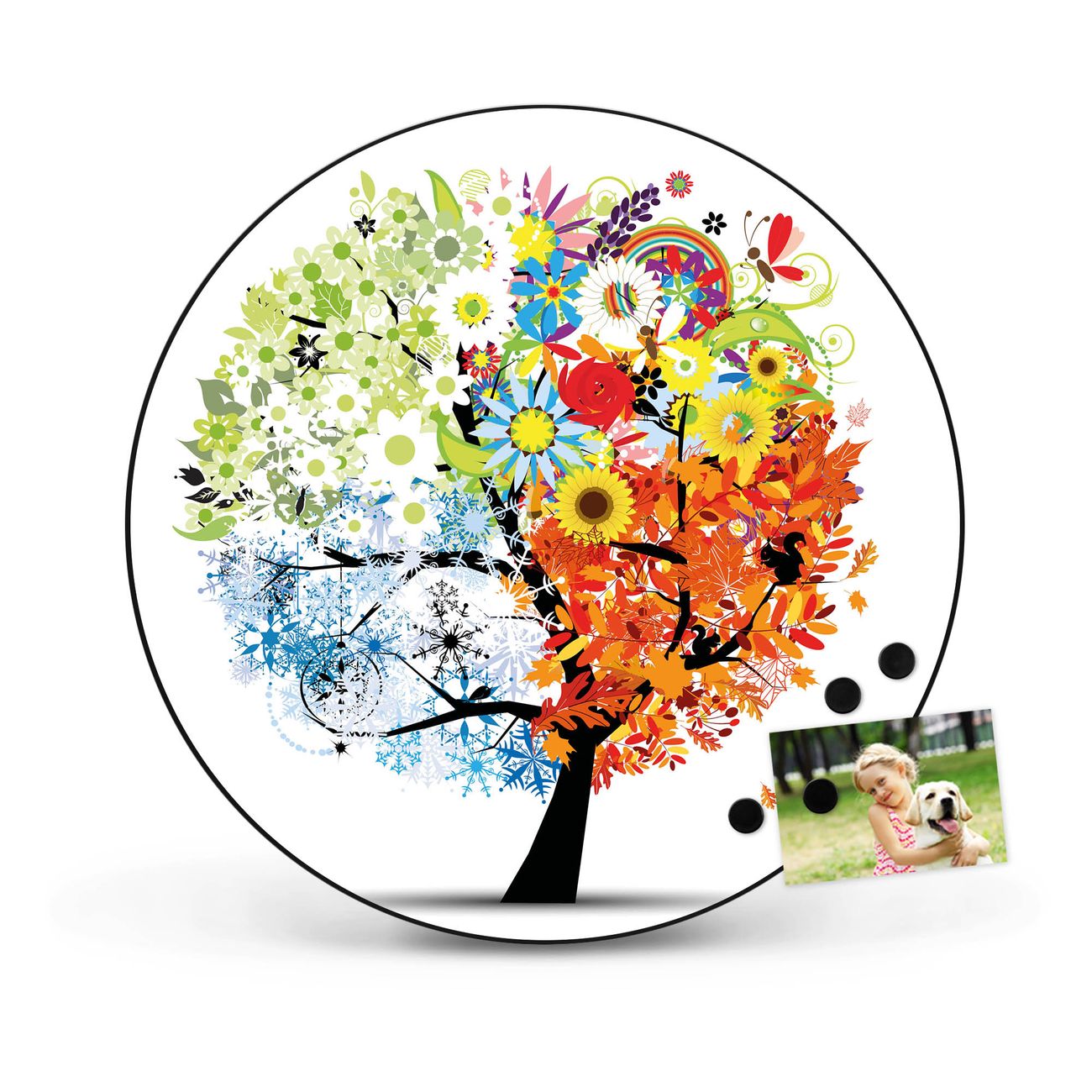 FUNKTION / DESIGN Die banjado Magnettafel mit dem Motiv Motiv Vier Jahreszeiten bringt Ordnung in Ihr Zettelchaos. Fotos, Termine, Notizen oder Rezepte lassen Sich hier stilvoll mit Magneten ordnen, Sie behalten alles im Blick. Die Design Magnetwand ist beschreibbar und wieder abwischbar. Mit dieser Pinnwand haben Sie auch ohne Notizen und Magneten ein schönes Dekoelement. Das Format bietet Ihnen ausreichend Platz um alle wichtigen Informationen im Blick zu behalten. DETAILS / NUTZEN Die magnetische Metall Pinnwand besteht aus schwarz lackiertem Stahl. Sie hat einen Durchmesser von 47cm. Es befinden sich an den Seiten zwei vorgefertigte Löcher die eine schnelle und unkomplizierte Anbringung ermöglichen. Das Motiv ist mit einem seidenmatten Laminat versehen und schützt so zusätzlich vor Kratzern. Es halten alle handelsüblichen Magneten daran. Wir sind ein kleines Team aus dem Herzen von Sachsen. Wir fertigen alle Artikel von Hand für Sie an, Sie erhalten keine preiswerte Importware. Auf Wunsch können Sie auch Ihr eigenes Foto auf die Magnettafel aufbringen, schreiben Sie uns an.