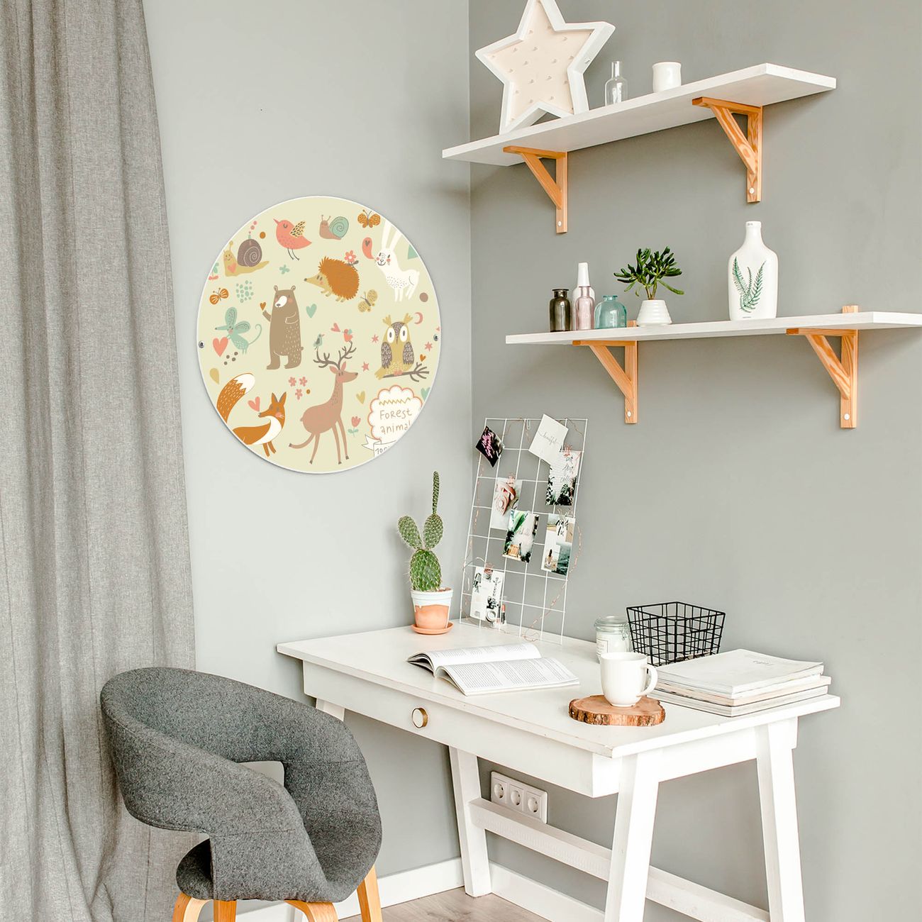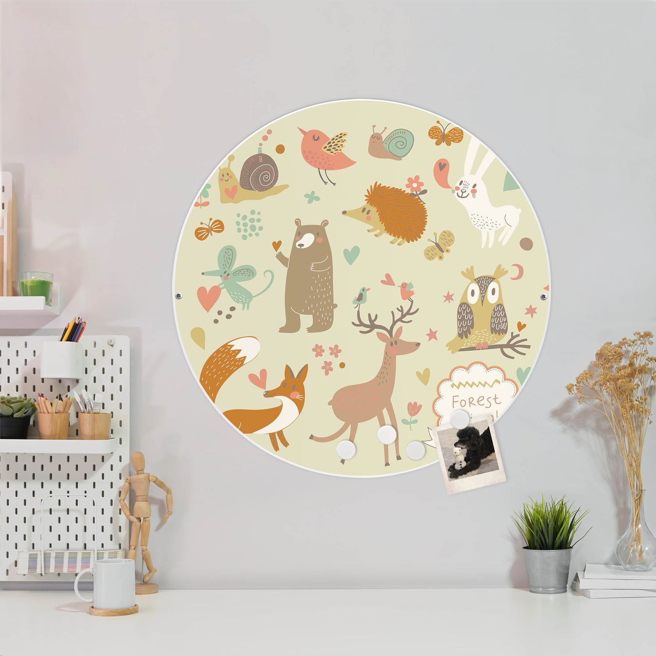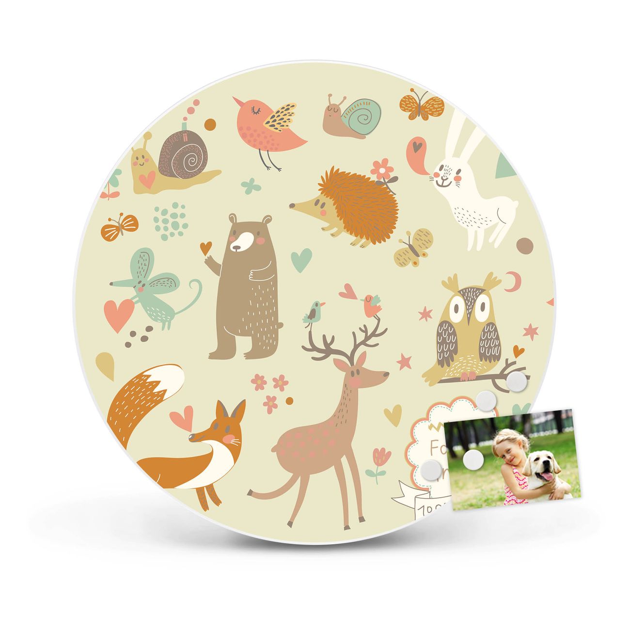 FUNKTION / DESIGN Die banjado Magnettafel mit dem Motiv Motiv Waldtiere bringt Ordnung in Ihr Zettelchaos. Fotos, Termine, Notizen oder Rezepte lassen Sich hier stilvoll mit Magneten ordnen, Sie behalten alles im Blick. Die Design Magnetwand ist beschreibbar und wieder abwischbar. Mit dieser Pinnwand haben Sie auch ohne Notizen und Magneten ein schönes Dekoelement. Das Format bietet Ihnen ausreichend Platz um alle wichtigen Informationen im Blick zu behalten. DETAILS / NUTZEN Die magnetische Metall Pinnwand besteht aus weiß lackiertem Stahl. Sie hat einen Durchmesser von 47cm. Es befinden sich an den Seiten zwei vorgefertigte Löcher die eine schnelle und unkomplizierte Anbringung ermöglichen. Das Motiv ist mit einem seidenmatten Laminat versehen und schützt so zusätzlich vor Kratzern. Es halten alle handelsüblichen Magneten daran. Wir sind ein kleines Team aus dem Herzen von Sachsen. Wir fertigen alle Artikel von Hand für Sie an, Sie erhalten keine preiswerte Importware. Auf Wunsch können Sie auch Ihr eigenes Foto auf die Magnettafel aufbringen, schreiben Sie uns an.