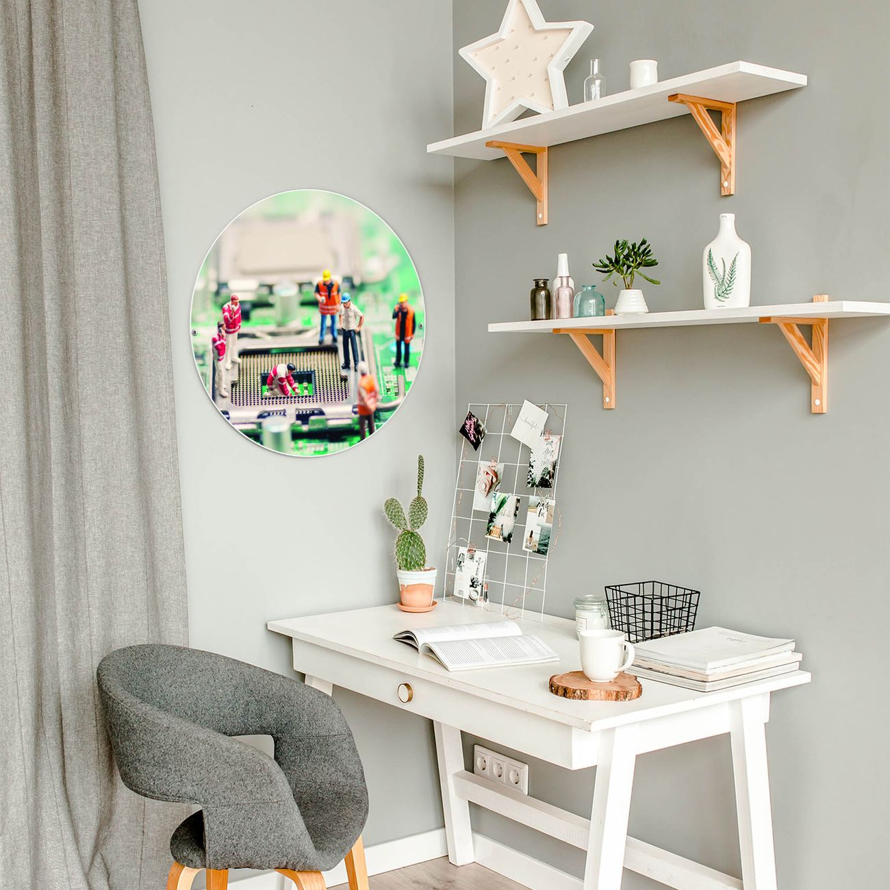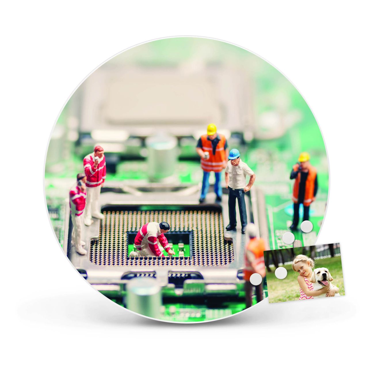 FUNKTION / DESIGN Die banjado Magnettafel mit dem Motiv Motiv Wartungsarbeiten bringt Ordnung in Ihr Zettelchaos. Fotos, Termine, Notizen oder Rezepte lassen Sich hier stilvoll mit Magneten ordnen, Sie behalten alles im Blick. Die Design Magnetwand ist beschreibbar und wieder abwischbar. Mit dieser Pinnwand haben Sie auch ohne Notizen und Magneten ein schönes Dekoelement. Das Format bietet Ihnen ausreichend Platz um alle wichtigen Informationen im Blick zu behalten. DETAILS / NUTZEN Die magnetische Metall Pinnwand besteht aus weiß lackiertem Stahl. Sie hat einen Durchmesser von 47cm. Es befinden sich an den Seiten zwei vorgefertigte Löcher die eine schnelle und unkomplizierte Anbringung ermöglichen. Das Motiv ist mit einem seidenmatten Laminat versehen und schützt so zusätzlich vor Kratzern. Es halten alle handelsüblichen Magneten daran. Wir sind ein kleines Team aus dem Herzen von Sachsen. Wir fertigen alle Artikel von Hand für Sie an, Sie erhalten keine preiswerte Importware. Auf Wunsch können Sie auch Ihr eigenes Foto auf die Magnettafel aufbringen, schreiben Sie uns an.