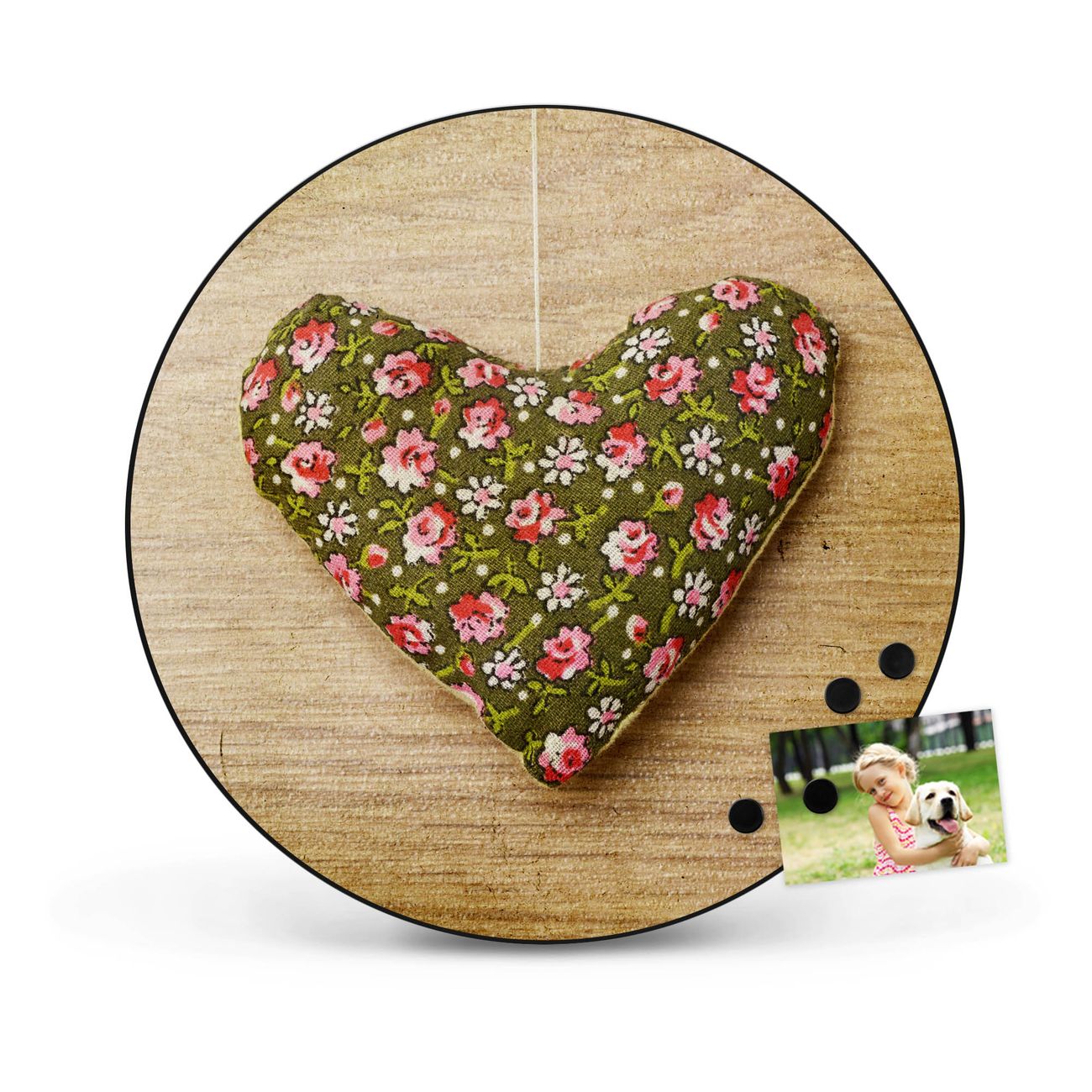 FUNKTION / DESIGN Die banjado Magnettafel mit dem Motiv Motiv Weiches Herz bringt Ordnung in Ihr Zettelchaos. Fotos, Termine, Notizen oder Rezepte lassen Sich hier stilvoll mit Magneten ordnen, Sie behalten alles im Blick. Die Design Magnetwand ist beschreibbar und wieder abwischbar. Mit dieser Pinnwand haben Sie auch ohne Notizen und Magneten ein schönes Dekoelement. Das Format bietet Ihnen ausreichend Platz um alle wichtigen Informationen im Blick zu behalten. DETAILS / NUTZEN Die magnetische Metall Pinnwand besteht aus schwarz lackiertem Stahl. Sie hat einen Durchmesser von 47cm. Es befinden sich an den Seiten zwei vorgefertigte Löcher die eine schnelle und unkomplizierte Anbringung ermöglichen. Das Motiv ist mit einem seidenmatten Laminat versehen und schützt so zusätzlich vor Kratzern. Es halten alle handelsüblichen Magneten daran. Wir sind ein kleines Team aus dem Herzen von Sachsen. Wir fertigen alle Artikel von Hand für Sie an, Sie erhalten keine preiswerte Importware. Auf Wunsch können Sie auch Ihr eigenes Foto auf die Magnettafel aufbringen, schreiben Sie uns an.