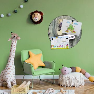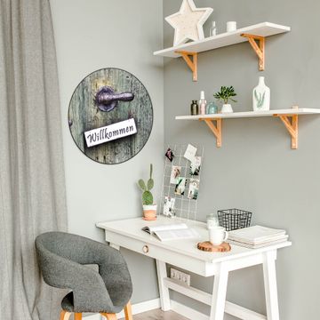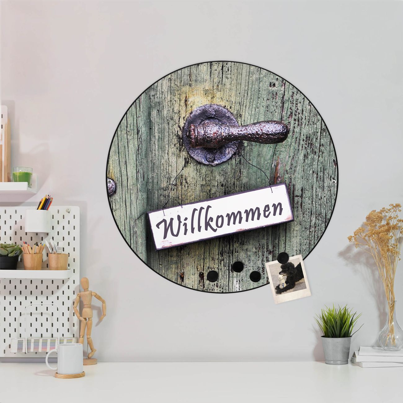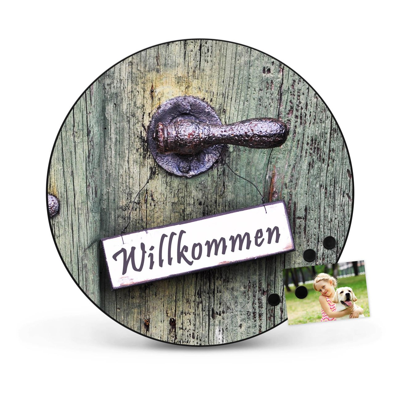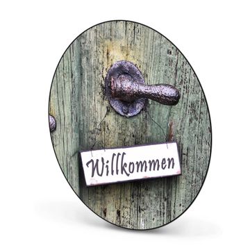 FUNKTION / DESIGN Die banjado Magnettafel mit dem Motiv Motiv Willkommen bringt Ordnung in Ihr Zettelchaos. Fotos, Termine, Notizen oder Rezepte lassen Sich hier stilvoll mit Magneten ordnen, Sie behalten alles im Blick. Die Design Magnetwand ist beschreibbar und wieder abwischbar. Mit dieser Pinnwand haben Sie auch ohne Notizen und Magneten ein schönes Dekoelement. Das Format bietet Ihnen ausreichend Platz um alle wichtigen Informationen im Blick zu behalten. DETAILS / NUTZEN Die magnetische Metall Pinnwand besteht aus schwarz lackiertem Stahl. Sie hat einen Durchmesser von 47cm. Es befinden sich an den Seiten zwei vorgefertigte Löcher die eine schnelle und unkomplizierte Anbringung ermöglichen. Das Motiv ist mit einem seidenmatten Laminat versehen und schützt so zusätzlich vor Kratzern. Es halten alle handelsüblichen Magneten daran. Wir sind ein kleines Team aus dem Herzen von Sachsen. Wir fertigen alle Artikel von Hand für Sie an, Sie erhalten keine preiswerte Importware. Auf Wunsch können Sie auch Ihr eigenes Foto auf die Magnettafel aufbringen, schreiben Sie uns an.