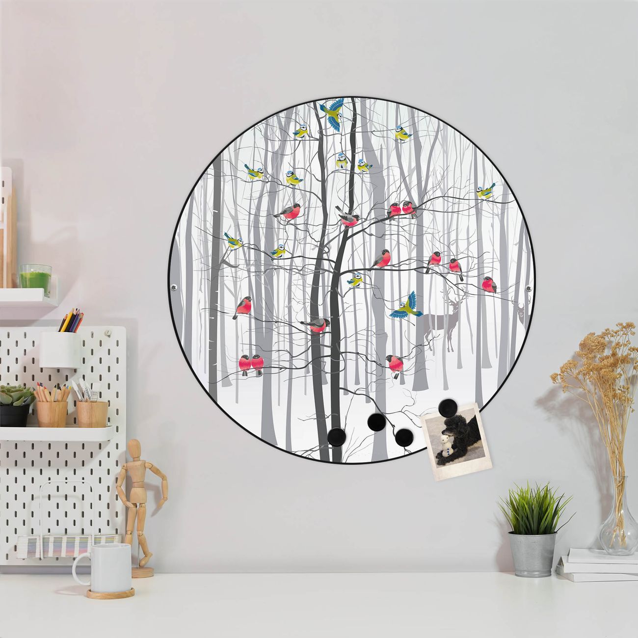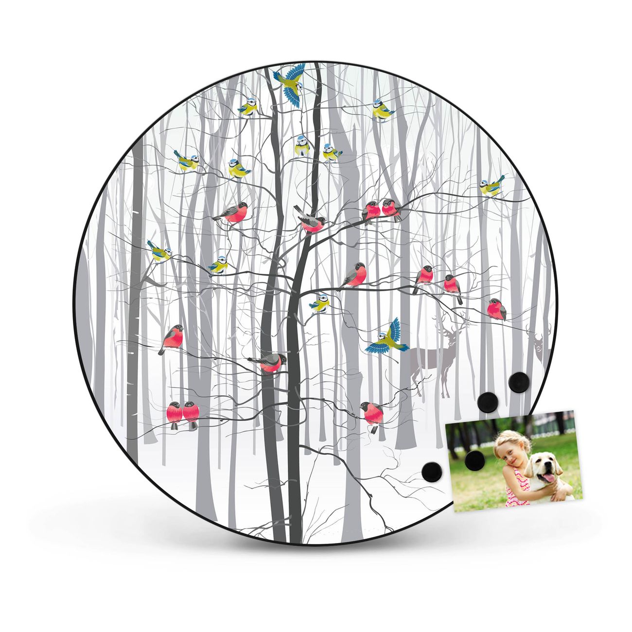 FUNKTION / DESIGN Die banjado Magnettafel mit dem Motiv Motiv Winterwald bringt Ordnung in Ihr Zettelchaos. Fotos, Termine, Notizen oder Rezepte lassen Sich hier stilvoll mit Magneten ordnen, Sie behalten alles im Blick. Die Design Magnetwand ist beschreibbar und wieder abwischbar. Mit dieser Pinnwand haben Sie auch ohne Notizen und Magneten ein schönes Dekoelement. Das Format bietet Ihnen ausreichend Platz um alle wichtigen Informationen im Blick zu behalten. DETAILS / NUTZEN Die magnetische Metall Pinnwand besteht aus schwarz lackiertem Stahl. Sie hat einen Durchmesser von 47cm. Es befinden sich an den Seiten zwei vorgefertigte Löcher die eine schnelle und unkomplizierte Anbringung ermöglichen. Das Motiv ist mit einem seidenmatten Laminat versehen und schützt so zusätzlich vor Kratzern. Es halten alle handelsüblichen Magneten daran. Wir sind ein kleines Team aus dem Herzen von Sachsen. Wir fertigen alle Artikel von Hand für Sie an, Sie erhalten keine preiswerte Importware. Auf Wunsch können Sie auch Ihr eigenes Foto auf die Magnettafel aufbringen, schreiben Sie uns an.