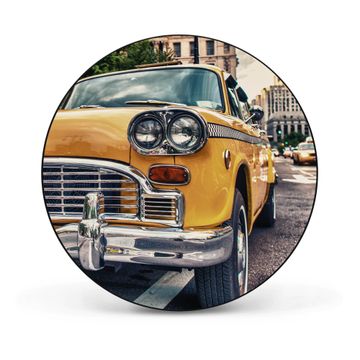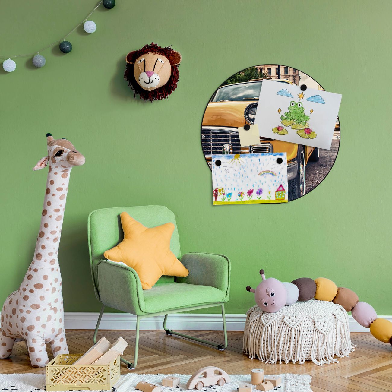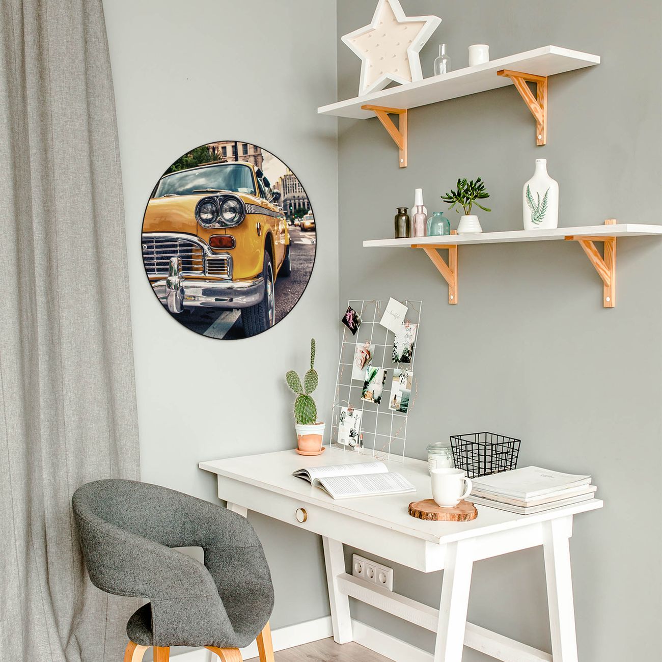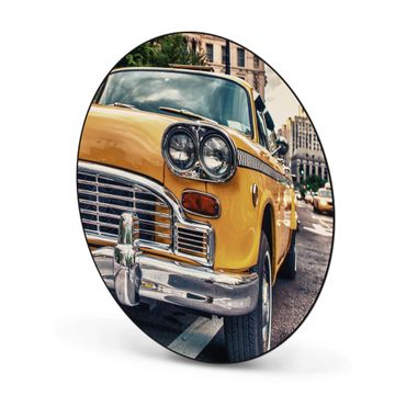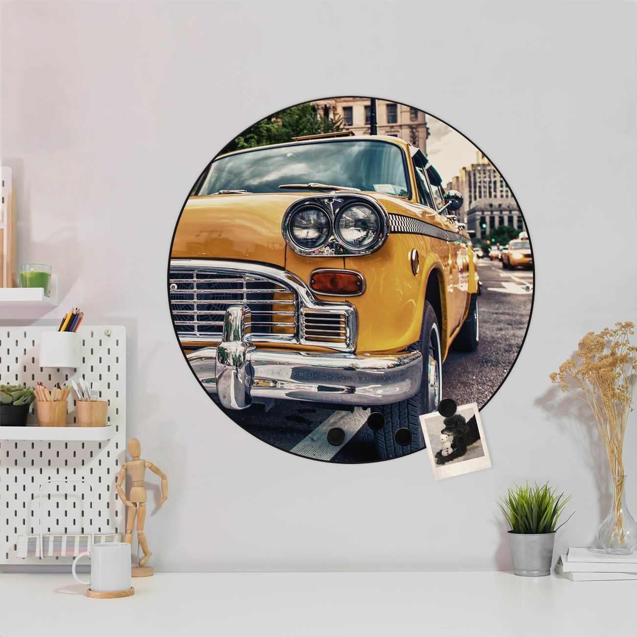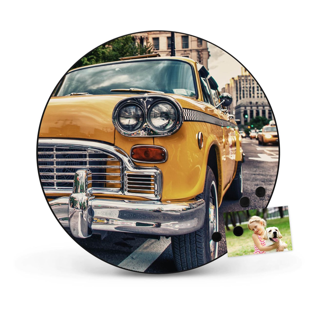 FUNKTION / DESIGN Die banjado Magnettafel mit dem Motiv Motiv Yellow Cab bringt Ordnung in Ihr Zettelchaos. Fotos, Termine, Notizen oder Rezepte lassen Sich hier stilvoll mit Magneten ordnen, Sie behalten alles im Blick. Die Design Magnetwand ist beschreibbar und wieder abwischbar. Mit dieser Pinnwand haben Sie auch ohne Notizen und Magneten ein schönes Dekoelement. Das Format bietet Ihnen ausreichend Platz um alle wichtigen Informationen im Blick zu behalten. DETAILS / NUTZEN Die magnetische Metall Pinnwand besteht aus schwarz lackiertem Stahl. Sie hat einen Durchmesser von 47cm. Es befinden sich an den Seiten zwei vorgefertigte Löcher die eine schnelle und unkomplizierte Anbringung ermöglichen. Das Motiv ist mit einem seidenmatten Laminat versehen und schützt so zusätzlich vor Kratzern. Es halten alle handelsüblichen Magneten daran. Wir sind ein kleines Team aus dem Herzen von Sachsen. Wir fertigen alle Artikel von Hand für Sie an, Sie erhalten keine preiswerte Importware. Auf Wunsch können Sie auch Ihr eigenes Foto auf die Magnettafel aufbringen, schreiben Sie uns an.