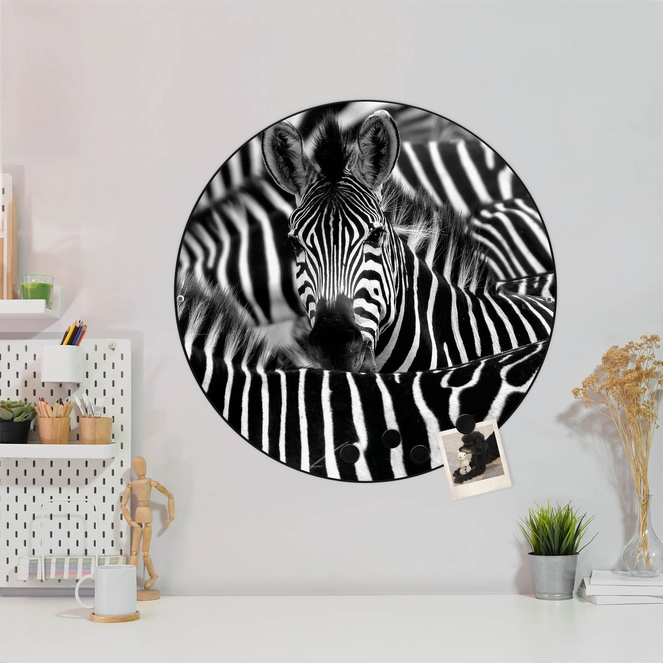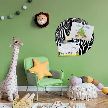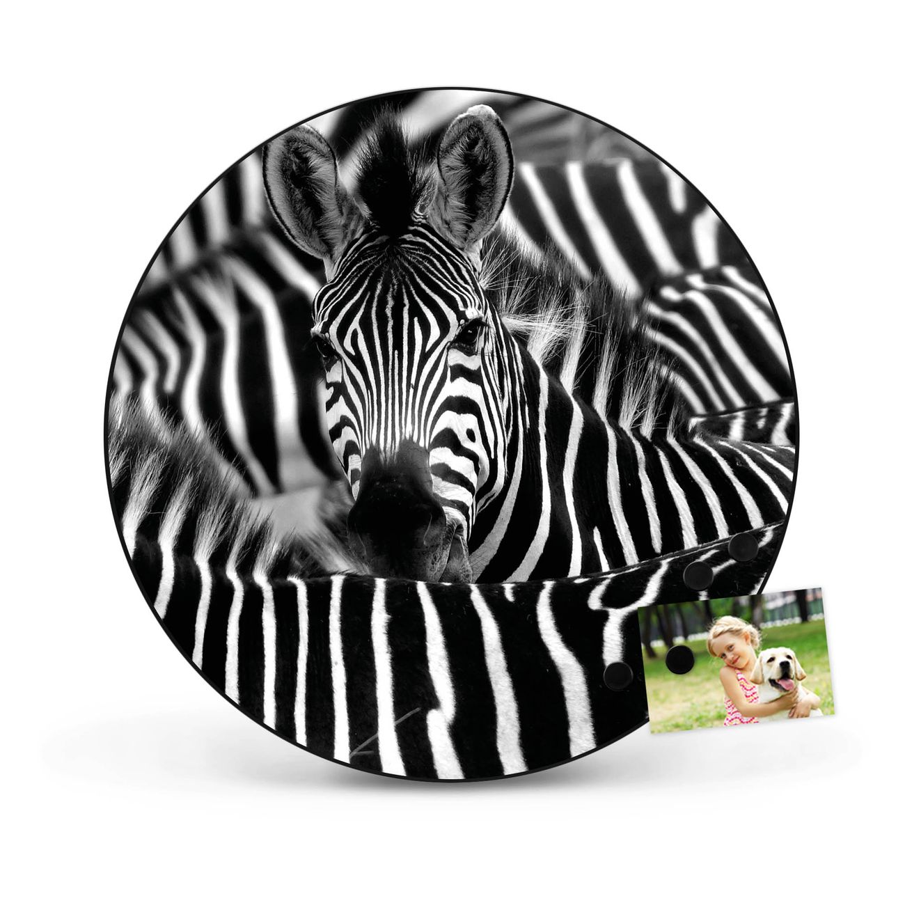 FUNKTION / DESIGN Die banjado Magnettafel mit dem Motiv Motiv Zebras bringt Ordnung in Ihr Zettelchaos. Fotos, Termine, Notizen oder Rezepte lassen Sich hier stilvoll mit Magneten ordnen, Sie behalten alles im Blick. Die Design Magnetwand ist beschreibbar und wieder abwischbar. Mit dieser Pinnwand haben Sie auch ohne Notizen und Magneten ein schönes Dekoelement. Das Format bietet Ihnen ausreichend Platz um alle wichtigen Informationen im Blick zu behalten. DETAILS / NUTZEN Die magnetische Metall Pinnwand besteht aus schwarz lackiertem Stahl. Sie hat einen Durchmesser von 47cm. Es befinden sich an den Seiten zwei vorgefertigte Löcher die eine schnelle und unkomplizierte Anbringung ermöglichen. Das Motiv ist mit einem seidenmatten Laminat versehen und schützt so zusätzlich vor Kratzern. Es halten alle handelsüblichen Magneten daran. Wir sind ein kleines Team aus dem Herzen von Sachsen. Wir fertigen alle Artikel von Hand für Sie an, Sie erhalten keine preiswerte Importware. Auf Wunsch können Sie auch Ihr eigenes Foto auf die Magnettafel aufbringen, schreiben Sie uns an.