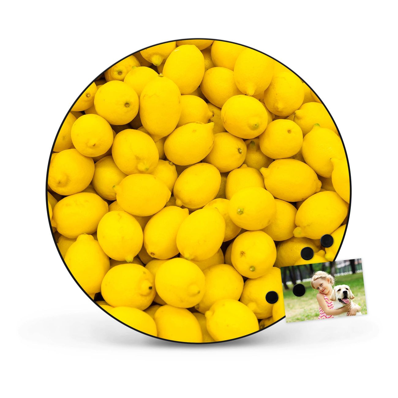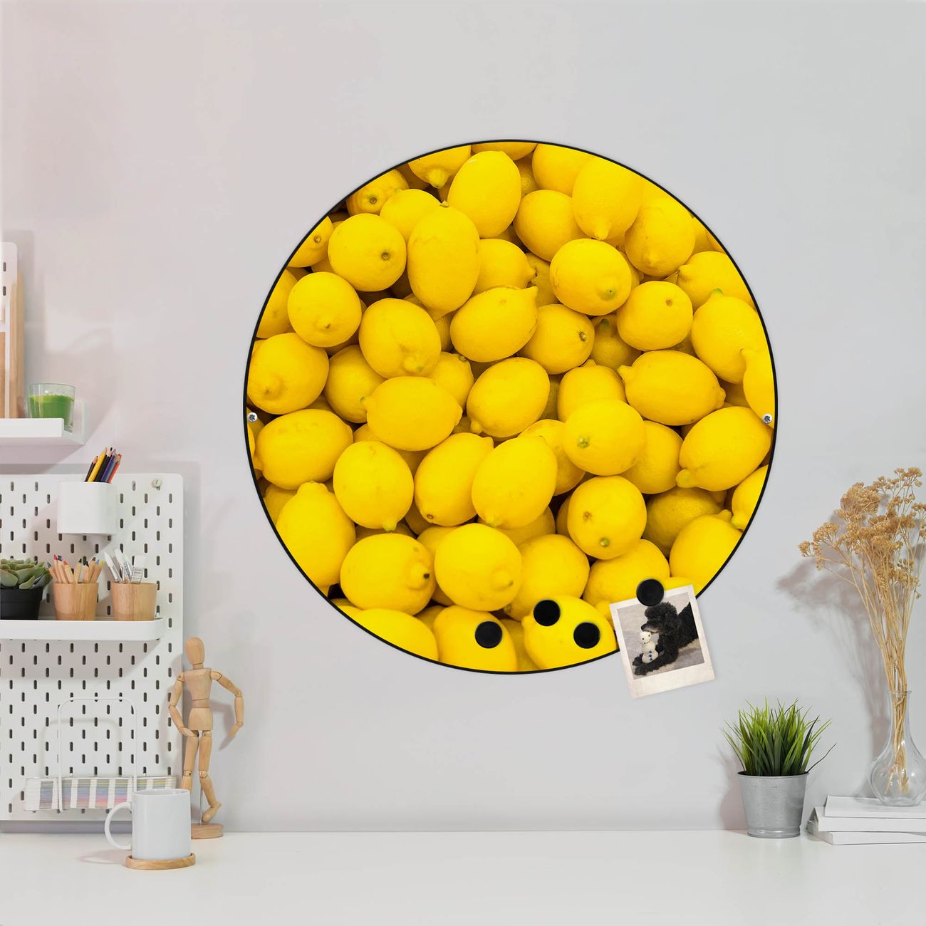 FUNKTION / DESIGN Die banjado Magnettafel mit dem Motiv Motiv Zitronen bringt Ordnung in Ihr Zettelchaos. Fotos, Termine, Notizen oder Rezepte lassen Sich hier stilvoll mit Magneten ordnen, Sie behalten alles im Blick. Die Design Magnetwand ist beschreibbar und wieder abwischbar. Mit dieser Pinnwand haben Sie auch ohne Notizen und Magneten ein schönes Dekoelement. Das Format bietet Ihnen ausreichend Platz um alle wichtigen Informationen im Blick zu behalten. DETAILS / NUTZEN Die magnetische Metall Pinnwand besteht aus schwarz lackiertem Stahl. Sie hat einen Durchmesser von 47cm. Es befinden sich an den Seiten zwei vorgefertigte Löcher die eine schnelle und unkomplizierte Anbringung ermöglichen. Das Motiv ist mit einem seidenmatten Laminat versehen und schützt so zusätzlich vor Kratzern. Es halten alle handelsüblichen Magneten daran. Wir sind ein kleines Team aus dem Herzen von Sachsen. Wir fertigen alle Artikel von Hand für Sie an, Sie erhalten keine preiswerte Importware. Auf Wunsch können Sie auch Ihr eigenes Foto auf die Magnettafel aufbringen, schreiben Sie uns an.