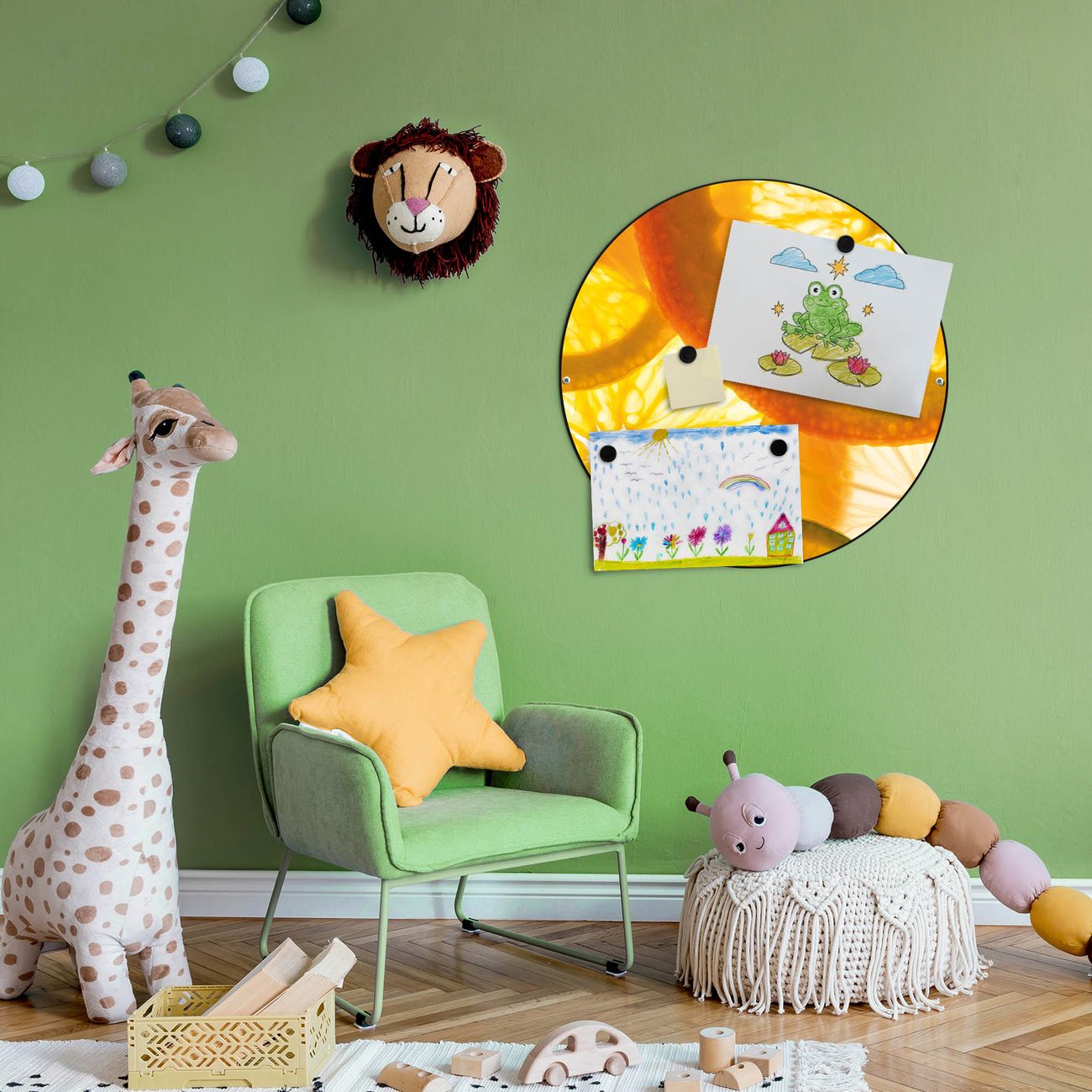 FUNKTION / DESIGN Die banjado Magnettafel mit dem Motiv Motiv Zitrusfrüchte bringt Ordnung in Ihr Zettelchaos. Fotos, Termine, Notizen oder Rezepte lassen Sich hier stilvoll mit Magneten ordnen, Sie behalten alles im Blick. Die Design Magnetwand ist beschreibbar und wieder abwischbar. Mit dieser Pinnwand haben Sie auch ohne Notizen und Magneten ein schönes Dekoelement. Das Format bietet Ihnen ausreichend Platz um alle wichtigen Informationen im Blick zu behalten. DETAILS / NUTZEN Die magnetische Metall Pinnwand besteht aus schwarz lackiertem Stahl. Sie hat einen Durchmesser von 47cm. Es befinden sich an den Seiten zwei vorgefertigte Löcher die eine schnelle und unkomplizierte Anbringung ermöglichen. Das Motiv ist mit einem seidenmatten Laminat versehen und schützt so zusätzlich vor Kratzern. Es halten alle handelsüblichen Magneten daran. Wir sind ein kleines Team aus dem Herzen von Sachsen. Wir fertigen alle Artikel von Hand für Sie an, Sie erhalten keine preiswerte Importware. Auf Wunsch können Sie auch Ihr eigenes Foto auf die Magnettafel aufbringen, schreiben Sie uns an.