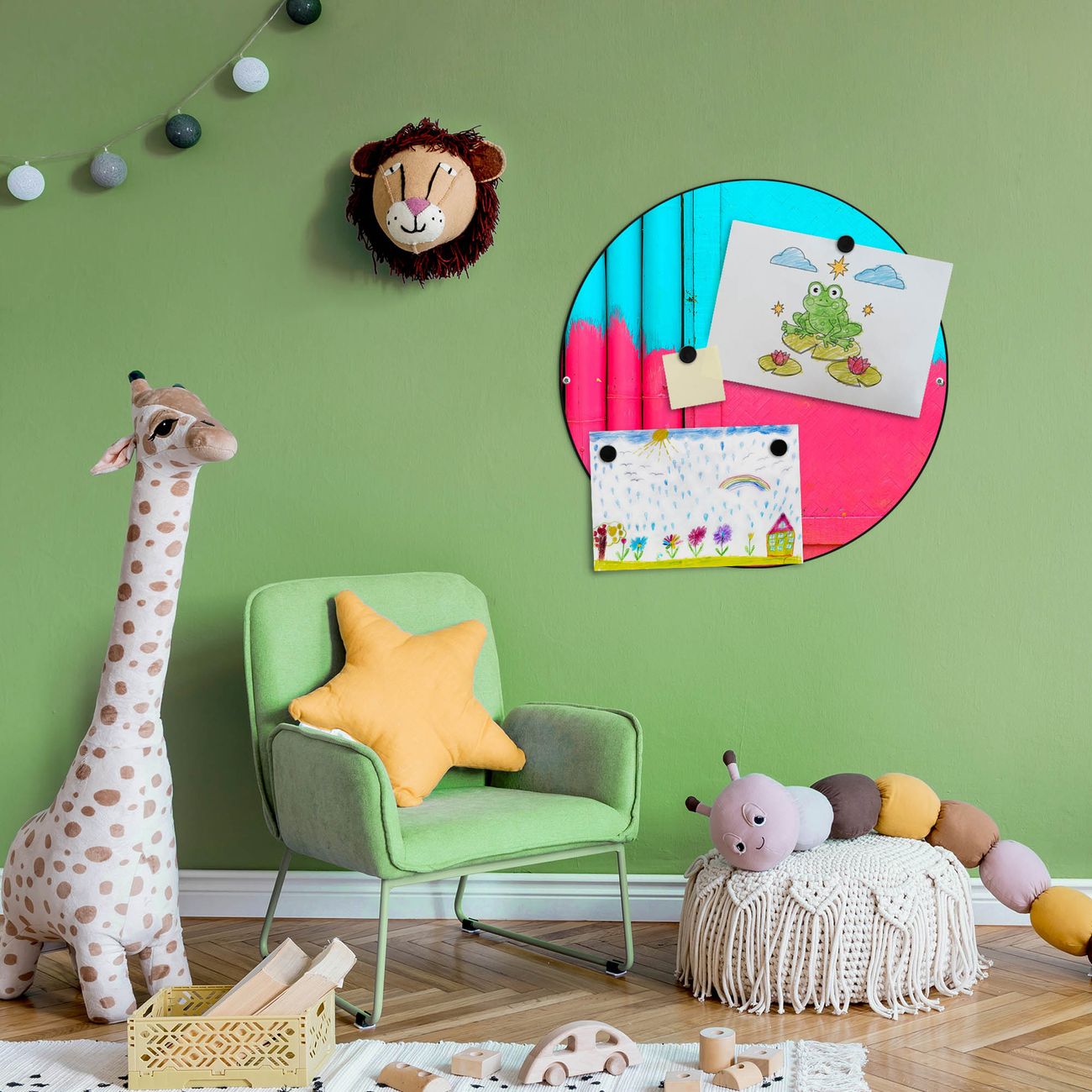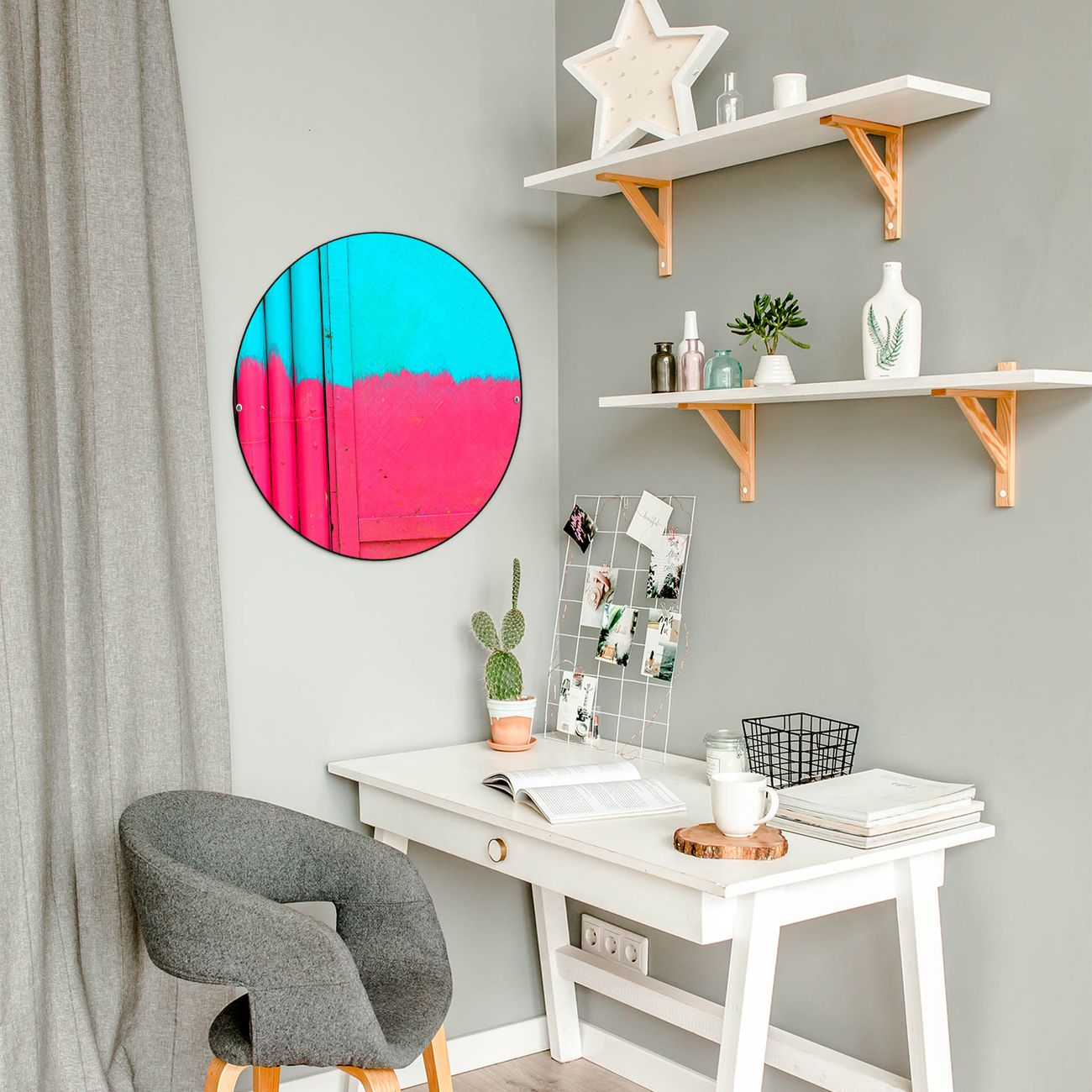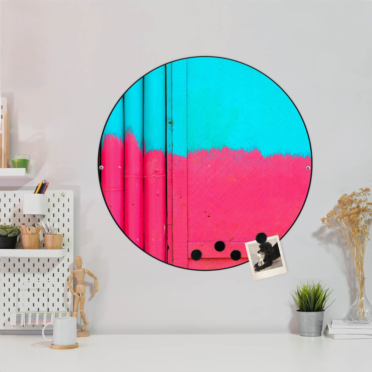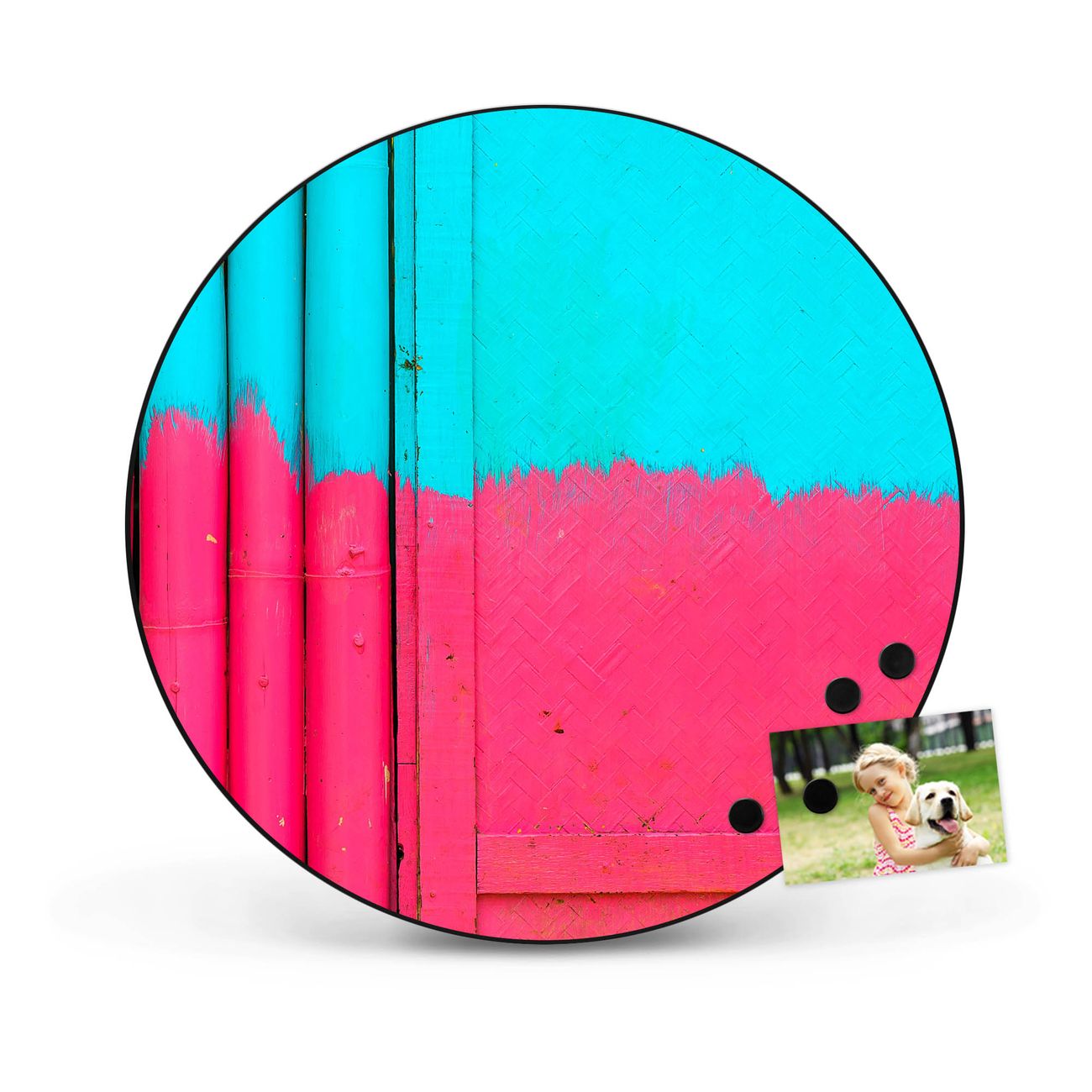 FUNKTION / DESIGN Die banjado Magnettafel mit dem Motiv Motiv Zwei Farben bringt Ordnung in Ihr Zettelchaos. Fotos, Termine, Notizen oder Rezepte lassen Sich hier stilvoll mit Magneten ordnen, Sie behalten alles im Blick. Die Design Magnetwand ist beschreibbar und wieder abwischbar. Mit dieser Pinnwand haben Sie auch ohne Notizen und Magneten ein schönes Dekoelement. Das Format bietet Ihnen ausreichend Platz um alle wichtigen Informationen im Blick zu behalten. DETAILS / NUTZEN Die magnetische Metall Pinnwand besteht aus schwarz lackiertem Stahl. Sie hat einen Durchmesser von 47cm. Es befinden sich an den Seiten zwei vorgefertigte Löcher die eine schnelle und unkomplizierte Anbringung ermöglichen. Das Motiv ist mit einem seidenmatten Laminat versehen und schützt so zusätzlich vor Kratzern. Es halten alle handelsüblichen Magneten daran. Wir sind ein kleines Team aus dem Herzen von Sachsen. Wir fertigen alle Artikel von Hand für Sie an, Sie erhalten keine preiswerte Importware. Auf Wunsch können Sie auch Ihr eigenes Foto auf die Magnettafel aufbringen, schreiben Sie uns an.