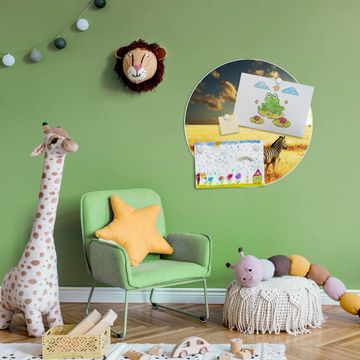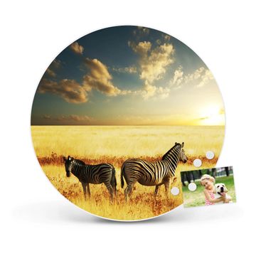 FUNKTION / DESIGN Die banjado Magnettafel mit dem Motiv Motiv Zwei Zebras bringt Ordnung in Ihr Zettelchaos. Fotos, Termine, Notizen oder Rezepte lassen Sich hier stilvoll mit Magneten ordnen, Sie behalten alles im Blick. Die Design Magnetwand ist beschreibbar und wieder abwischbar. Mit dieser Pinnwand haben Sie auch ohne Notizen und Magneten ein schönes Dekoelement. Das Format bietet Ihnen ausreichend Platz um alle wichtigen Informationen im Blick zu behalten. DETAILS / NUTZEN Die magnetische Metall Pinnwand besteht aus weiß lackiertem Stahl. Sie hat einen Durchmesser von 47cm. Es befinden sich an den Seiten zwei vorgefertigte Löcher die eine schnelle und unkomplizierte Anbringung ermöglichen. Das Motiv ist mit einem seidenmatten Laminat versehen und schützt so zusätzlich vor Kratzern. Es halten alle handelsüblichen Magneten daran. Wir sind ein kleines Team aus dem Herzen von Sachsen. Wir fertigen alle Artikel von Hand für Sie an, Sie erhalten keine preiswerte Importware. Auf Wunsch können Sie auch Ihr eigenes Foto auf die Magnettafel aufbringen, schreiben Sie uns an.