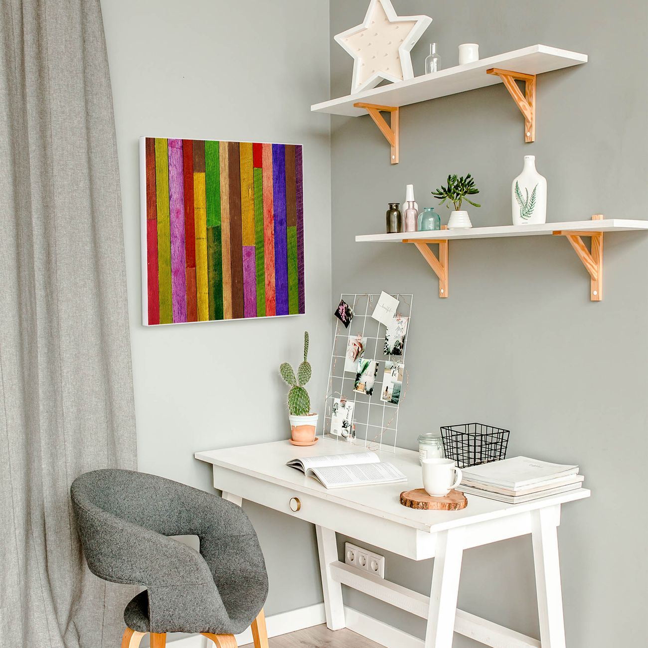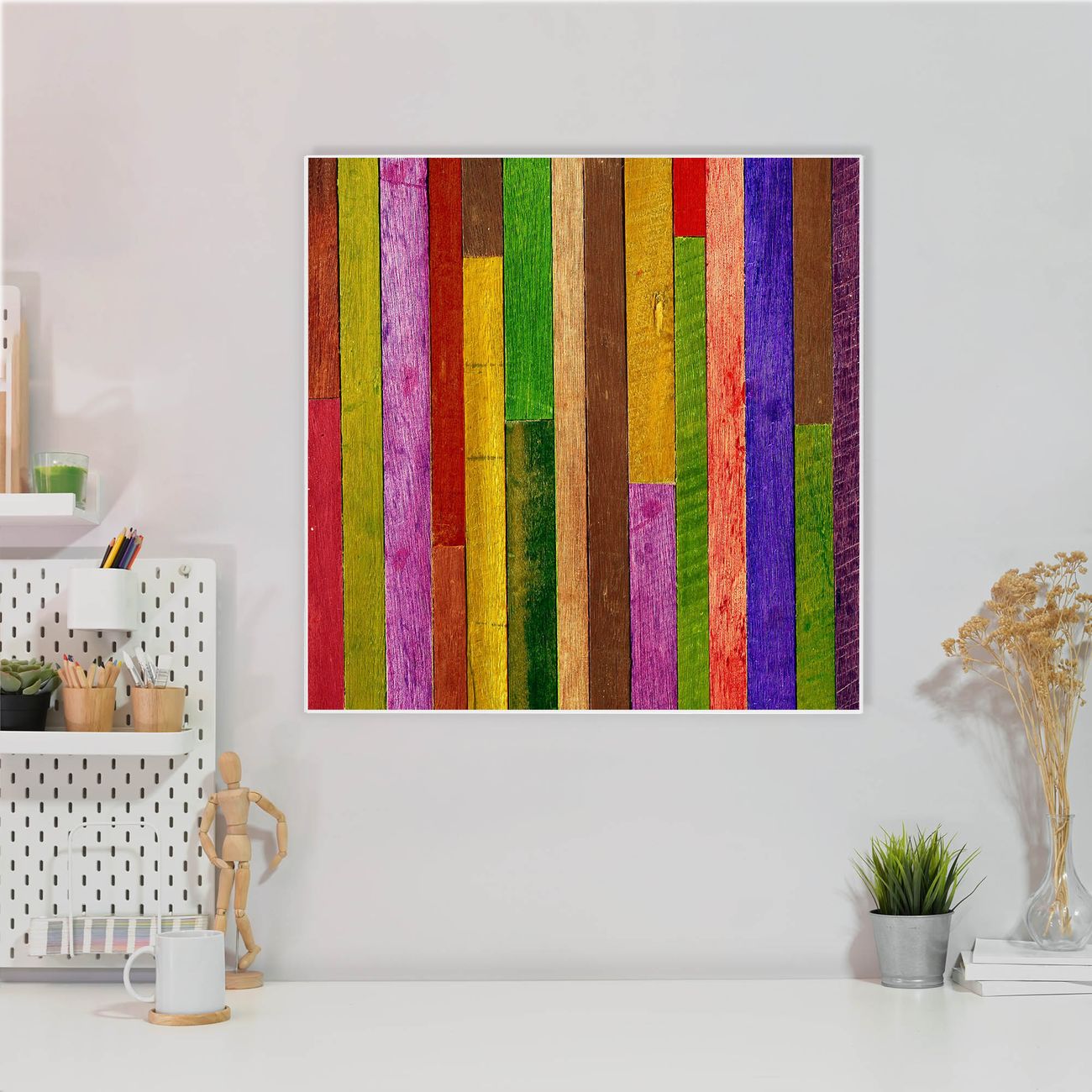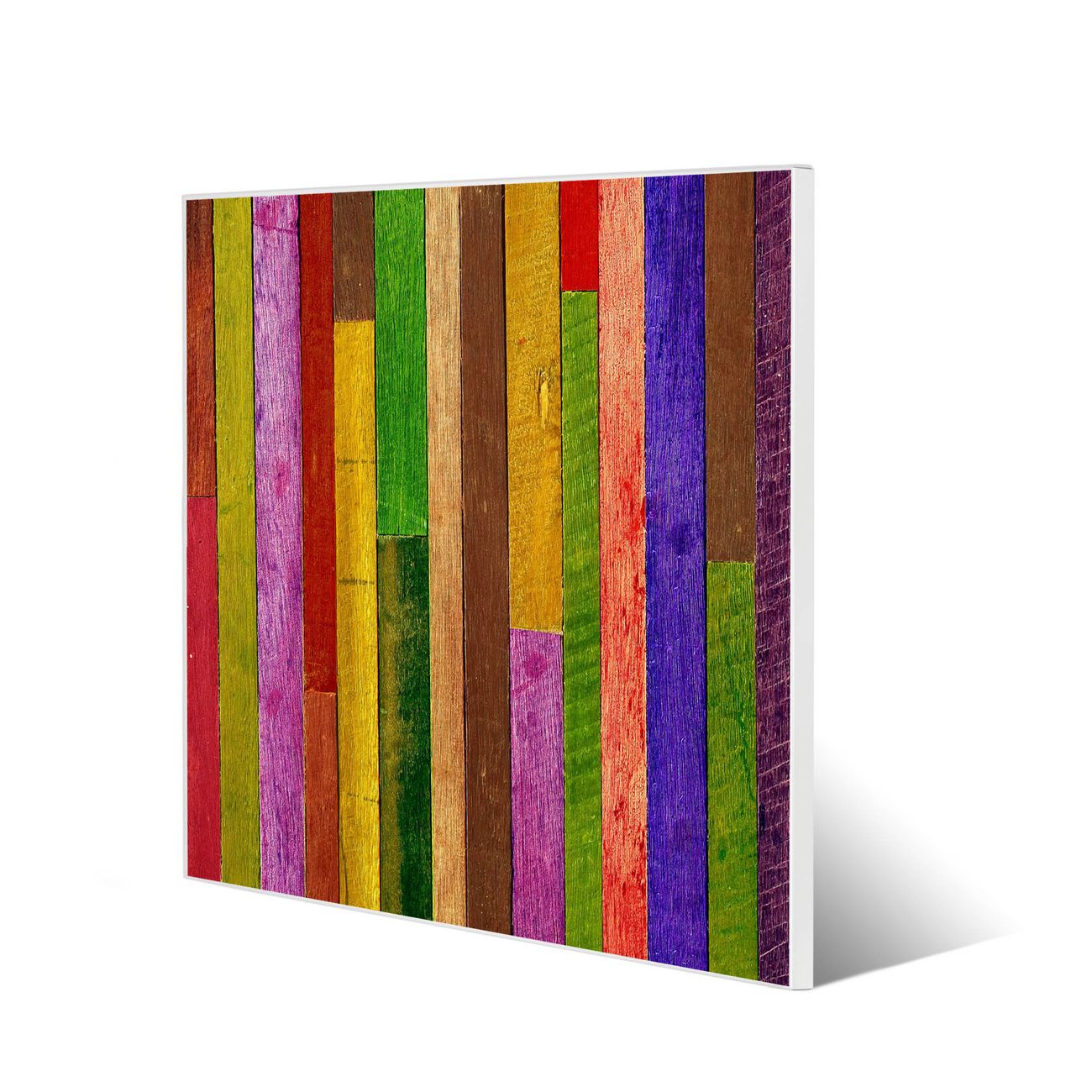 Motiv Holz Collage Bunt Nr. 10863 Größe: 50x50x2cm BxHxT Gewicht: ca. 1,5 kg Material: Stahl weiß lackiert, Premiumfolie mit Schutzlaminat Magnete: für Dekomagnete geeignet beschreibbar: Nein Format: Quadratisch Zubehör: 4 Magnete, Schrauben und Dübel