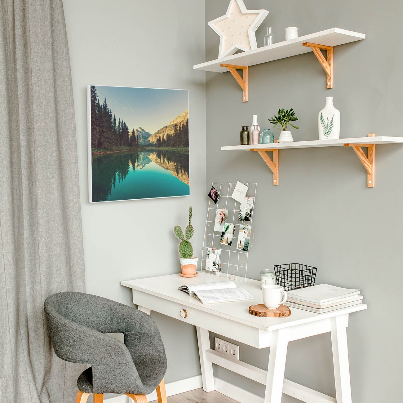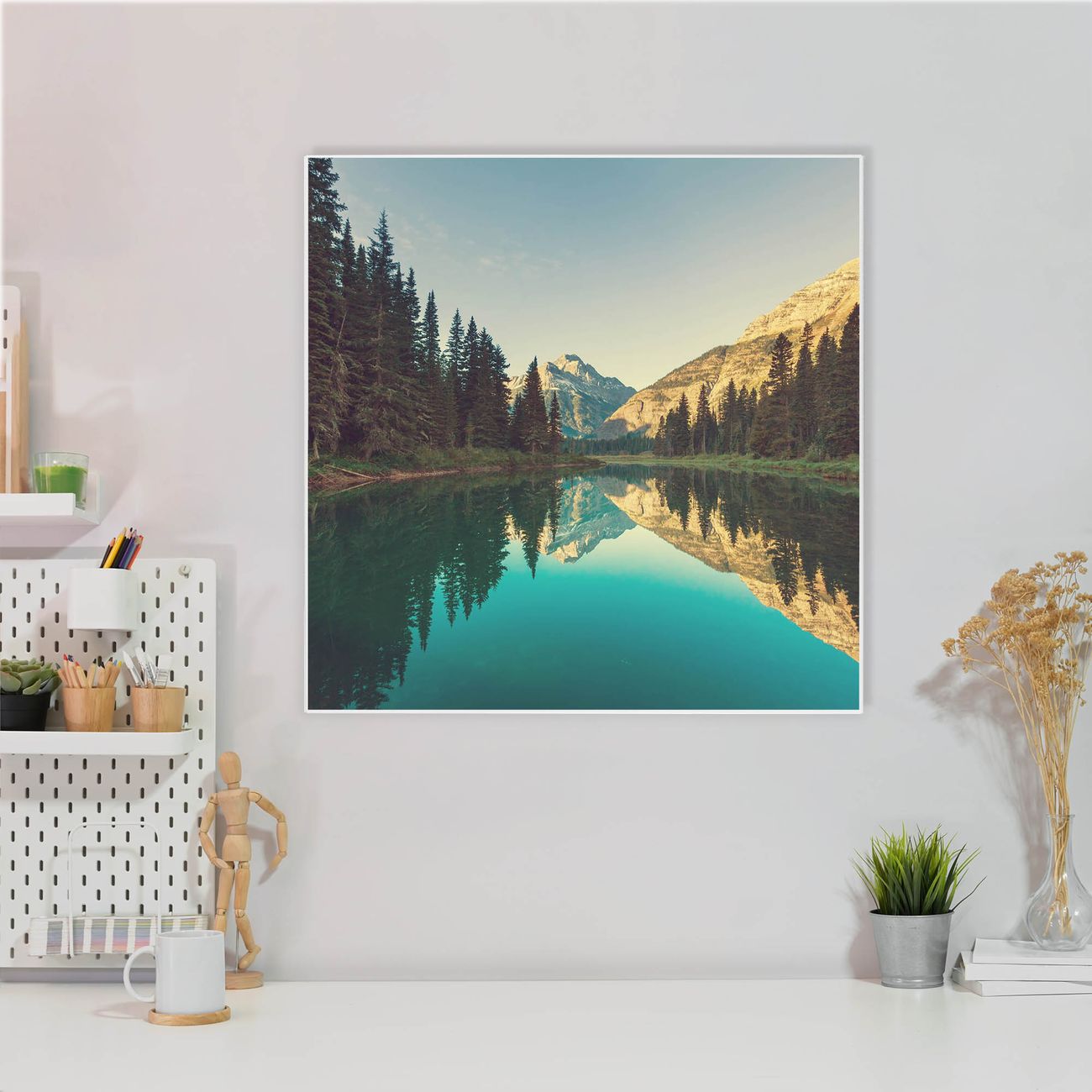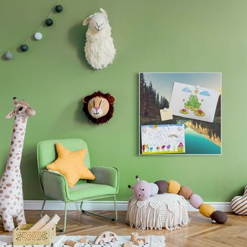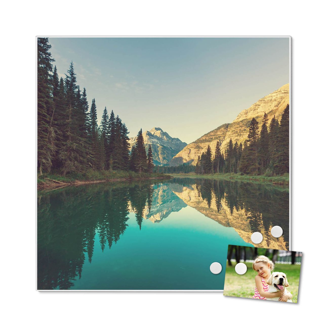 Farbe  Bergsee Nr. 12042 Größe  50x50x2cm BxHxT Gewicht  ca. 1,5 kg Material  Stahl weiß lackiert, Premiumfolie mit Schutzlaminat Magnete  für Deko- und Neodymmagnete geeignet beschreibbar  Nein Format  Quadratisch Zubehör  4 Magnete, Schrauben und Dübel