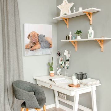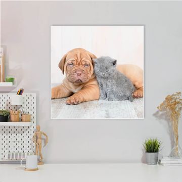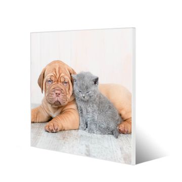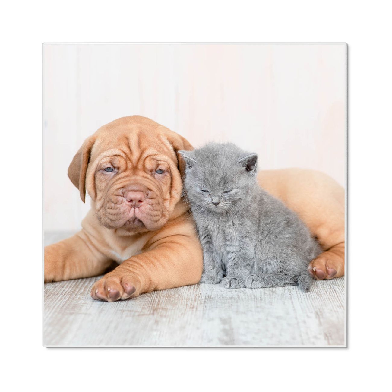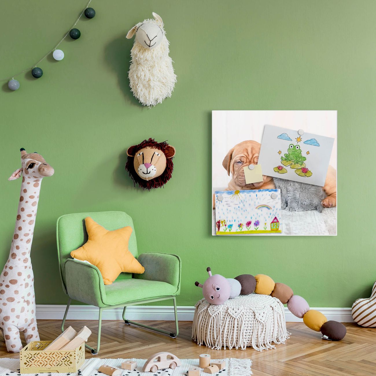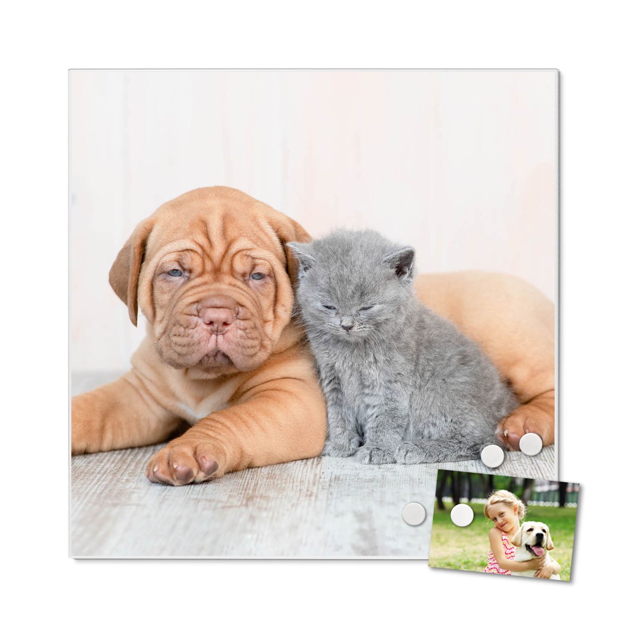 Motiv Hund und Katze Nr. 12031 Größe: 50x50x2cm BxHxT Gewicht: ca. 1,5 kg Material: Stahl weiß lackiert, Premiumfolie mit Schutzlaminat Magnete: für Dekomagnete geeignet beschreibbar: Nein Format: Quadratisch Zubehör: 4 Magnete, Schrauben und Dübel